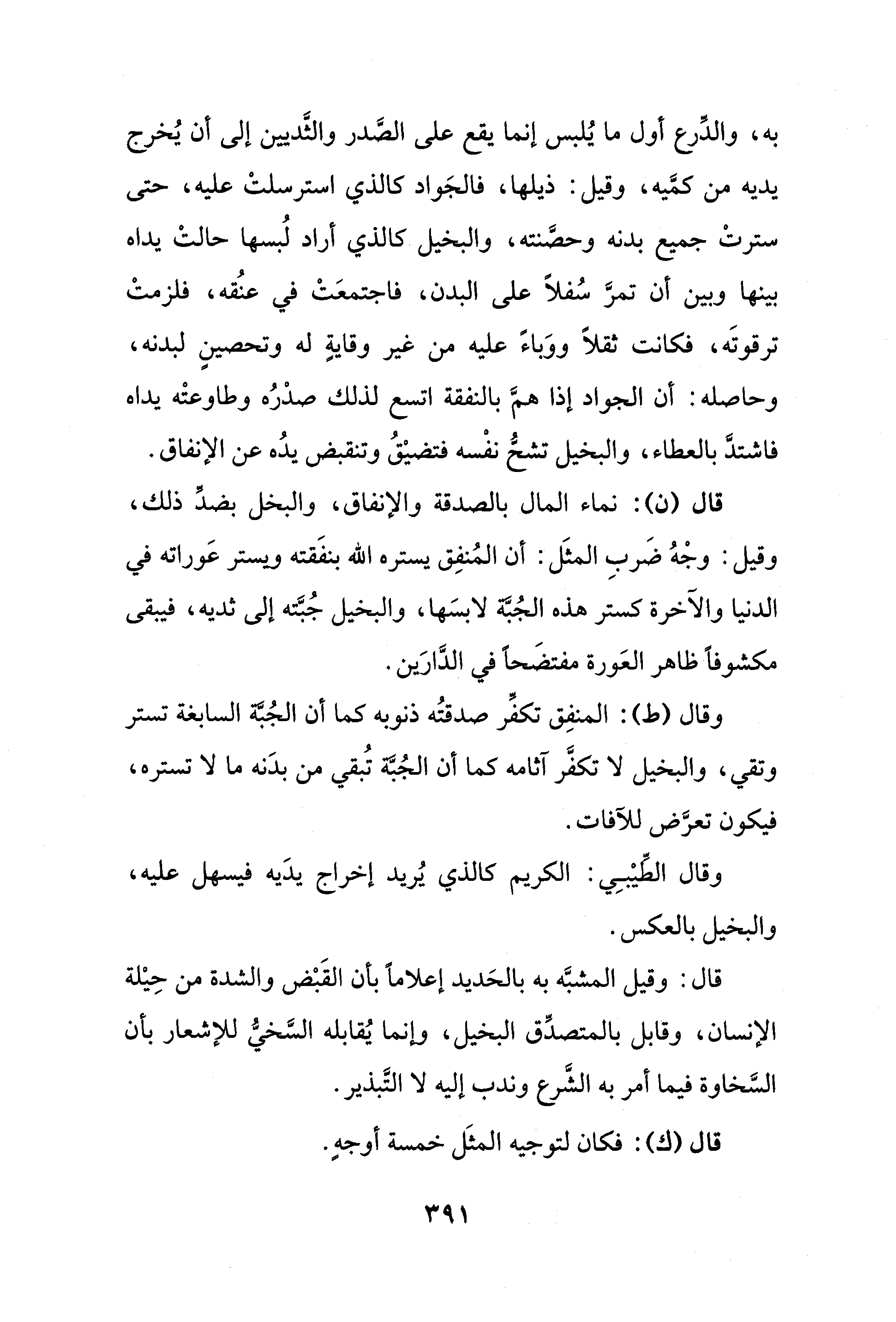 قال: وقيل المشبَّه به بالحَديد إعلامًا بأن القَبْض والشدة من حِيْلة الإنسان، وقابل بالمتصدِّق البخيل، وإنما يُقابله السَّخيُّ للإشعار بأن السَّخاوة فيما أمر به الشَّرع وندب إليه لا التَّبذير.