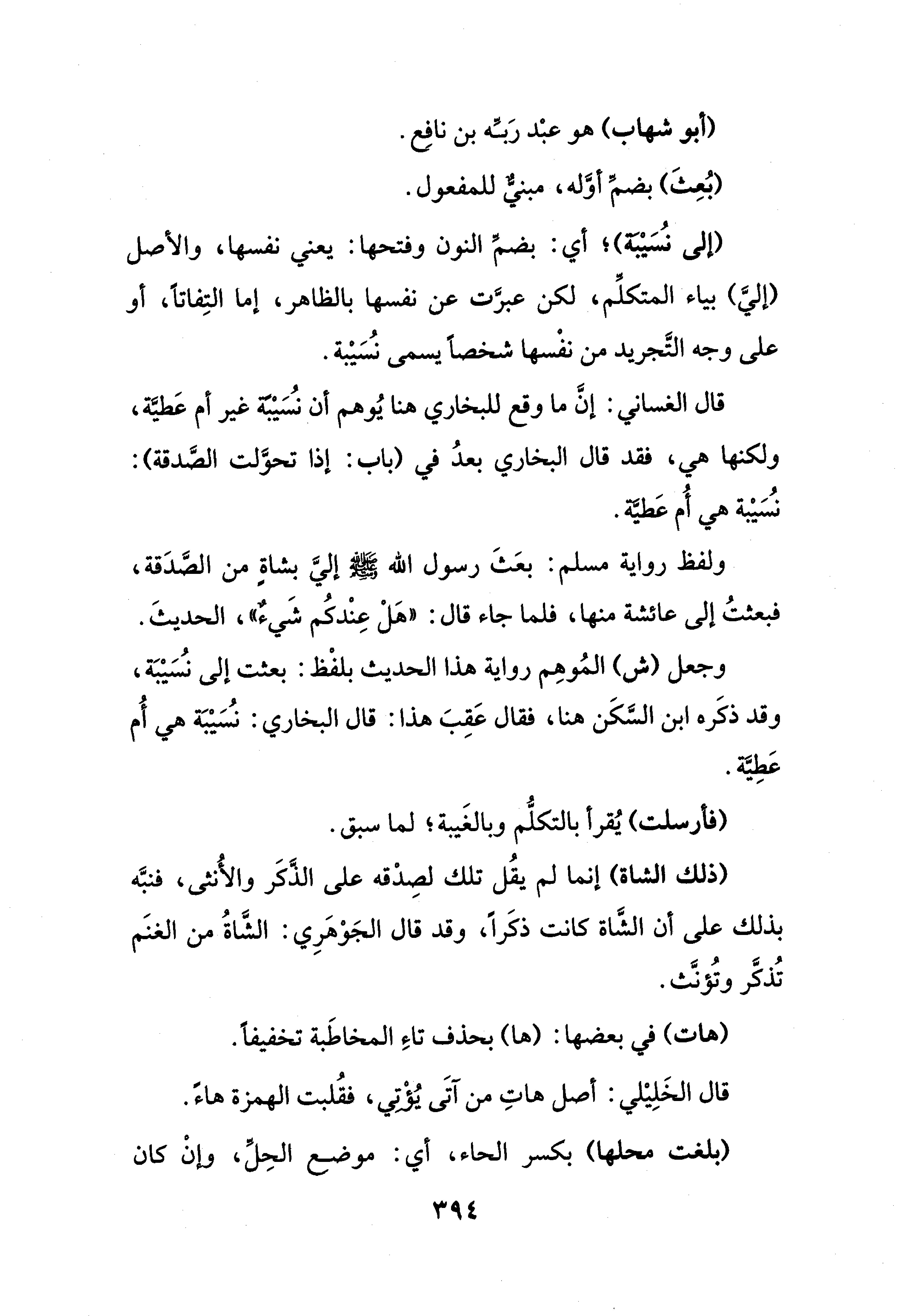 وجعل (ش) المُوهِم رواية هذا الحديث بلفْظ: بعثت إلى نُسَيْبَة، وقد ذكَره ابن السَّكَن هنا، فقال عَقِبَ هذا: قال البخاري: نُسَيْبَة هي أُم عَطِيَّة.