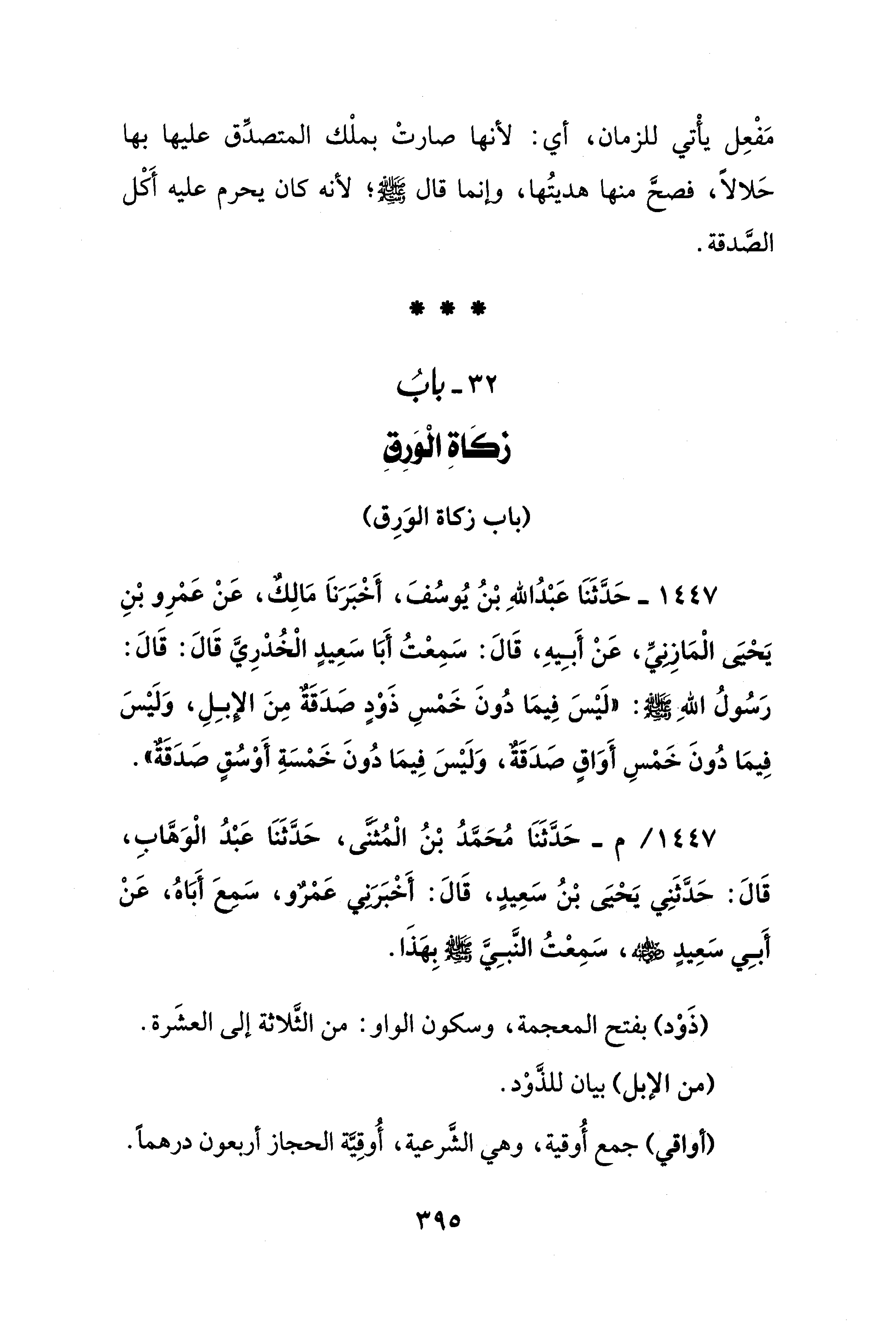 1447 - حَدَّثَنَا عَبْدُ اللهِ بْنُ يُوسُفَ، أَخْبَرَناَ مَالِكٌ، عَنْ عَمْرِو بْنِ يَحْيَى الْمَازِنِيِّ، عَنْ أَبِيهِ، قَالَ: سَمِعْتُ أَبَا سَعِيدٍ الْخُدْرِيَّ قَالَ: قَالَ: رَسُولُ اللهِ - صلى الله عليه وسلم -: "لَيْسَ فِيمَا دُونَ خَمْسِ ذَوْدٍ صَدَقَةٌ مِنَ الإِبِلِ، وَلَيْسَ فِيمَا دُونَ خَمْسِ أَوَاقٍ صَدَقَةٌ، وَلَيْسَ فِيمَا دُونَ خَمْسَةِ أَوْسُقٍ صَدَقَةٌ".