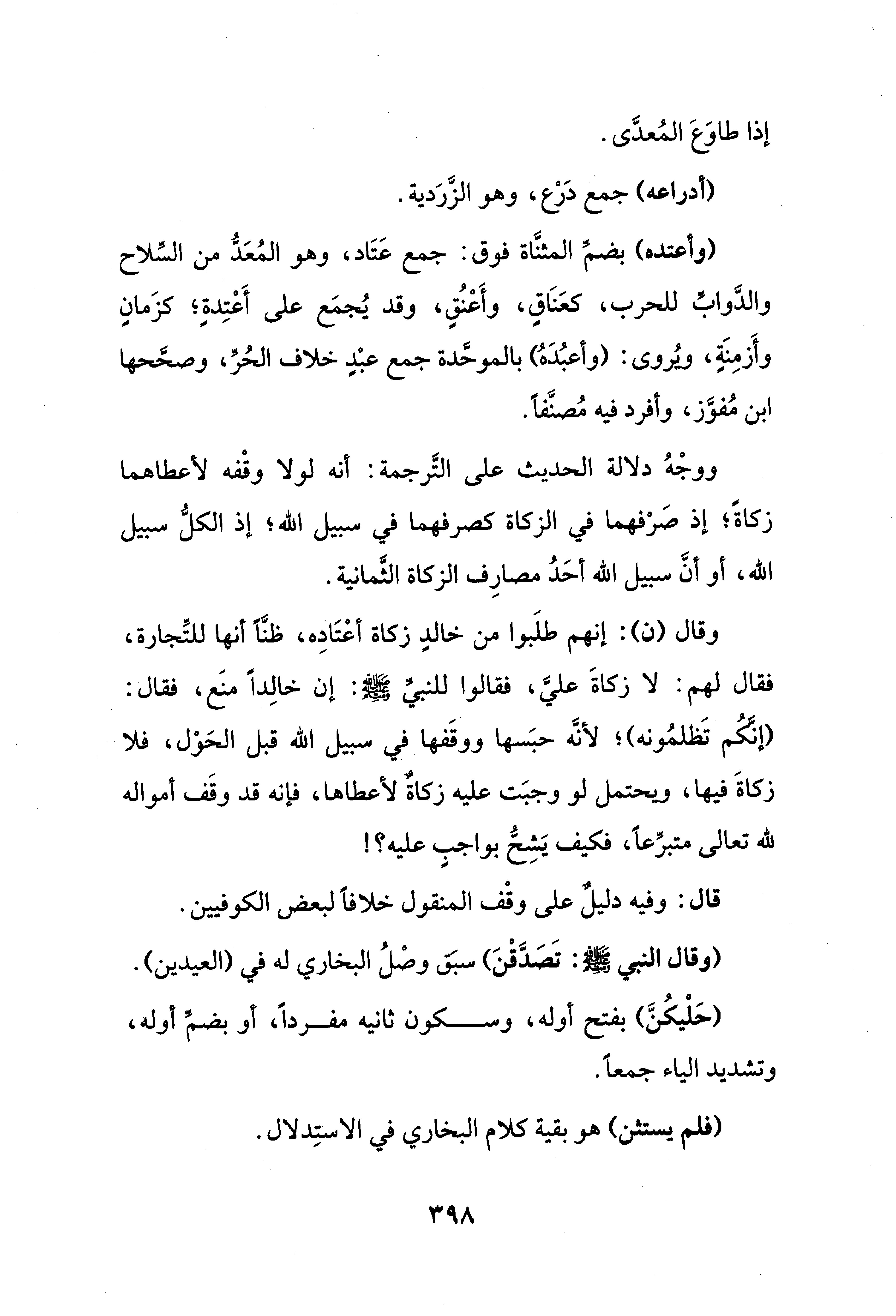 وقال (ن): إنهم طلَبوا من خالدٍ زكاة أعْتَادِه، ظنًّا أنها للتِّجارة، فقال لهم: لا زكاةَ عليَّ، فقالوا للنبيِّ - صلى الله عليه وسلم -: إن خالِدًا منَع، فقال: (إنَّكُم تَظلمُونه)؛ لأنَّه حبَسها ووقَفها في سبيل الله قبل الحَوْل، فلا زكاةَ فيها، ويحتمل لو وجبَت عليه زكاةٌ لأعطاها، فإنه قد وقَف أمواله لله تعالى متبرِّعًا، فكيف يَشِحُّ بواجبٍ عليه؟!