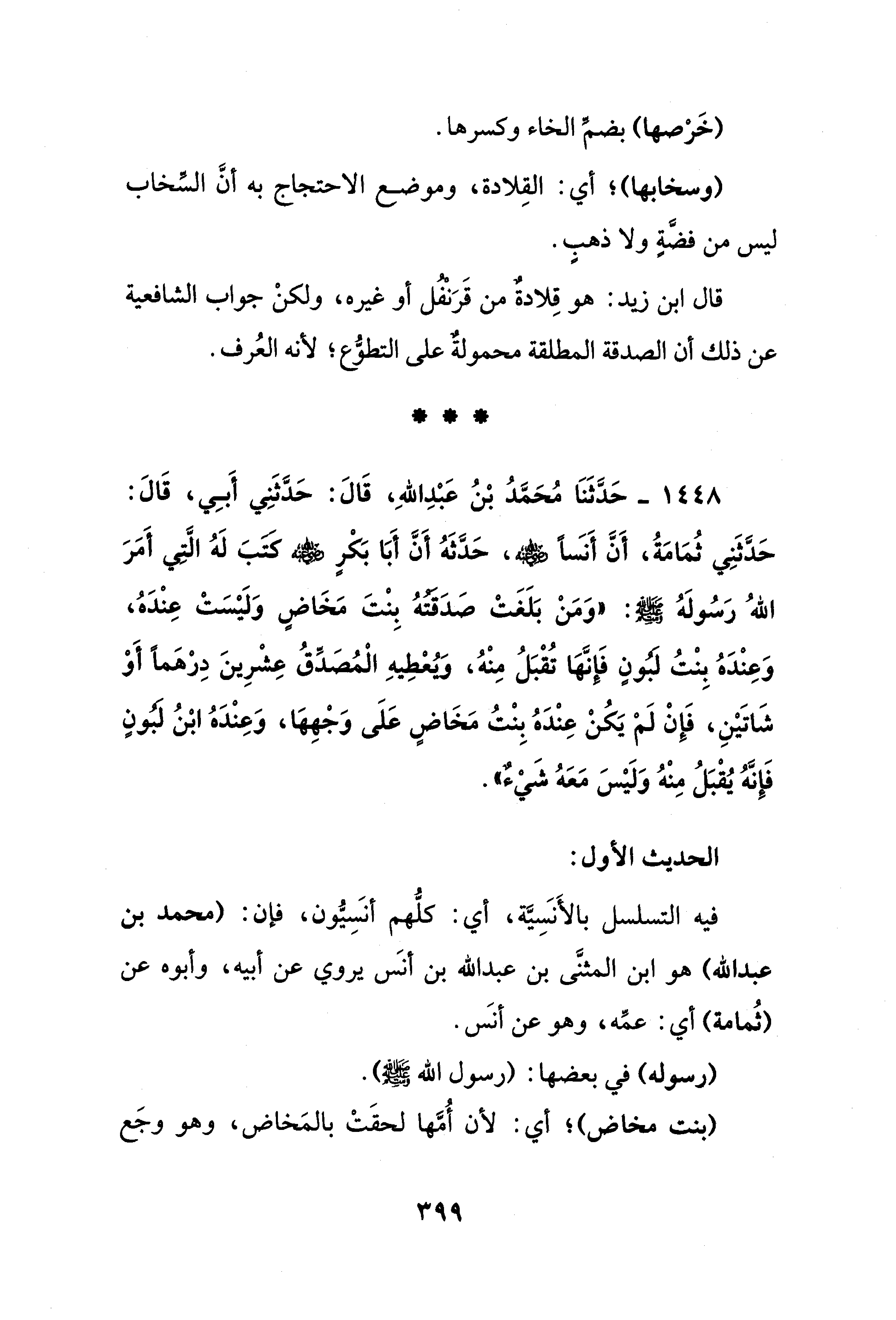 1448 - حَدَّثَنَا مُحَمَّدُ بْنُ عَبْدِ اللهِ، قَالَ: حَدَّثَنِي أَبِي، قَالَ: حَدَّثَنِي ثُمَامَةُ، أَنَّ أَنَسًا - رضي الله عنه -، حَدَّثَهُ أَنَّ أَبَا بَكْرٍ - رضي الله عنه - كَتَبَ لَهُ الَّتِي أَمَرَ اللهُ رَسُولَهُ - صلى الله عليه وسلم -: "وَمَنْ بَلَغَتْ صَدَقَتُهُ بِنْتَ مَخَاضٍ وَلَيْسَتْ عِنْدَهُ، وَعِنْدَهُ بِنْتُ لَبُونٍ فَإِنَّهَا تُقْبَلُ مِنْهُ، ويُعْطِيهِ الْمُصَدِّقُ عِشْرِينَ دِرْهَمًا أَوْ شَاتَيْنِ، فَإِنْ لَمْ يَكُنْ عِنْدَهُ بِنْتُ مَخَاضٍ عَلَى وَجْهِهَا، وَعِنْدَهُ ابْنُ لَبُونٍ فَإِنَّهُ يُقْبَلُ مِنْهُ وَلَيْسَ مَعَهُ شَيْءٌ".