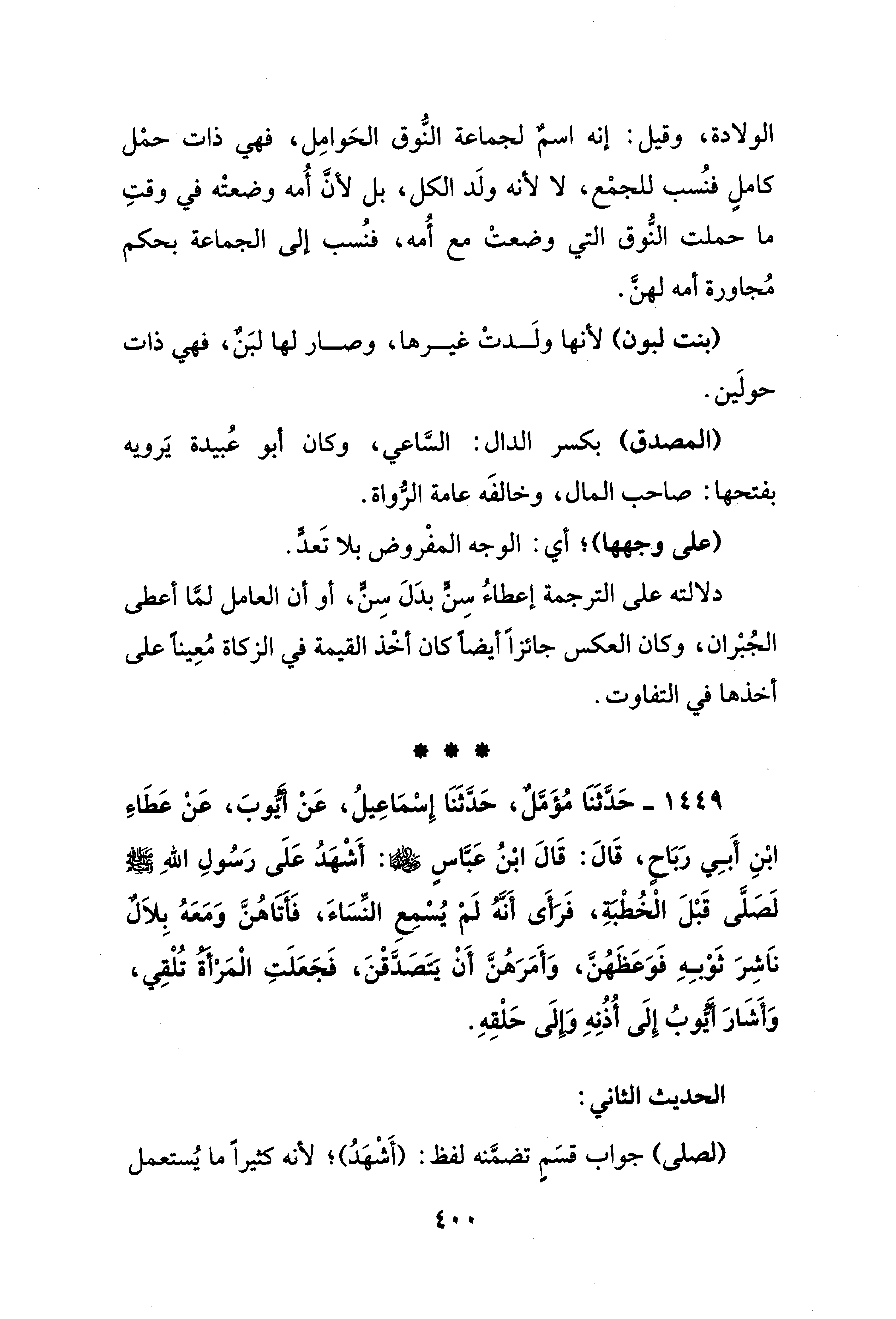1449 - حَدَّثَنَا مُؤَمَّلٌ، حَدَّثَنَا إِسْمَاعِيلُ، عَنْ أَيُّوبَ، عَنْ عَطَاءِ ابْنِ أَبِي رَبَاحٍ، قَالَ: قَالَ ابْنُ عَبَّاسٍ: أَشْهَدُ عَلَى رَسُولِ اللهِ - صلى الله عليه وسلم - لَصَلَّى قَبْلَ الْخُطْبَةِ، فَرَأَى أَنَّهُ لَمْ يُسْمِعِ النِّسَاءَ، فَأَتَاهُنَّ وَمَعَهُ بِلاَلٌ ناَشِرَ ثَوْبِهِ فَوَعَظَهُنَّ، وَأَمَرَهُنَّ أَنْ يَتَصَدَّقْنَ، فَجَعَلَتِ الْمَرْأَةُ تُلْقِي، وَأَشَارَ أَيُّوبُ إِلَى أُذُنِهِ وَإِلَى حَلْقِهِ.
