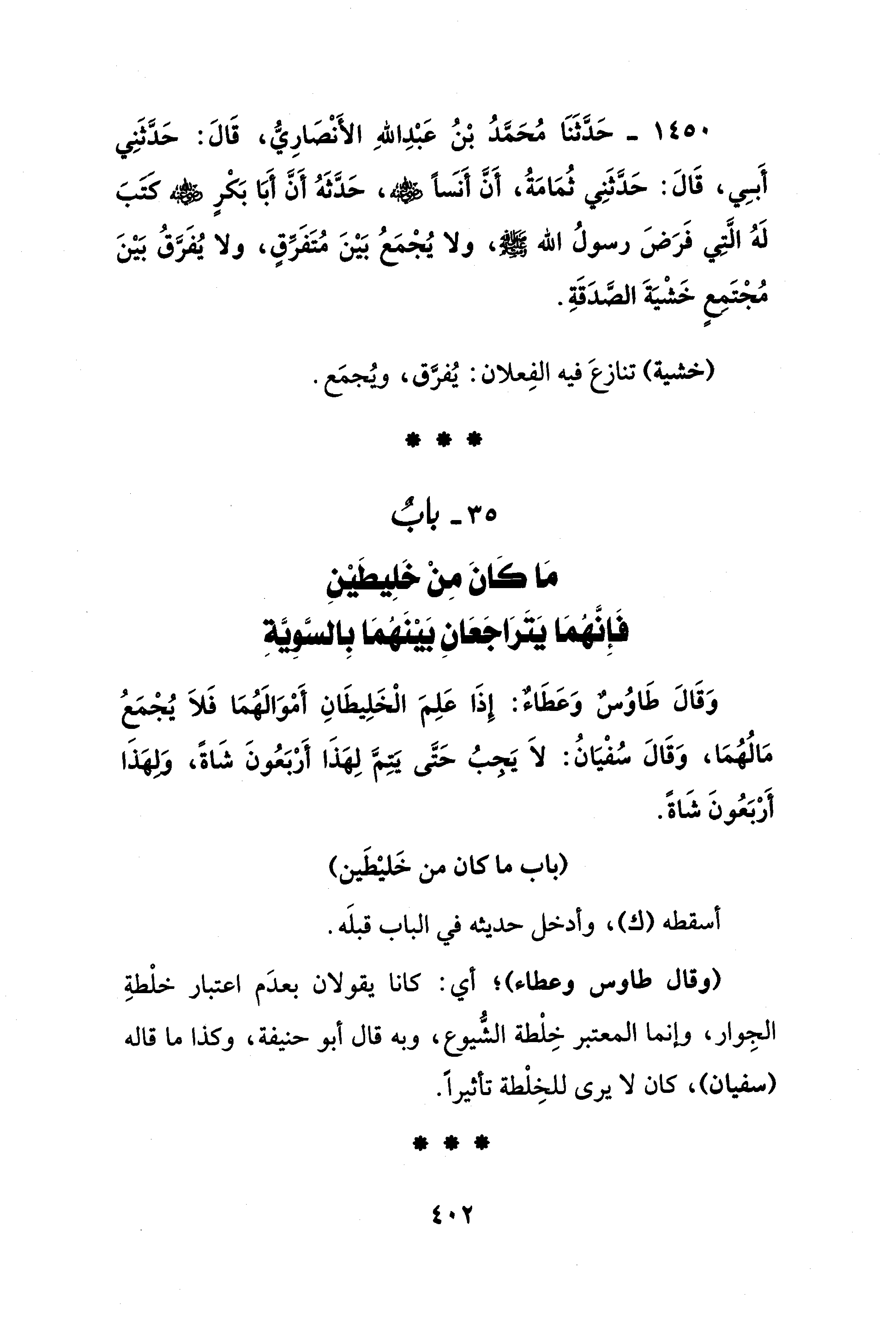1450 - حَدَّثَنَا مُحَمَّدُ بْنُ عَبْدِ اللهِ الأَنْصَارِيُّ، قَالَ: حَدَّثَنِي أَبِي، قَالَ: حَدَّثَنِي ثُمَامَةُ، أَنَّ أَنَسًا - رضي الله عنه -، حَدَّثَهُ أَنَّ أَبَا بَكْرٍ - رضي الله عنه - كَتَبَ لَهُ الَّتِي فَرَضَ رسولُ الله - صلى الله عليه وسلم -، ولا يُجْمَعُ بَيْنَ مُتَفَرِّقٍ، ولا يُفَرَّقُ بَيْنَ مُجْتَمِعٍ خَشْيَةَ الصَّدَقَةِ.