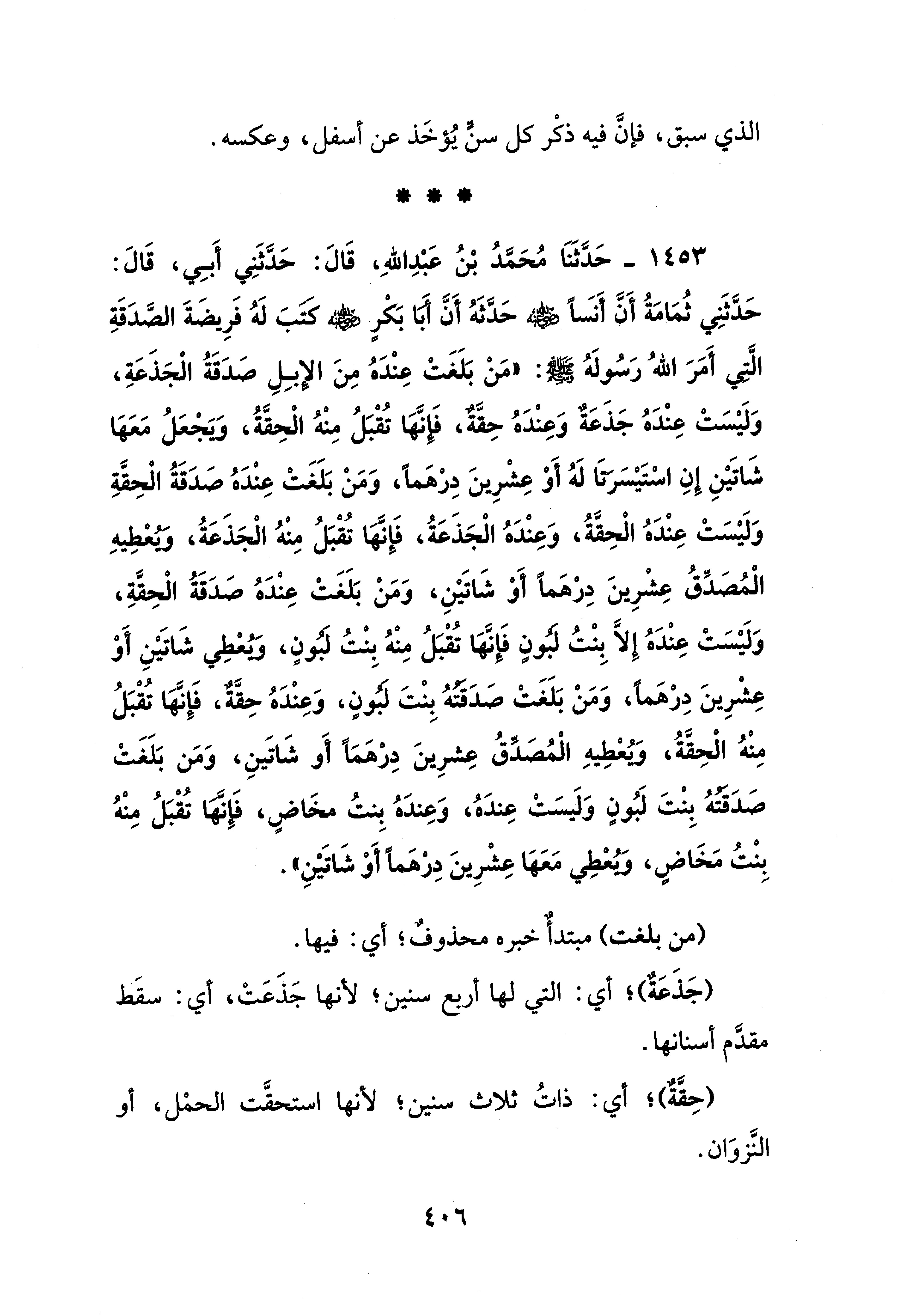 1453 - حَدَّثَنَا مُحَمَّدُ بْنُ عَبْدِ اللهِ، قَالَ: حَدَّثَنِي أَبِي، قَالَ: حَدَّثَنِي ثُمَامَةُ أَنَّ أَنَسًا - رضي الله عنه - حَدَّثَهُ أَنَّ أَبَا بَكْرٍ - رضي الله عنه - كَتَبَ لَهُ فَرِيضَةَ الصَّدَقَةِ الَّتِي أَمَرَ اللهُ رَسُولَهُ - صلى الله عليه وسلم -: "مَنْ بَلَغَتْ عِنْدَهُ مِنَ الإِبِلِ صَدَقَةُ الْجَذَعَةِ، وَلَيْسَتْ عِنْدَهُ جَذَعَةٌ وَعِنْدَهُ حِقَّةٌ، فَإِنَّهَا تُقْبَلُ مِنْهُ الْحِقَّةُ، وَيَجْعَلُ مَعَهَا شَاتَيْنِ إِنِ اسْتَيْسَرَتَا لَهُ أَوْ عِشْرِينَ دِرْهَمًا، وَمَنْ بَلَغَتْ عِنْدَهُ صَدَقَةُ الْحِقَّةِ وَلَيْسَتْ عِنْدَهُ الْحِقَّةُ، وَعِنْدَهُ الْجَذَعَةُ، فَإِنَّهَا تُقْبَلُ مِنْهُ الْجَذَعَةُ، وَيُعْطِيهِ الْمُصَدِّقُ عِشْرِينَ دِرْهَمًا أَوْ شَاتَيْنِ، وَمَنْ بَلَغَتْ عِنْدَهُ صَدَقَةُ الْحِقَّةِ، وَلَيْسَتْ عِنْدَهُ إِلَّا بِنْتُ لَبُونٍ فَإِنَّهَا تُقْبَلُ مِنْهُ بِنْتُ لَبُونٍ، وَيُعْطِي شَاتَيْنِ أَوْ عِشْرِينَ دِرْهَمًا، وَمَنْ بَلَغَتْ صَدَقَتُهُ بِنْتَ لَبُونٍ، وَعِنْدَهُ حِقَّةٌ، فَإِنَّهَا تُقْبَلُ مِنْهُ الْحِقَّةُ، وَيُعْطِيهِ الْمُصَدِّقُ عِشرِينَ دِرْهَمًا أَو شَاتَينِ، وَمَن بَلَغَتْ صَدَقَتُهُ بِنْتَ لَبُونٍ وَلَيسَتْ عِندَهُ، وَعِندَهُ بِنتُ مخَاضٍ، فَإِنَّهَا تُقْبَلُ مِنْهُ بِنْتُ مَخَاضٍ، ويُعْطِي مَعَهَا عِشْرِينَ دِرْهَمًا أَوْ شَاتَيْنِ".