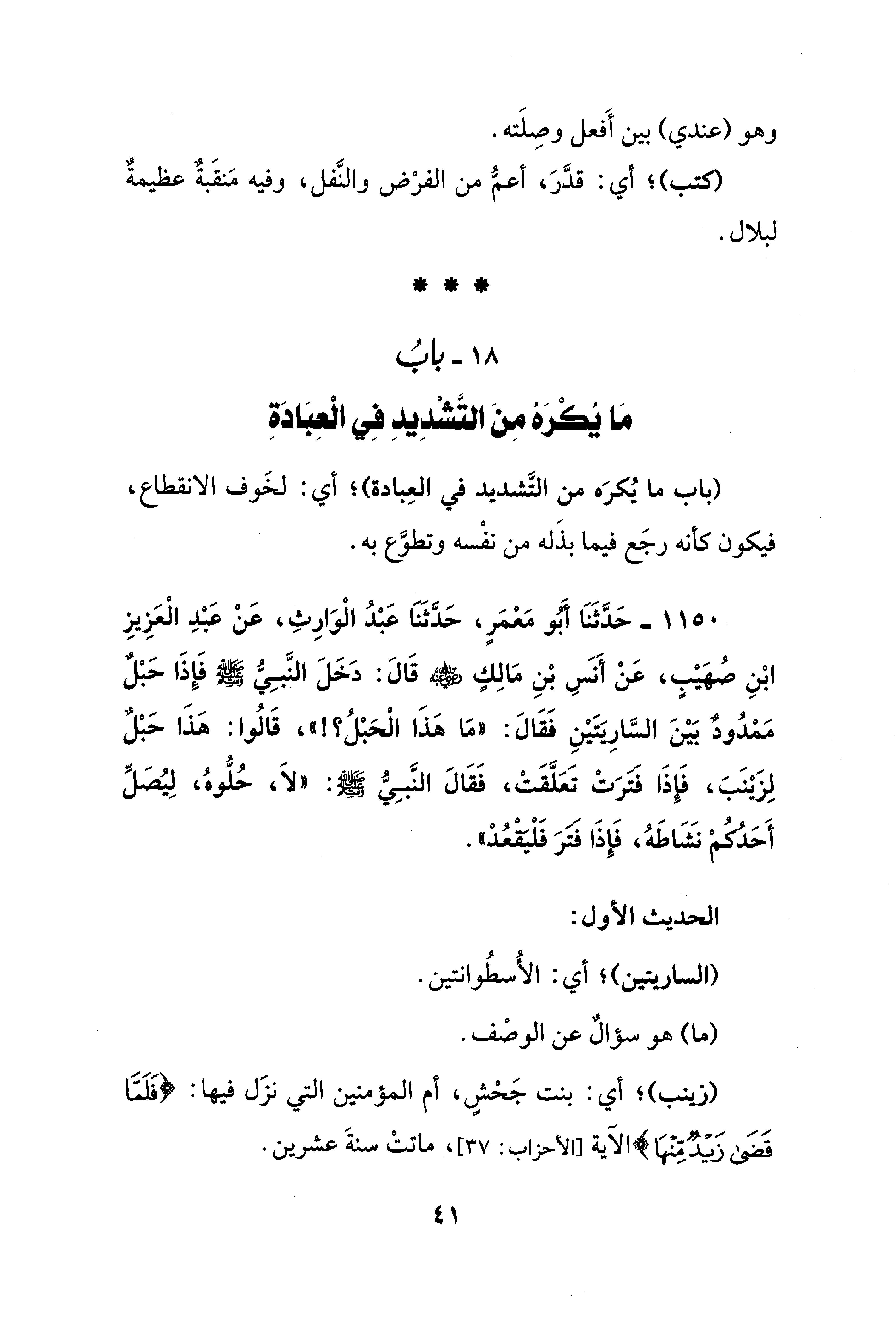 1150 - حَدَّثَنَا أَبُو مَعْمَرٍ، حَدَّثَنَا عَبْدُ الْوَارِثِ، عَنْ عَبْدِ الْعَزِيزِ ابْنِ صُهَيْبٍ، عَنْ أَنس بْنِ مَالِكٍ - رضي الله عنه - قَالَ: دَخَلَ النَّبِيُّ - صلى الله عليه وسلم - فَإِذَا حَبْلٌ مَمْدُودٌ بَيْنَ السَّارِيتيْنِ فَقَالَ: "مَا هَذَا الْحَبْلُ؟! "، قَالُوا: هَذَا حَبْلٌ لِزَيْنَبَ، فَإِذَا فتَرَتْ تَعَلَّقَتْ، فَقَالَ النَّبِيُّ - صلى الله عليه وسلم -: "لاَ، حُلُّوهُ، لِيُصَلِّ أَحَدكمْ نشاطَهُ، فَإِذَا فتَرَ فَلْيقْعُدْ".