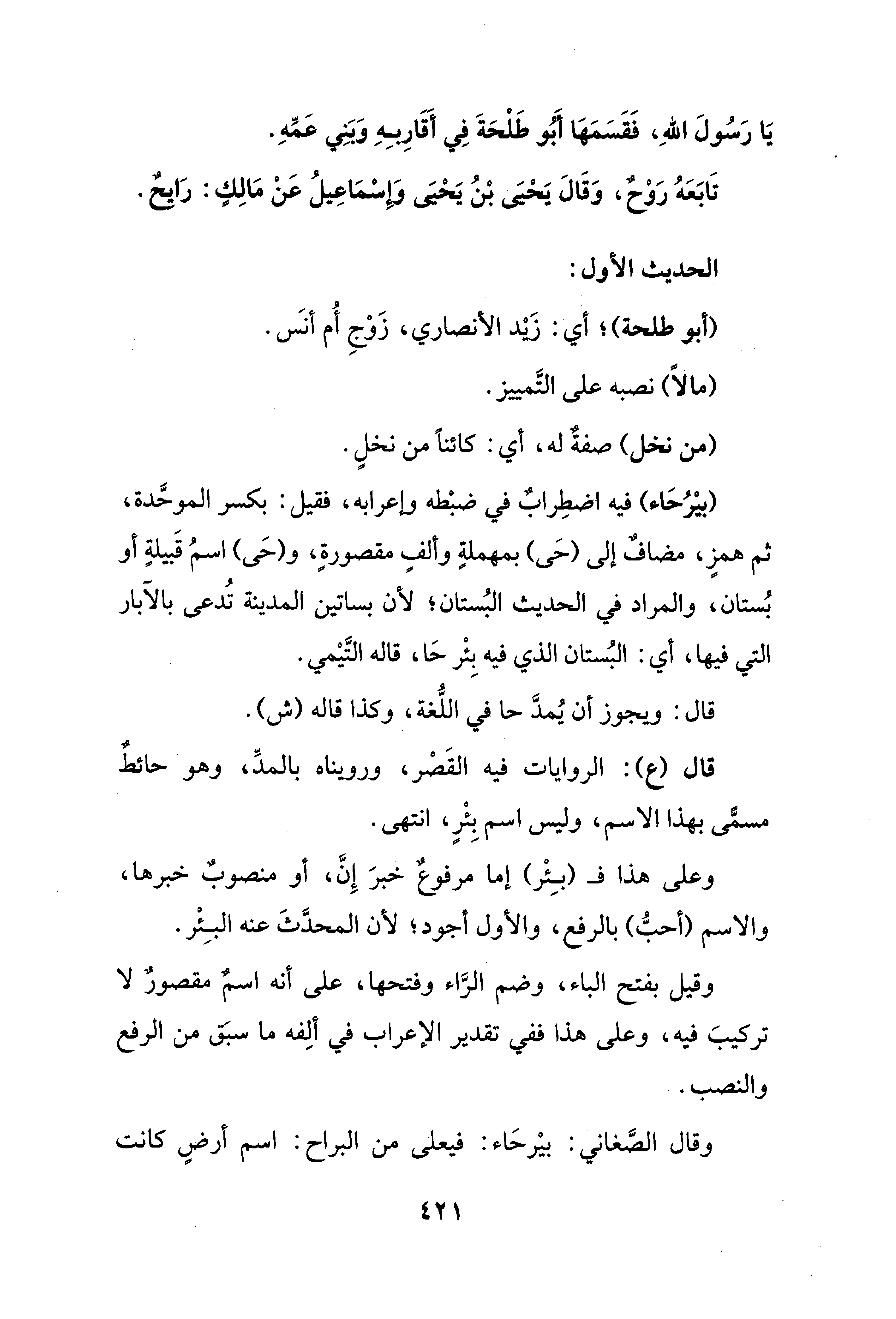(بيْرُحَاء) فيه اضطِرابٌ في ضبْطه وإعرابه، فقيل: بكسر الموحَّدة، ثم همزٍ، مضافٌ إلى (حَى) بمهملةٍ وألفٍ مقصورةٍ، و (حَى) اسمُ قَبيلةٍ أو بُستان، والمراد في الحديث البُستان؛ لأن بساتين المدينة تُدعى بالآبار التي فيها، أي: البُستان الذي فيه بِئْر حَا، قاله التَّيْمي.