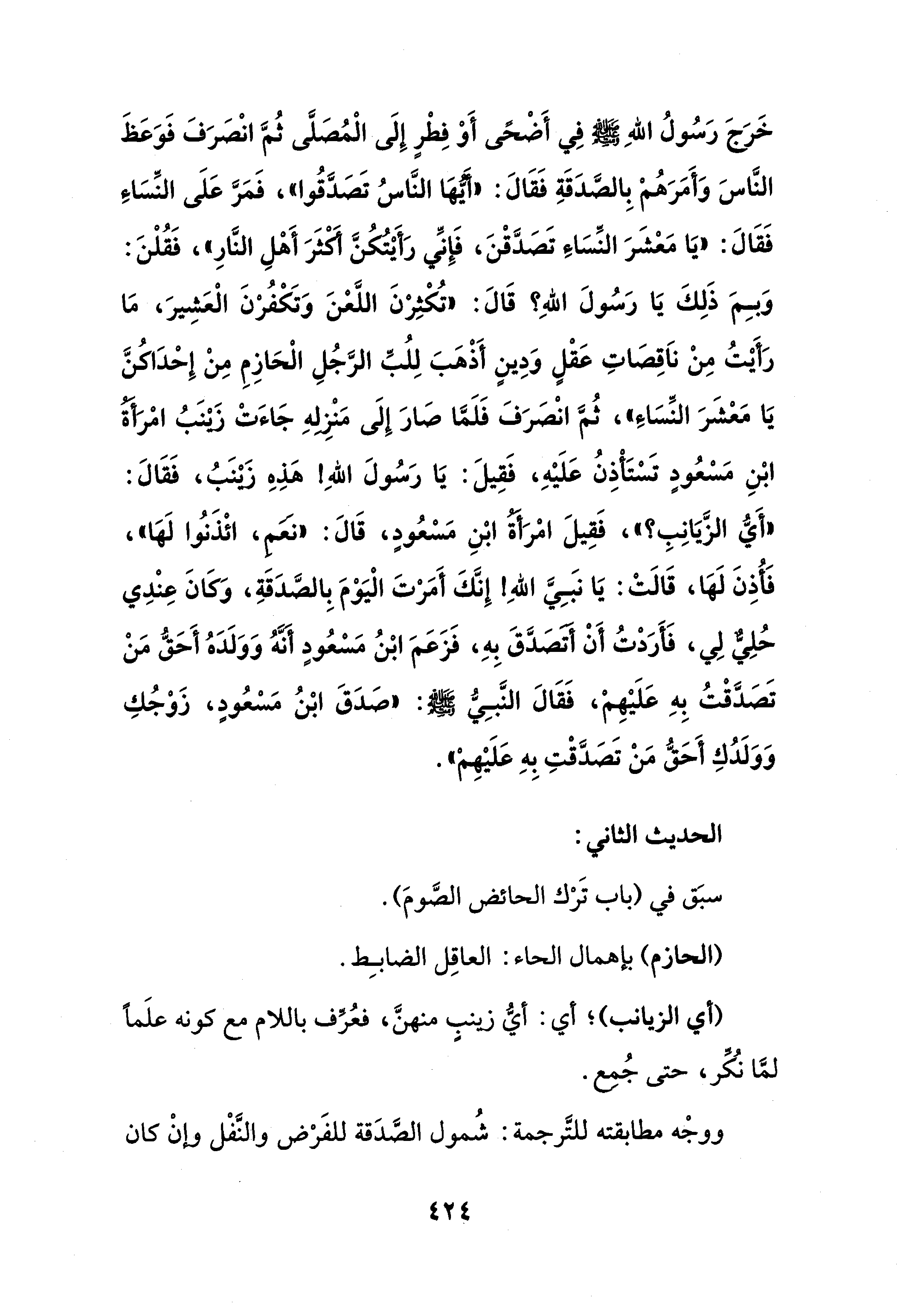 خَرَجَ رَسُولُ اللهِ - صلى الله عليه وسلم - فِي أَضْحًى أَوْ فِطْرٍ إِلَى الْمُصَلَّى ثُمَّ انْصَرَفَ فَوَعَظَ النَّاسَ وَأَمَرَهُمْ بِالصَّدَقَةِ فَقَالَ: "أَيُّهَا النَّاسُ تَصَدَّقُوا"، فَمَرَّ عَلَى النِّسَاءَ فَقَالَ: "يَا مَعْشَرَ النِّسَاءِ تَصَدَّقْنَ، فَإِنِّي رَأَيْتُكُنَّ أَكْثَرَ أَهْلِ النَّارِ"، فَقُلْنَ: وَبِمَ ذَلِكَ يَا رَسُولَ اللهِ؟ قَالَ: "تُكْثِرْنَ اللَّعْنَ وَتَكْفُرْنَ الْعَشِيرَ، مَا رَأَيْتُ مِنْ ناَقِصَاتِ عَقْلٍ وَدِينٍ أَذْهَبَ لِلُبِّ الرَّجُلِ الْحَازِمِ مِنْ إِحْدَاكُنَّ يَا مَعْشَرَ النِّسَاءِ"، ثُمَّ انْصَرَفَ فَلَمَّا صَارَ إِلَى مَنْزِلهِ جَاءَتْ زَيْنَبُ، امْرَأَةُ ابْنِ مَسْعُودٍ تَسْتَأْذِنُ عَلَيْهِ، فَقِيلَ: يَا رَسُولَ اللهِ! هَذِهِ زينَبُ، فَقَالَ: "أَيُّ الزَّيَانِبِ؟ "، فَقِيلَ امْرَأَةُ ابْنِ مَسْعُودٍ، قَالَ: "نَعَمِ، ائْذَنُوا لَهَا"، فَأُذِنَ لَهَا، قَالَتْ: يَا نَبِيَّ اللهِ! إِنَّكَ أَمَرْتَ الْيَوْمَ بِالصَّدَقَةِ، وَكَانَ عِنْدِي حُلِيٌّ لِي، فَأَرَدْتُ أَنْ أتصَدَّقَ بِهِ، فَزَعَمَ ابْنُ مَسْعُودٍ أنَّهُ وَوَلَدَهُ أَحَقُّ مَنْ تَصَدَّقْتُ بِهِ عَلَيْهِمْ، فَقَالَ النَّبِيُّ - صلى الله عليه وسلم -: "صدَقَ ابْنُ مَسْعُودٍ، زَوْجُكِ وَوَلَدُكِ أَحَقُّ مَنْ تَصَدَّقْتِ بِهِ عَلَيْهِمْ".