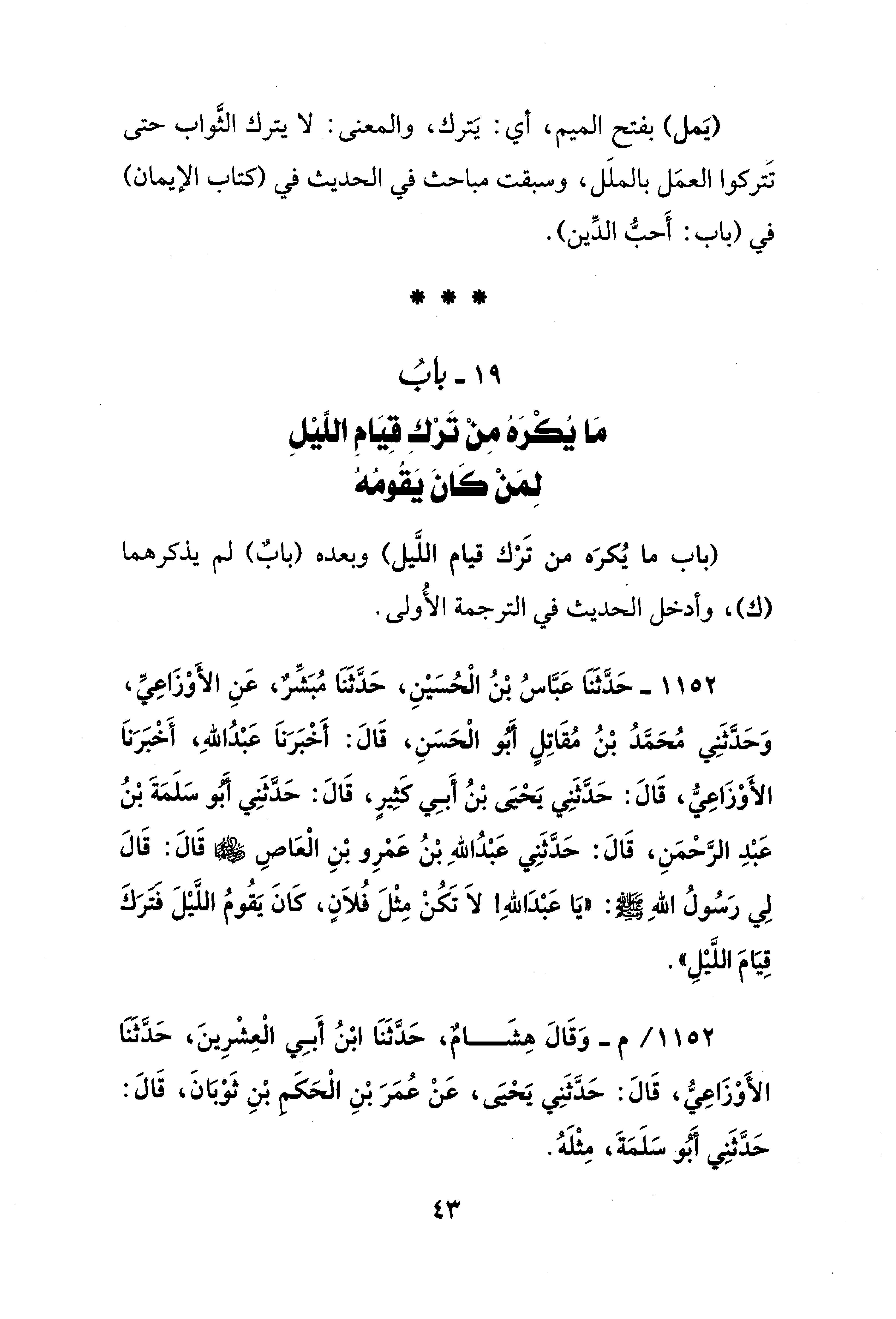 19 - بابُ مَا يُكْرَهُ مِنْ تَرْكِ قِيَامِ اللَّيْلِ لِمَنْ كَانَ يَقُومُهُ