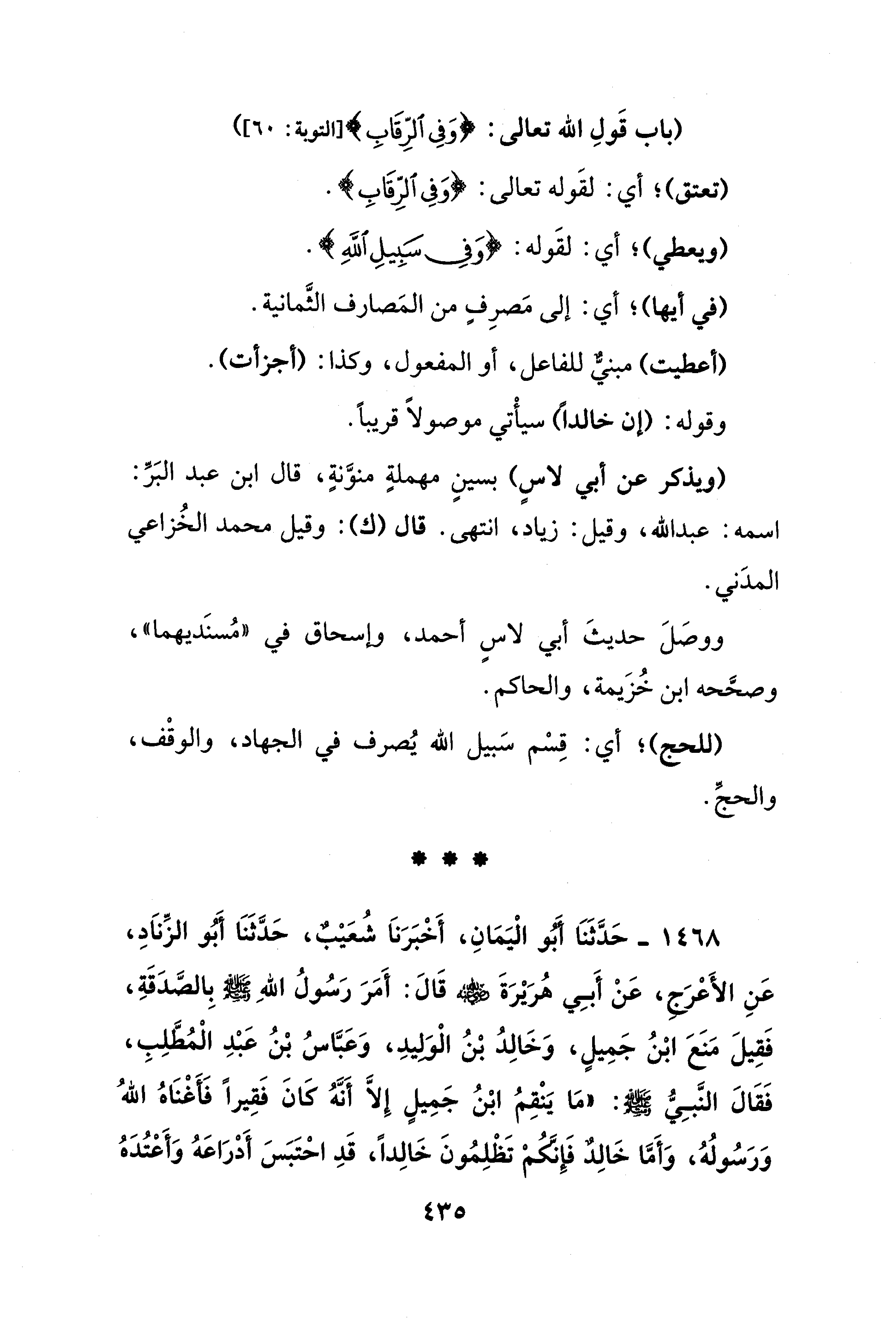 1468 - حَدَّثَنَا أَبُو الْيَمَانِ، أَخْبَرَناَ شُعَيْبٌ، حَدَّثَنَا أَبُو الزِّناَدِ، عَنِ الأَعْرَجِ، عَنْ أَبِي هُرَيْرَةَ - رضي الله عنه - قَالَ: أَمَرَ رَسُولُ اللهِ - صلى الله عليه وسلم - بِالصَّدَقَةِ، فَقِيلَ مَنَعَ ابْنُ جَمِيلٍ، وَخَالِدُ بْنُ الْوَلِيدِ، وَعَبَّاسُ بْنُ عَبْدِ الْمُطَّلِبِ، فَقَالَ النَّبِيُّ - صلى الله عليه وسلم -: "مَا يَنْقِمُ ابْنُ جَمِيلٍ إِلَّا أنَّهُ كَانَ فَقِيرًا فَأَغْنَاهُ اللهُ وَرَسُولُهُ، وَأَمَّا خَالِدٌ فَإِنَّكُمْ تَظْلِمُونَ خَالِدًا، قَدِ احْتَبَسَ أَدْرَاعَهُ وَأَعْتُدَهُ