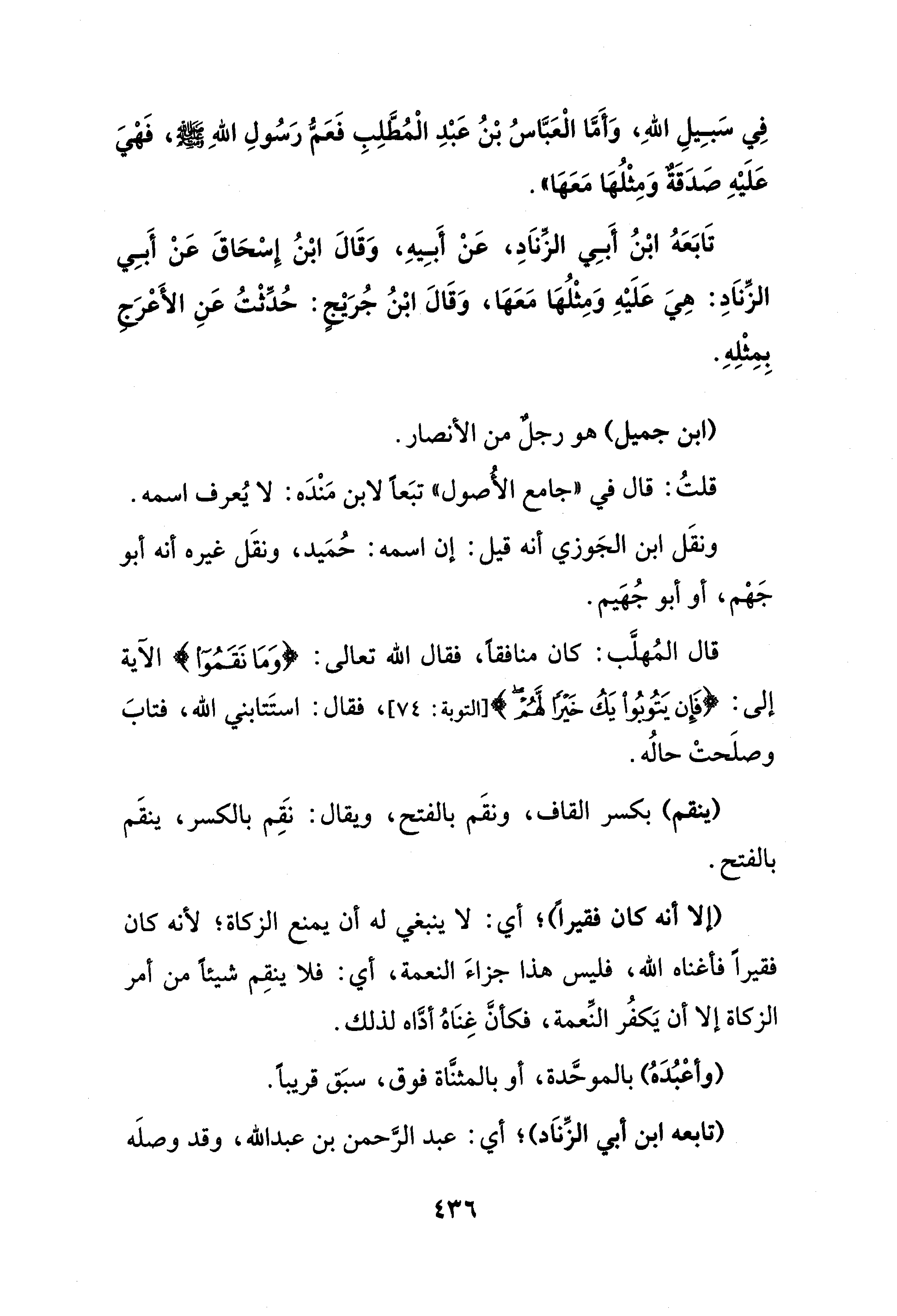 فِي سَبِيلِ اللهِ، وَأَمَّا الْعَبَّاسُ بْنُ عَبْدِ الْمُطَّلِبِ فَعَمُّ رَسُولِ اللهِ - صلى الله عليه وسلم -، فَهْيَ عَلَيْهِ صَدَقَةٌ وَمِثْلُهَا مَعَهَا".