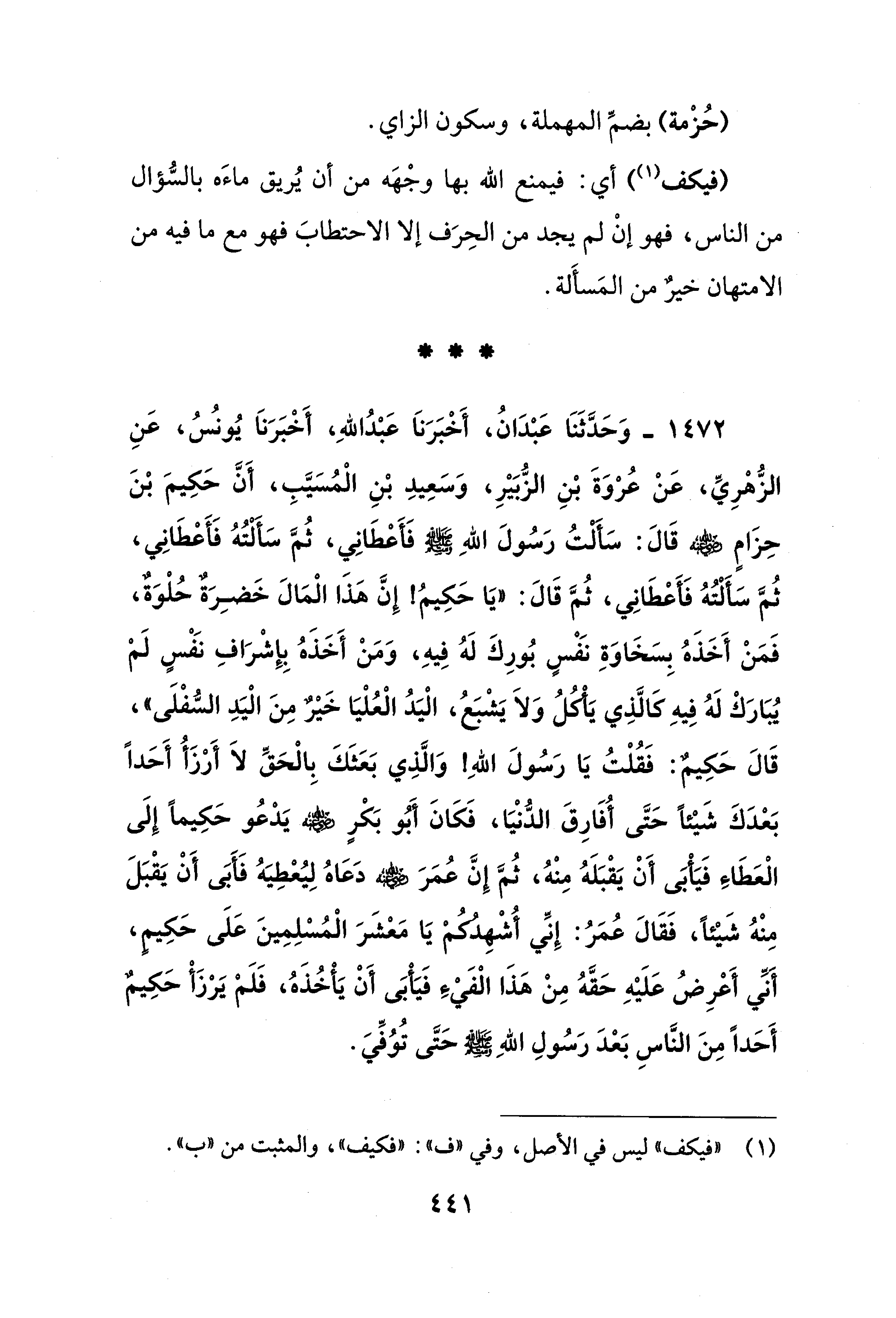 1472 - وَحَدَّثَنَا عَبْدَانُ، أَخْبَرَنَا عَبْدُ اللهِ، أَخْبَرَنَا يُونسُ، عَنِ الزُّهْرِيِّ، عَنْ عُرْوَةَ بْنِ الزُّبَيْرِ، وَسَعِيدِ بْنِ الْمُسَيَّبِ، أَنَّ حَكِيمَ بْنَ حِزَامٍ - رضي الله عنه - قَالَ: سَأَلْتُ رَسُولَ اللهِ - صلى الله عليه وسلم - فَأَعْطَانِي، ثُمَّ سَأَلْتُهُ فَأَعْطَانِي، ثُمَّ سَأَلْتُهُ فَأَعْطَانِي، ثُمَّ قَالَ: "يَا حَكِيمُ! إِنَّ هَذَا الْمَالَ خَضِرَةٌ حُلْوَةٌ، فَمَنْ أَخَذَهُ بِسَخَاوَةِ نفسٍ بُورِكَ لَهُ فِيهِ، وَمَنْ أَخَذَهُ بِإشْرَافِ نَفْسٍ لَمْ يُبَارَكْ لَهُ فِيهِ كَالَّذِي يَأْكُلُ وَلاَ يَشْبَعُ، الْيَدُ الْعُلْيَا خَيْرٌ مِنَ الْيَدِ السُّفْلَى"، قَالَ حَكِيمٌ: فَقُلْتُ يَا رَسُولَ اللهِ! وَالَّذِي بَعَثَكَ بِالْحَقِّ لاَ أَرْزَأُ أَحَدًا بَعْدَكَ شَيْئًا حَتَّى أُفَارِقَ الدُّنْيَا، فَكَانَ أَبُو بَكْرٍ - رضي الله عنه - يَدْعُو حَكِيمًا إلَى الْعَطَاءِ فَيَأْبَى أَنْ يَقْبَلَهُ مِنْهُ، ثُمَّ إِنَّ عُمَرَ - رضي الله عنه - دَعَاهُ لِيُعْطِيَهُ فَأَبَى أَنْ يَقْبَلَ مِنْهُ شَيْئًا، فَقَالَ عُمَرُ: إِنِّي أُشْهِدُكُمْ يَا مَعْشَرَ الْمُسْلِمِينَ عَلَى حَكِيمٍ، أنِّي أَعْرِضُ عَلَيْهِ حَقَّهُ مِنْ هَذَا الْفَيْءِ فَيَأْبَى أَنْ يَأْخُذَهُ، فَلَمْ يَرْزَأْ حَكِيمٌ أَحَدًا مِنَ النَّاسِ بَعْدَ رَسُولِ اللهِ - صلى الله عليه وسلم - حَتَّى تُوُفِّيَ.