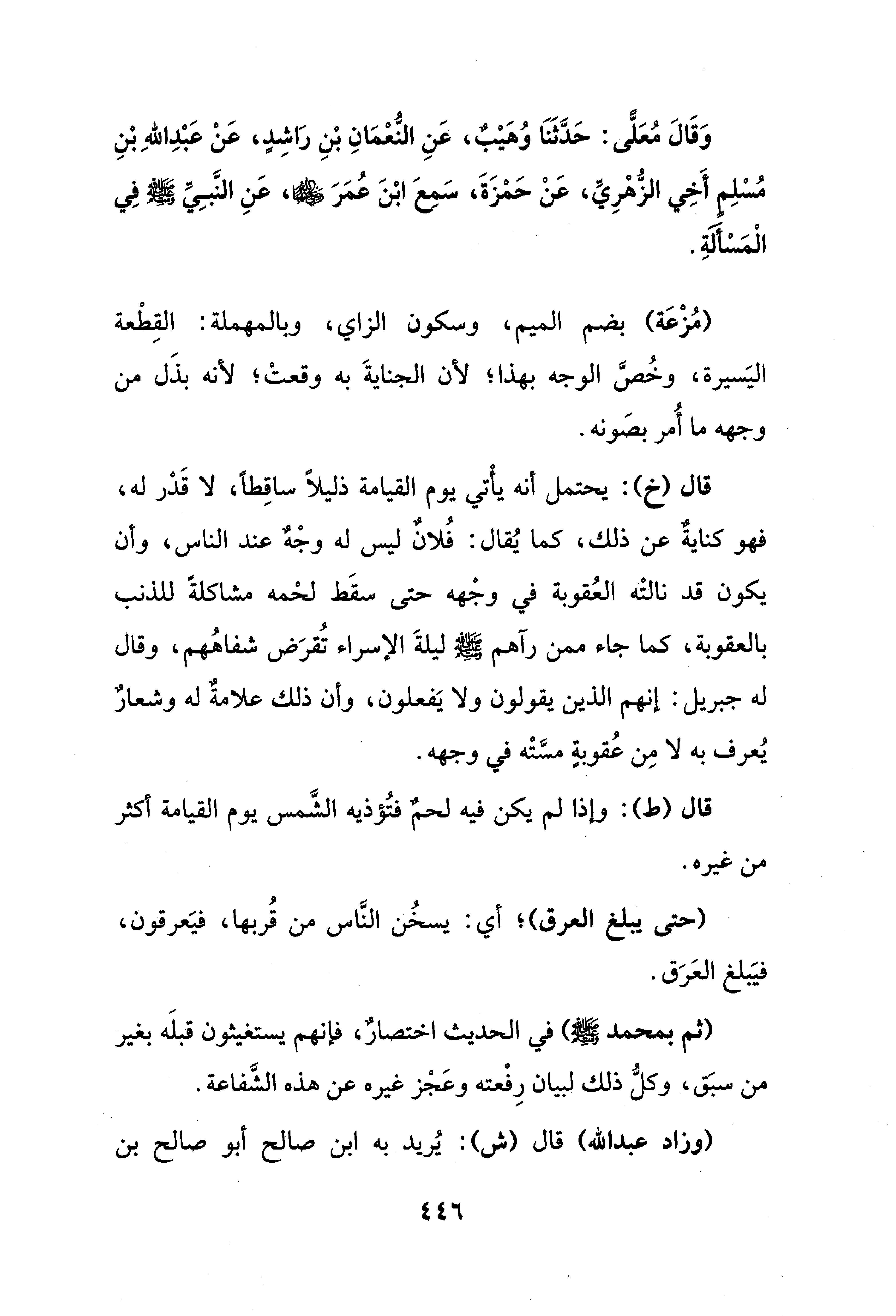 وَقَالَ مُعَلًّى: حَدَّثَنَا وُهَيْبٌ، عَنِ النُّعْمَانِ بْنِ رَاشِدٍ، عَنْ عَبْدِ اللهِ بْنِ مُسْلِمٍ أَخِي الزُّهْرِيِّ، عَنْ حَمْزَةَ، سَمِعَ ابْنَ عُمَرَ - رضي الله عنهما -، عَنِ النَّبِيِّ - صلى الله عليه وسلم - فِي الْمَسْأَلةِ.