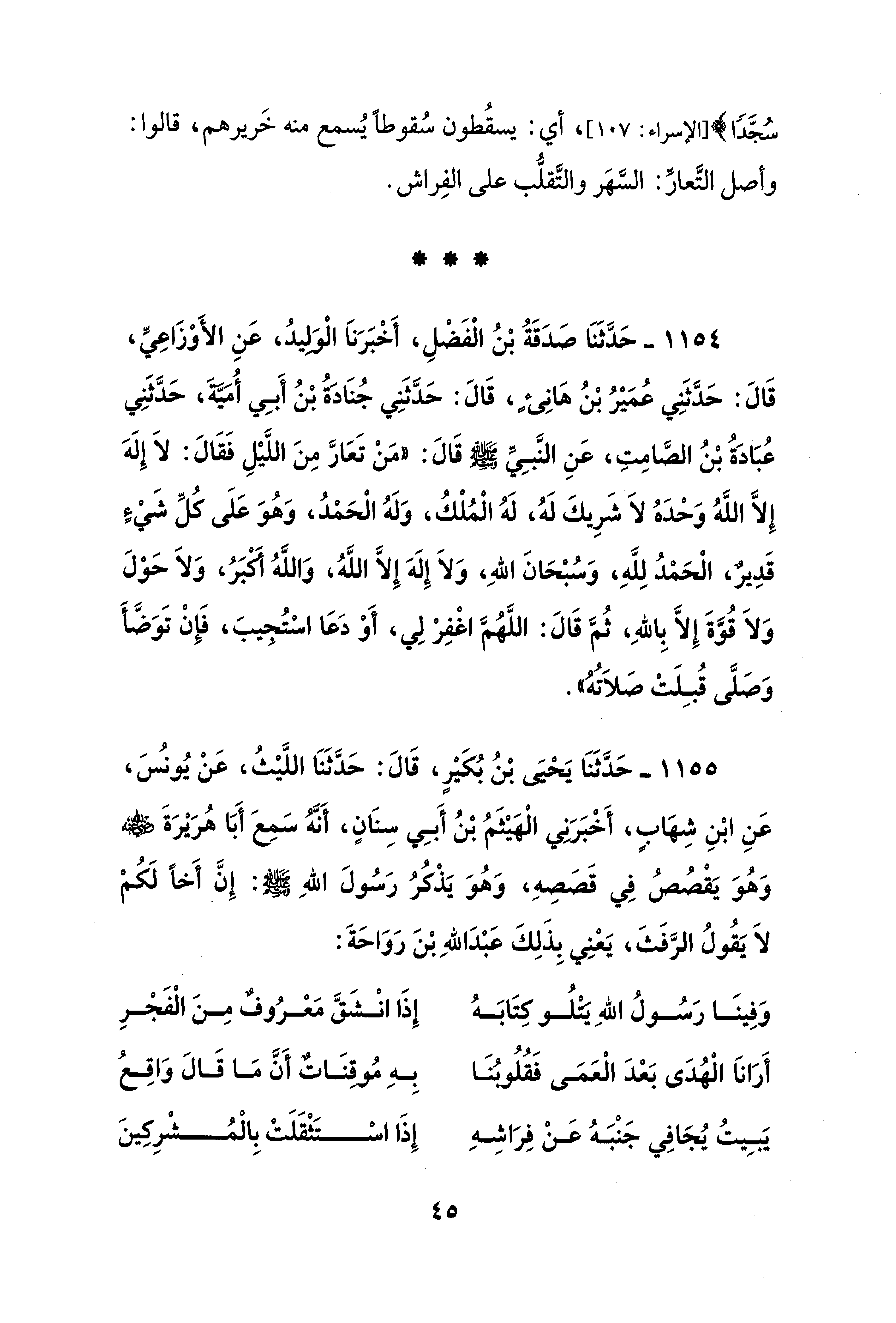 1154 - حَدَّثَنَا صَدَقَةُ بْنُ الْفَضْلِ، أَخْبَرَنَا الْوَليدُ، عَنِ الأَوْزَاعِيِّ، قَالَ: حَدَّثَنِي عُمَيْرُ بْنُ هَانِئٍ، قَالَ: حَدَّثَنِي جُنَادَةُ بْنُ أَبِي أُمَيَّةَ، حَدَّثَنِي عُبَادَةُ بْنُ الصَّامِتِ، عَنِ النَّبِيِّ - صلى الله عليه وسلم - قَالَ: "مَنْ تَعَارَّ مِنَ اللَّيْلِ فَقَالَ: لَا إِلَهَ إِلَّا الله وَحْدَهُ لَا شَرِيكَ لَهُ، لَهُ الْمُلْكُ، وَلَهُ الْحَمْدُ، وَهُوَ عَلَى كُلِّ شَيْءٍ قَدِيرٌ، الْحَمْدُ لِلَّهِ، وَسُبْحَانَ اللهِ، وَلَا إِلَهَ إِلَّا اللهُ، وَاللهُ أكبَرُ، وَلَا حَوْلَ وَلَا قُوَّةَ إِلَّا بِاللهِ، ثُمَّ قَالَ: اللَّهُمَّ اغْفِرْ لِي، أَوْ دَعَا اسْتُجيبَ، فَإِنْ تَوَضَّأَ وَصَلَّى قُبِلَتْ صلَاتُهُ".