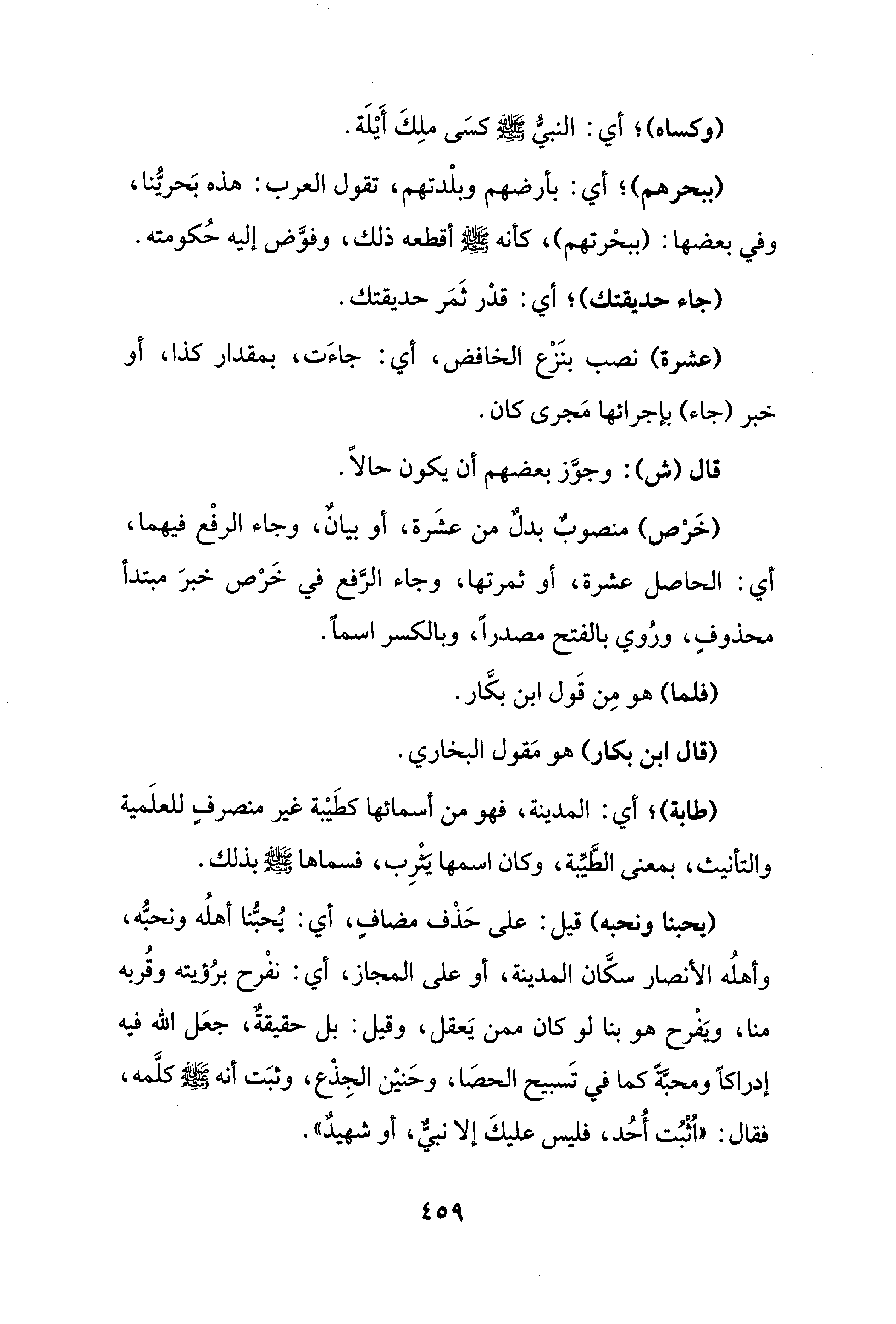 (يحبنا ونحبه) قيل: على حَذْف مضافٍ، أي: يُحبُّنا أهلُه ونحبُّه، وأهلُه الْأَنصار سكَّان المدينة، أو على المجاز، أي: نفْرح برُؤيته وقُربه منا، ويَفْرح هو بنا لو كان ممن يَعقل، وقيل: بل حقيقةٌ، جعَل الله فيه إدراكًا ومحبَّةً كما في تَسبيح الحصَا، وحَنيْن الجِذْع، وثبَت أنَّه - صلى الله عليه وسلم - كلَّمه، فقال: "اُثْبُت أُحُد، فليس عليكَ إلَّا نبيٌّ، أو شهيدٌ".