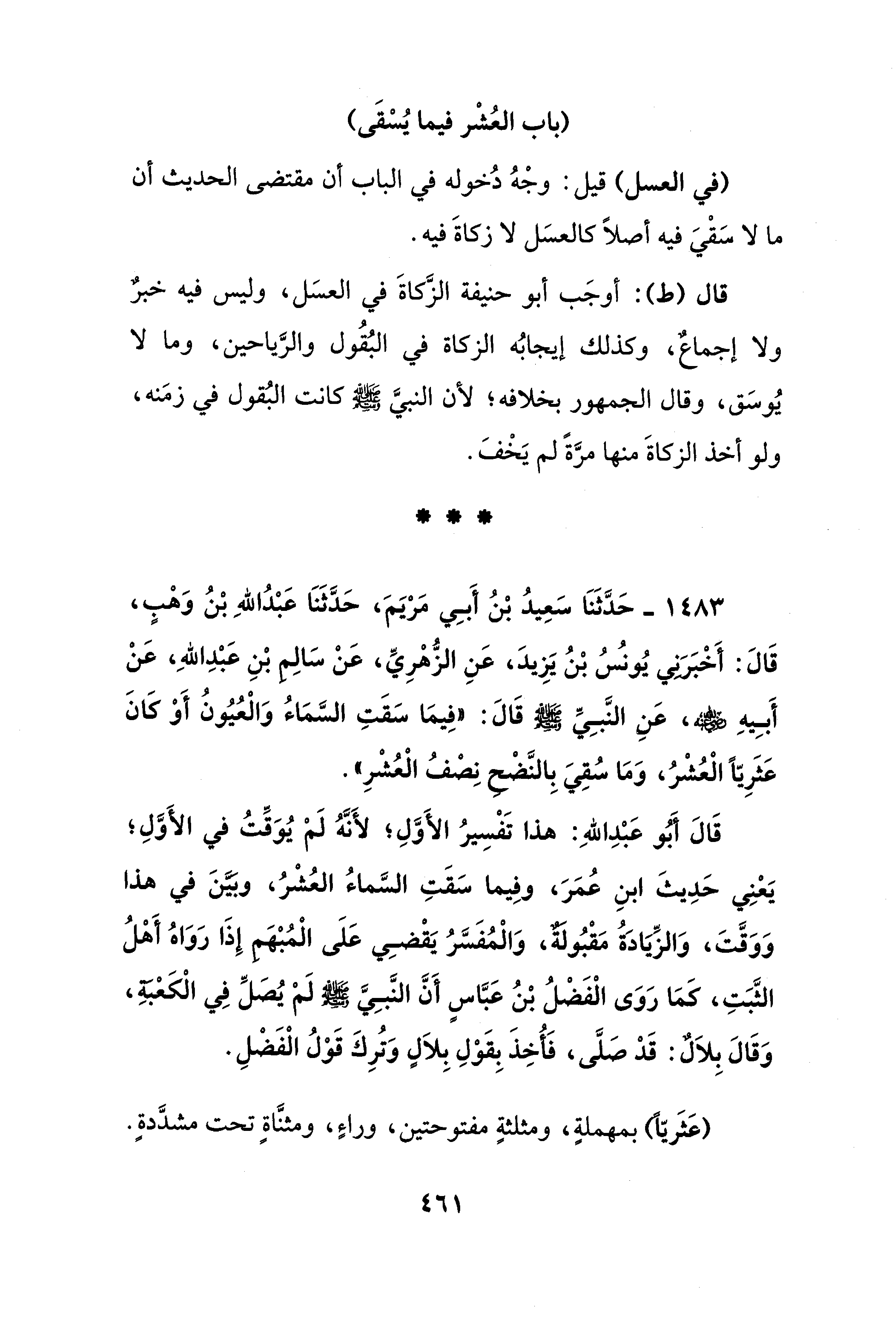 1483 - حَدَّثَنَا سَعِيدُ بْنُ أَبِي مَرْيَمَ، حَدَّثَنَا عَبْدُ اللهِ بْنُ وَهْبٍ، قَالَ: أَخْبَرَنِي يُونُسُ بنُ يَزِيدَ، عَنِ الزُّهْرِيِّ، عَنْ سَالِم بْنِ عَبْدِ اللهِ، عَنْ أَبِيهِ - صلى الله عليه وسلم -، عَنِ النَّبِيِّ - صلى الله عليه وسلم - قَالَ: "فِيمَا سَقَتِ السَّمَاءُ وَالْعُيُونُ أَوْ كَانَ عَثَرِيًّا الْعُشْرُ، وَمَا سُقِيَ بِالنَّضْح نِصْفُ الْعُشْرِ".