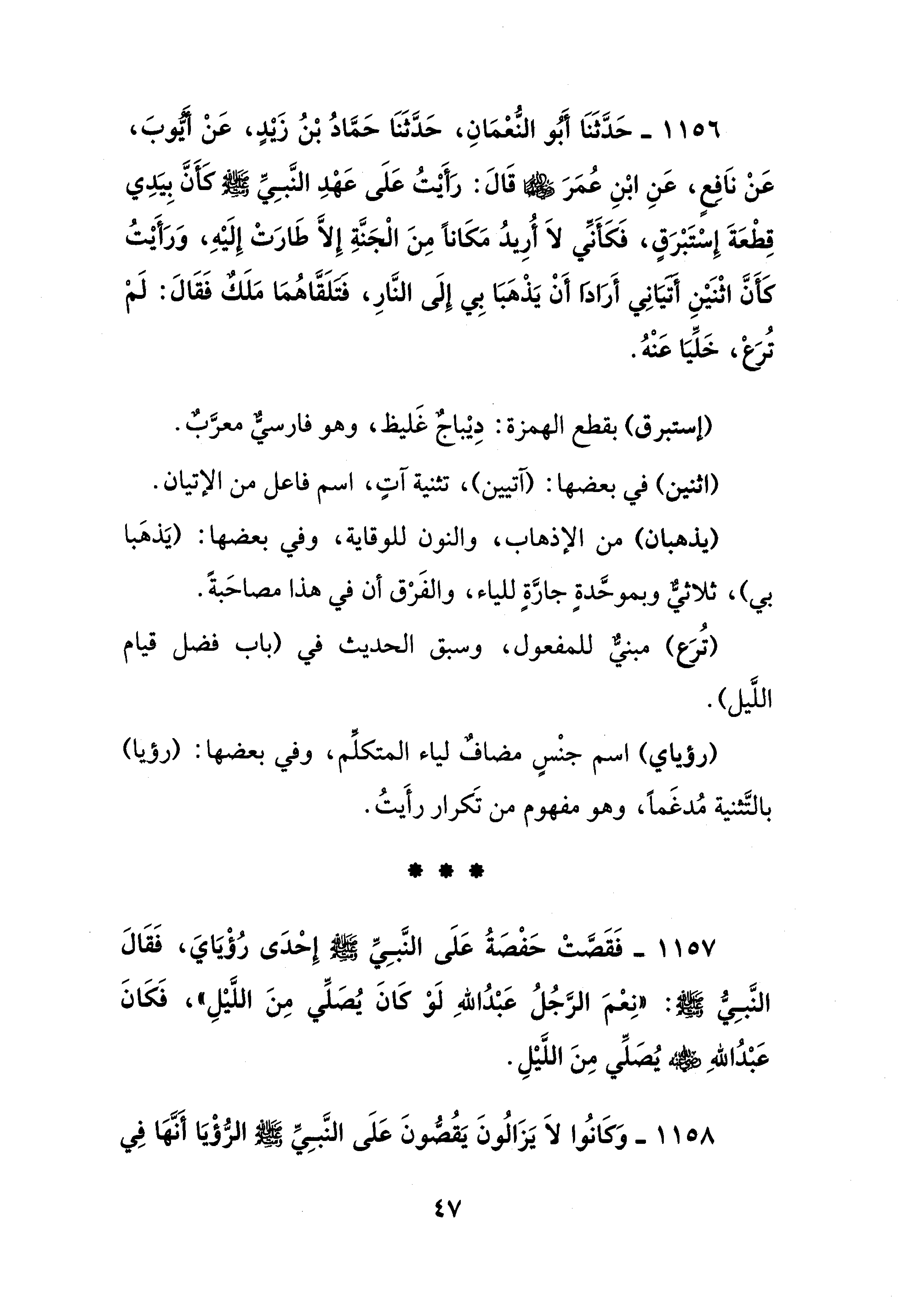 1156 - حَدَّثَنَا أَبُو النُّعْمَانِ، حَدَّثَنَا حَمَّادُ بْنُ زيدٍ، عَنْ أَيُّوبَ، عَنْ نَافِعٍ، عَنِ ابن عُمَرَ - رضي الله عنهما - قَالَ: رَأَيتُ عَلَى عَهْدِ النَّبِيِّ - صلى الله عليه وسلم - كَأَنَّ بِيَدِي قِطْعَةَ إِسْتَبْرَقٍ، فَكَأَنِّي لَا أُرِيدُ مَكَانًا مِنَ الْجَنَّةِ إِلَّا طَارَتْ إِلَيْهِ، وَرَأَيْتُ كَأَنَّ اثْنَيْنِ أَتيَانِي أَرَادا أَنْ يَذْهَبَا بِي إِلَى النَّارِ، فتلَقَّاهُمَا مَلَكٌ فَقَالَ: لَمْ تُرع، خَلِّيَا عَنْهُ.