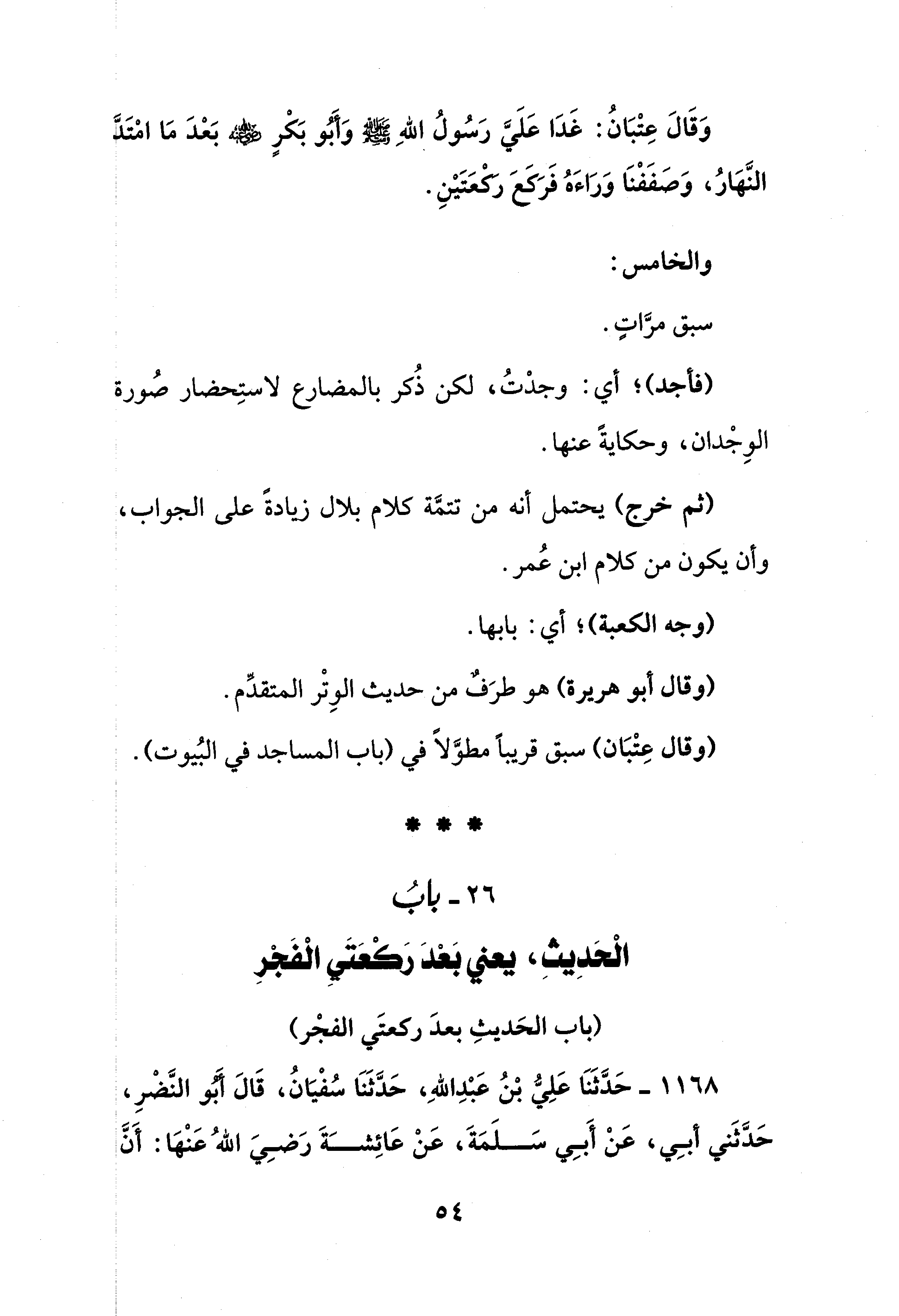 وَقَالَ عِتْبَانُ: غَدَا عَلَيَّ رَسُولُ اللهِ - صلى الله عليه وسلم - وَأَبُو بَكْرٍ - رضي الله عنه -؛ بَعْدَ مَا امْتَدَّ النَّهَارُ، وَصَفَفْنَا وَرَاءَهُ فَرَكَعَ رَكعَتَيْنِ.