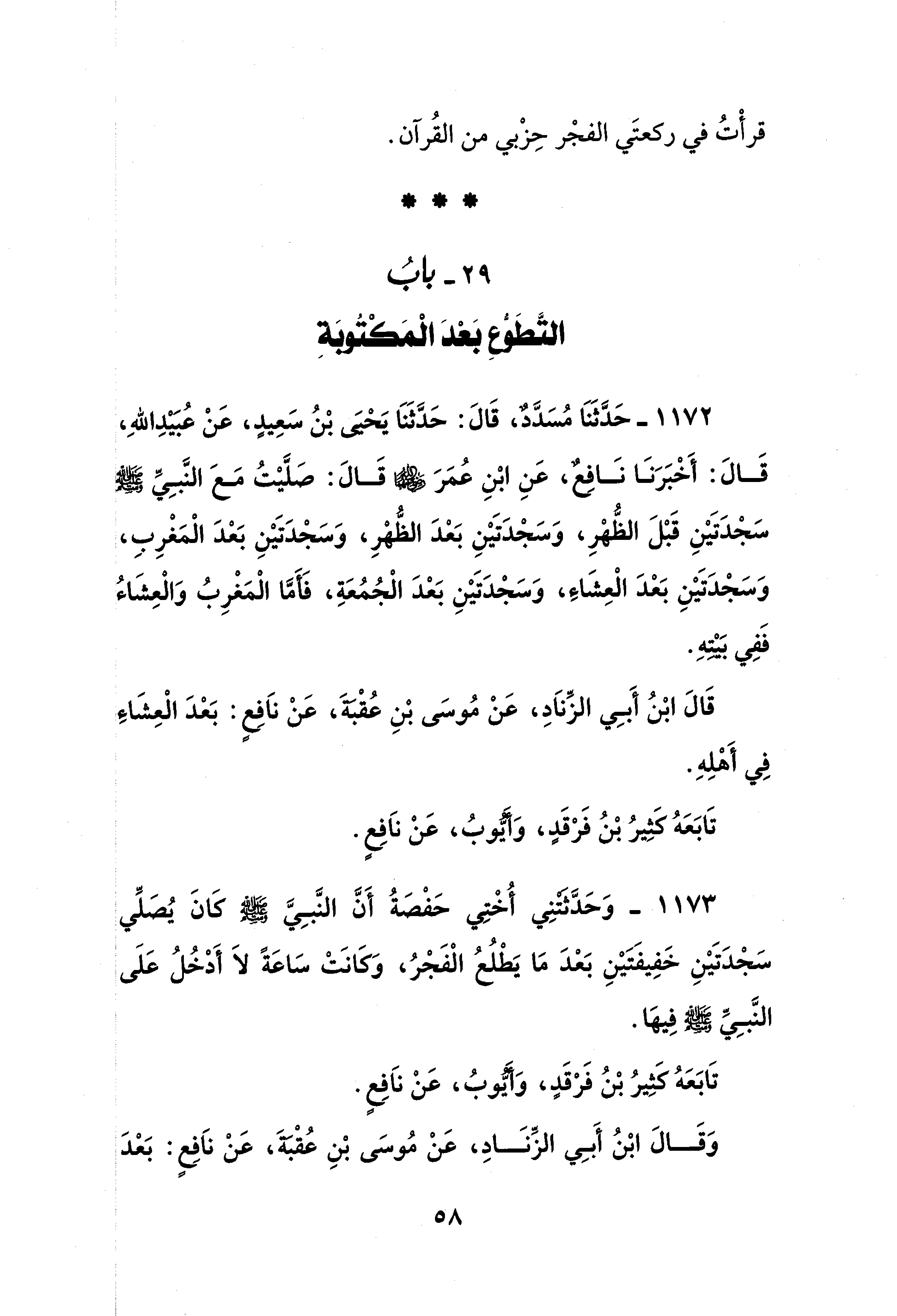 1173 - وَحَدَّثتنِي أُخْتِي حَفْصَةُ أَنَّ النَّبِيَّ - صلى الله عليه وسلم - كَانَ يُصَلِّي سَجْدَتَيْنِ خَفِيفَتَيْنِ بَعْدَ مَا يَطْلُعُ الْفَجْرُ، وَكَانَتْ سَاعَةً لَا أَدْخُلُ عَلَى النَّبِيِّ - صلى الله عليه وسلم - فِيهَا.