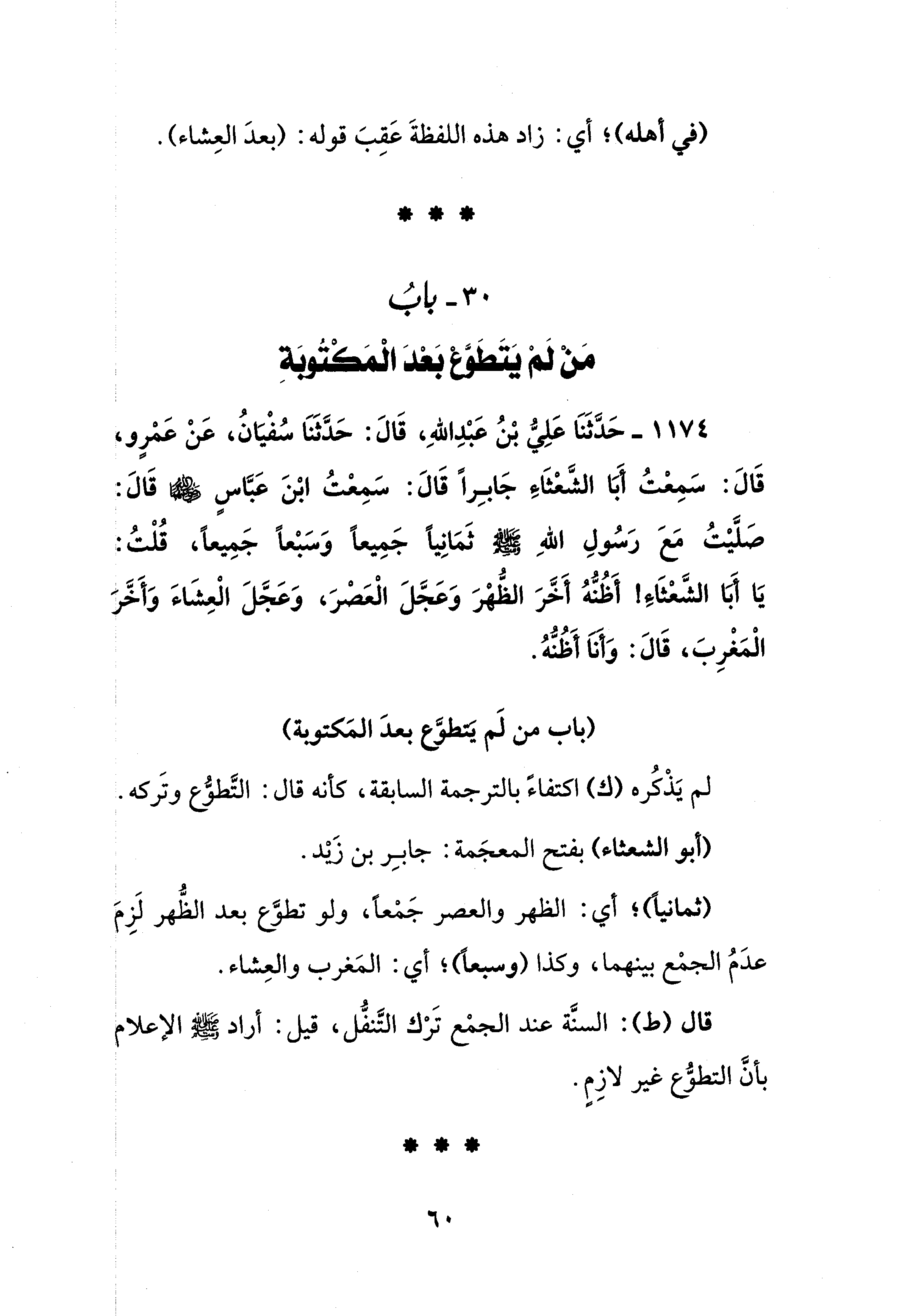 قال (ط): السنَّة عند الجمْع تَرْك التَّنفُّل، قيل: أراد - صلى الله عليه وسلم - الإعلام بأَنَّ التطوُّع غير لازِمٍ.