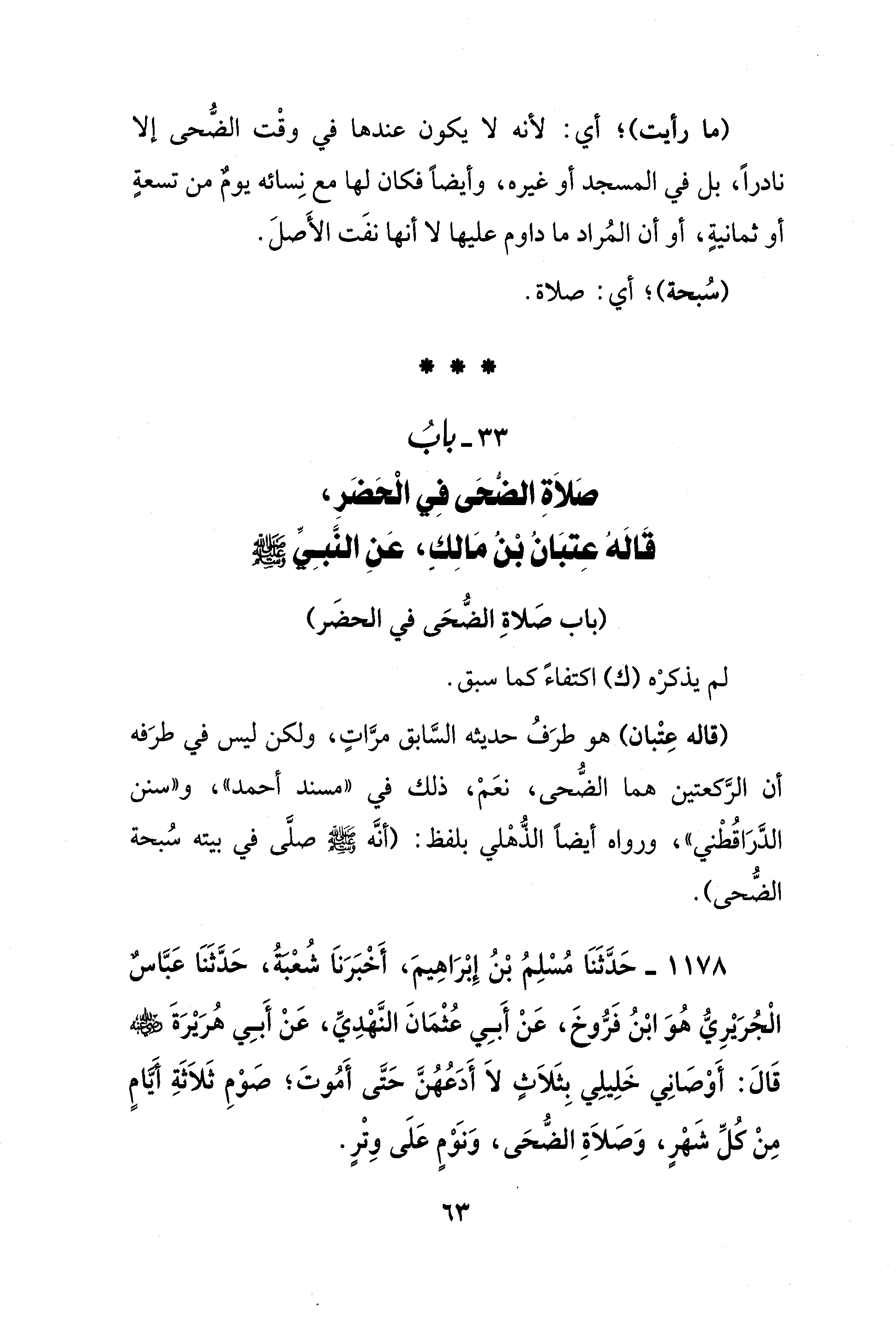 33 - بابُ صَلَاةِ الضُّحَى في الْحَضَرِ، قَالَهُ عِتبَانُ بْنُ مَالِكِ، عَنِ النَّبِيِّ - صلى الله عليه وسلم -