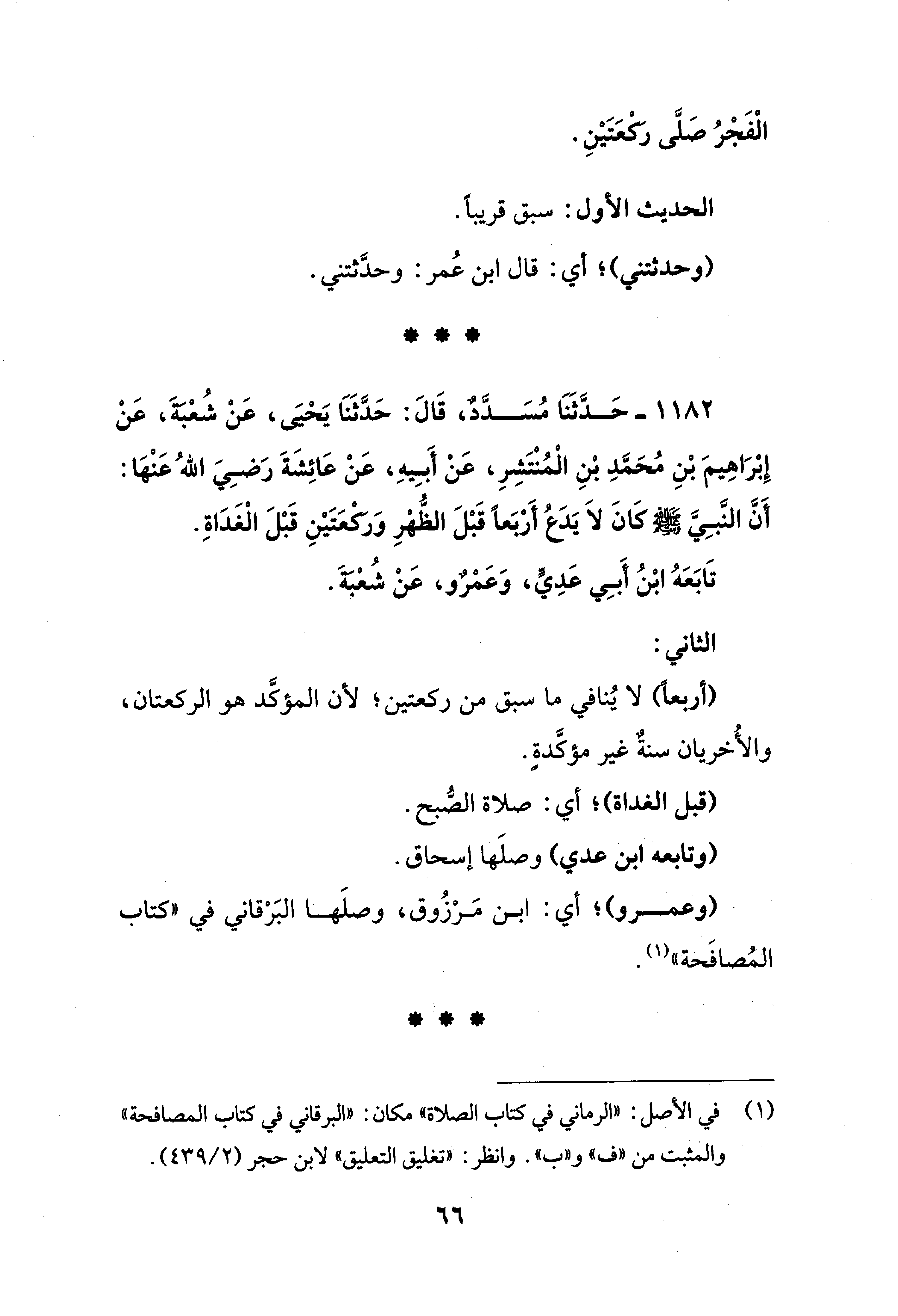 1182 - حَدَّثَنَا مُسَدَّدٌ، قَالَ: حَدَّثَنَا يَحْيَى، عَنْ شُعْبَةَ، عَنْ إِبْرَاهِيمَ بْنِ مُحَمَّدِ بْنِ الْمُنْتَشِرِ، عَنْ أَبِيهِ، عَنْ عَائِشَةَ رَضِيَ اللهُ عَنْهَا: أَنَّ النَّبِي - صلى الله عليه وسلم - كَانَ لَا يَدَعُ أَرْبَعًا قَبْلَ الظُّهْرِ وَرَكعَتَينِ قَبْلَ الْغَدَاةِ.