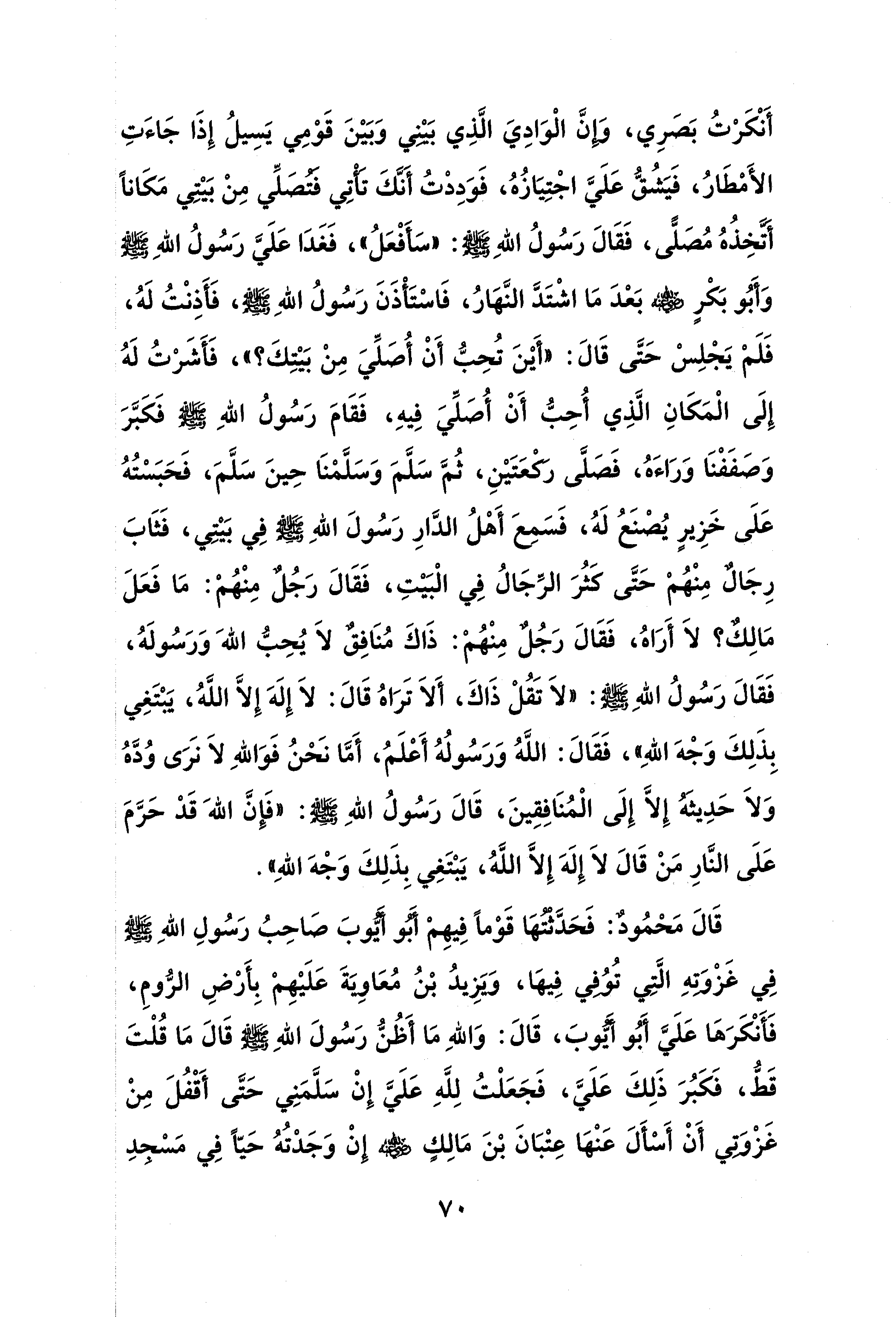 أَنْكَرْتُ بَصَرِي، وَإِنَّ الْوَادِيَ الَّذِي بَيْنِي وَبَيْنَ قَوْمِي يَسِيلُ إِذَا جَاءَتِ الأَمْطَارُ، فَيَشُقُّ عَلَيَّ اجْتِيَازُهُ، فَوَدِدْتُ أَنَّكَ تأْتِي فَتُصَلِّي مِنْ بَيْتِي مَكَانًا أَتَّخِذُهُ مُصَلًّى، فَقَالَ رَسُولُ اللهِ - صلى الله عليه وسلم -: "سَأَفْعَلُ"، فَغَدَا عَلَيَّ رَسُولُ اللهِ - صلى الله عليه وسلم - وَأَبُو بَكْرٍ - رضي الله عنه - بَعْدَ مَا اشْتَدَّ النَّهَارُ، فَاسْتَأْذَنَ رَسُولُ اللهِ - صلى الله عليه وسلم -، فَأَذِنْتُ لَهُ، فَلَمْ يَجْلِس حَتَّى قَالَ: "أَيْنَ تُحِبُّ أَنْ أُصَلِّيَ مِنْ بَيْتِكَ؟ "، فَأَشَرْتُ لَهُ إِلَى الْمَكَانِ الَّذِي أُحِبُّ أَنْ أصُلِّيَ فِيهِ، فَقَامَ رَسُولُ اللهِ - صلى الله عليه وسلم - فَكَبَّرَ وَصَفَفْنَا وَرَاءَهُ، فَصَلَّى رَكعَتَيْنِ، ثُمَ سَلَّمَ وَسَلَّمْنَا حِينَ سَلَّمَ، فَحَبَسْتُهُ عَلَى خَزِيرٍ يُصْنَعُ لَهُ، فَسَمِعَ أَهْلُ الدَّارِ رَسُولَ اللهِ - صلى الله عليه وسلم - في بَيْتِي، فَثَابَ رِجَالٌ مِنْهُمْ حَتَّى كَثُرَ الرِّجَالُ في الْبَيْتِ، فَقَالَ رَجُل مِنْهُمْ: مَا فَعَلَ مَالِكٌ؟ لَا أَرَاهُ، فَقَالَ رَجُلٌ مِنْهُمْ: ذَاكَ مُنَافِقٌ لَا يُحِبُّ الله وَرَسُولَهُ، فَقَالَ رَسُولُ اللهِ - صلى الله عليه وسلم -: "لَا تَقُلْ ذَاكَ، أَلَا تَرَاهُ قَالَ: لَا إِلَهَ إِلَّا الله، يَبْتَغِي بِذَلِكَ وَجْهَ اللهِ"، فَقَالَ: الله وَرَسُولُهُ أَعْلَمُ، أَمَّا نَحْنُ فَوَاللهِ لَا نَرَى وُدَّهُ وَلَا حَدِيثَهُ إِلَّا إِلَى الْمُنَافِقِينَ، قَالَ رَسُولُ اللهِ - صلى الله عليه وسلم -: "فَإِنَّ الله قَدْ حَرَّمَ عَلَى النَّارِ مَنْ قَالَ لَا إِلَهَ إِلَّا الله، يَبْتَغِي بِذَلِكَ وَجْهَ اللهِ".