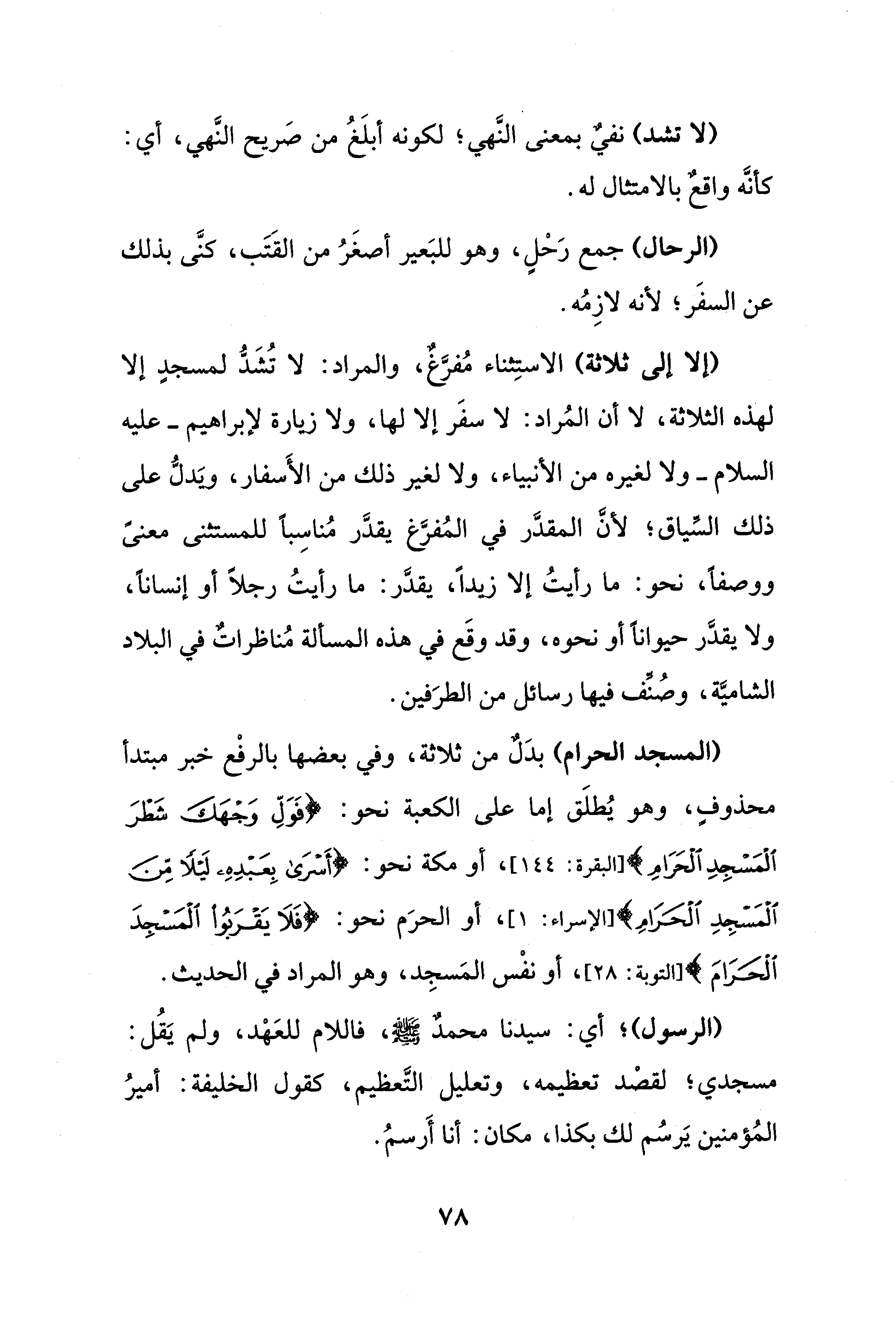 (إلا إلى ثلاثة) الاستِثناء مُفرَّغٌ، والمراد: لا تُشَدُّ لمسجدٍ إلا لهذه الثلاثة، لا أن المُراد: لا سفَر إلا لها، ولا زيارة لإبراهيم -عليه السلام- ولا لغيره من الأنبياء، ولا لغير ذلك من الأَسفار، ويَدلُّ على ذلك السِّياق؛ لأنَّ المقدَّر في المُفرَّغ يقدَّر مُناسِبًا للمستثنى معنى ووصفًا، نحو: ما رأيتُ إلا زيدًا، يقدَّر: ما رأيتُ رجلًا أو إنسانًا، ولا يقدَّر حيوانًا أو نحوه، وقد وقَع في هذه المسألة مُناظراتٌ في البلاد الشاميَّة، وصُنِّف فيها رسائل من الطرَفين.