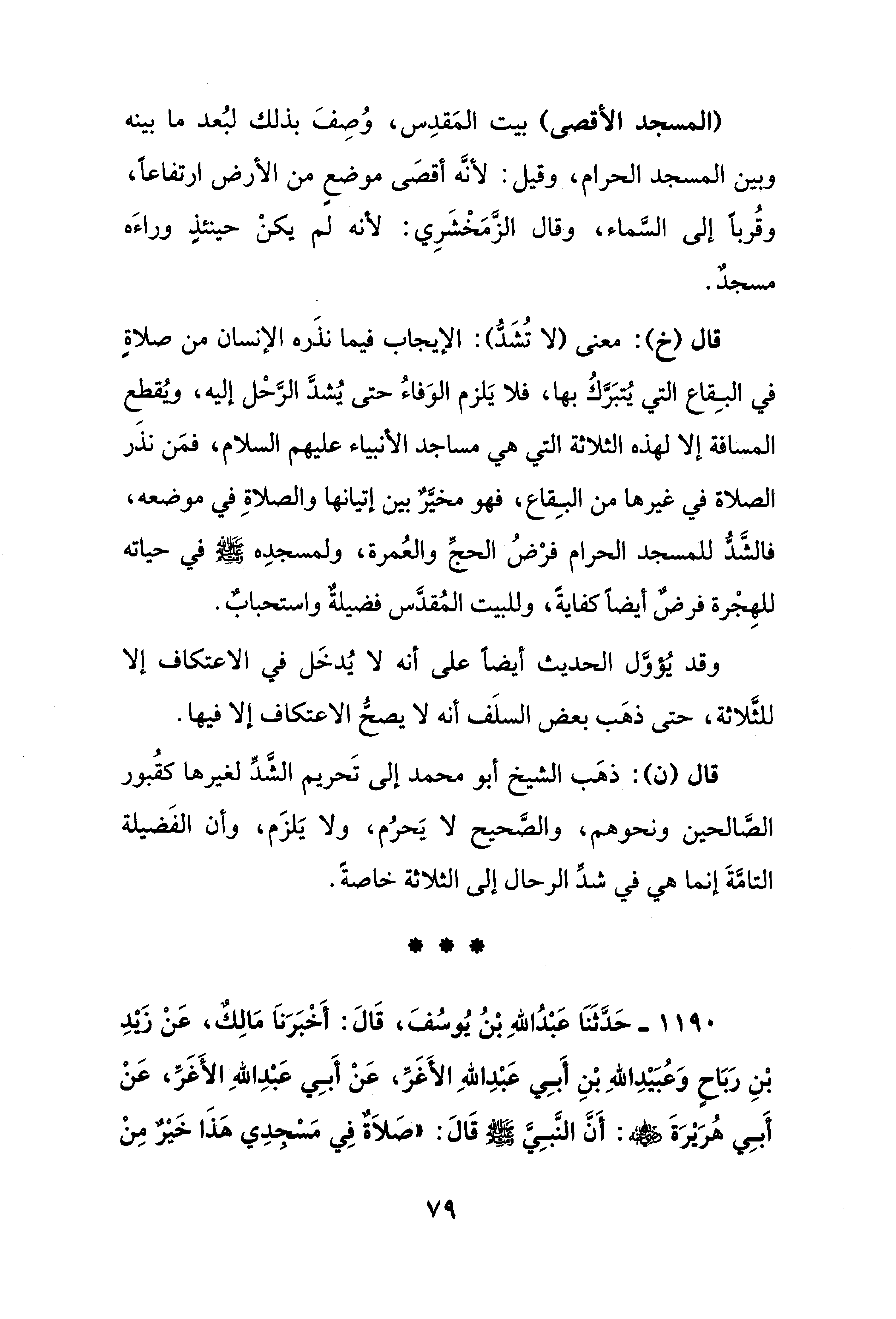 قال (ن): ذهَب الشيخ أبو محمَّد إلى تَحريم الشَّدِّ لغيرها كقُبور الصَّالحين ونحوهم، والصَّحيح لا يَحرُم، ولا يَلزَم، وأن الفَضيلة التامَّةَ إنما هي في شدِّ الرحال إلى الثلاثة خاصةً.
