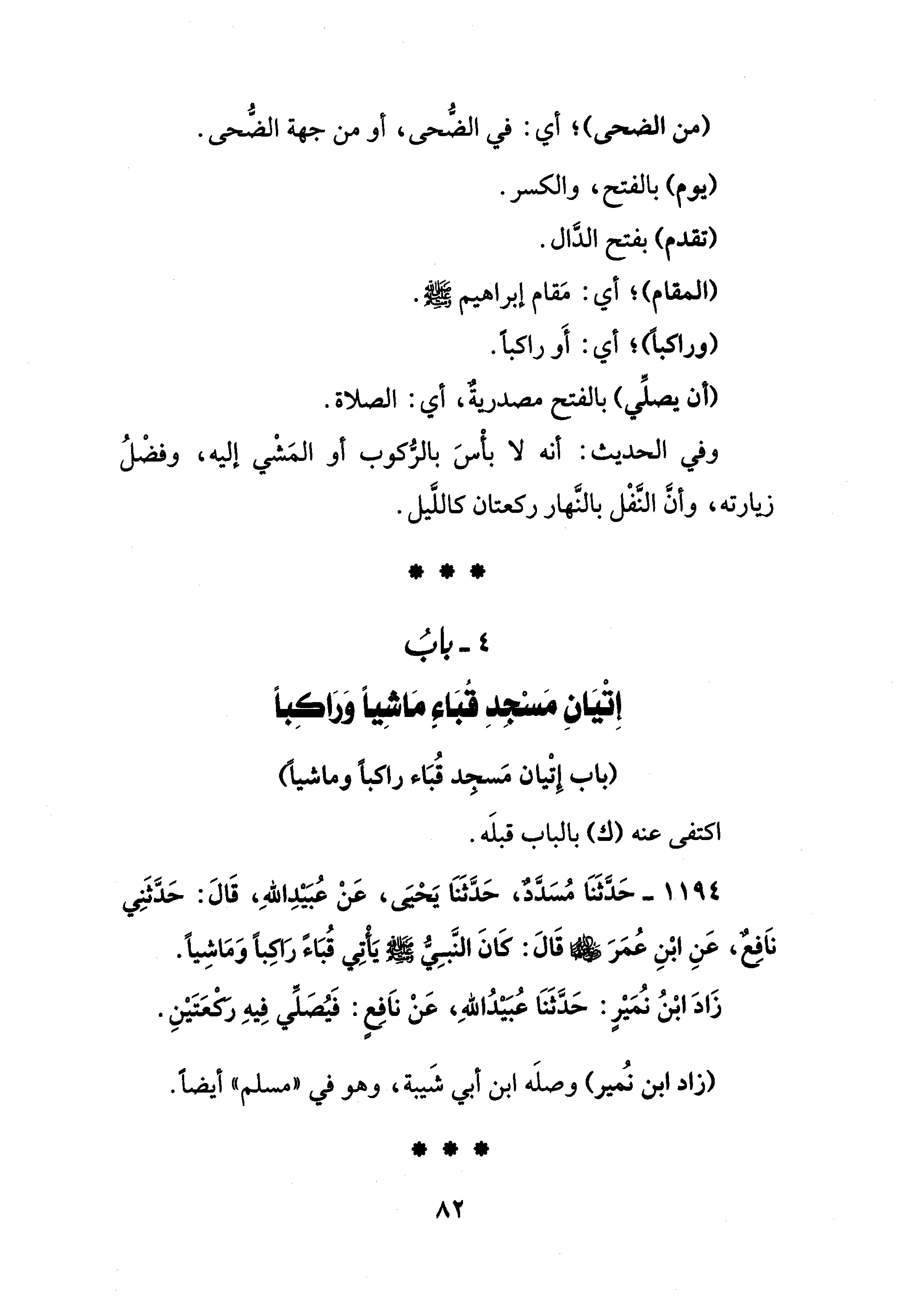وفي الحديث: أنَّه لا بأْسَ بالرُّكوب أو المَشْي إليه، وفضْلُ زيارته، وأنَّ النَّفْل بالنَّهار ركعتان كاللَّيل.