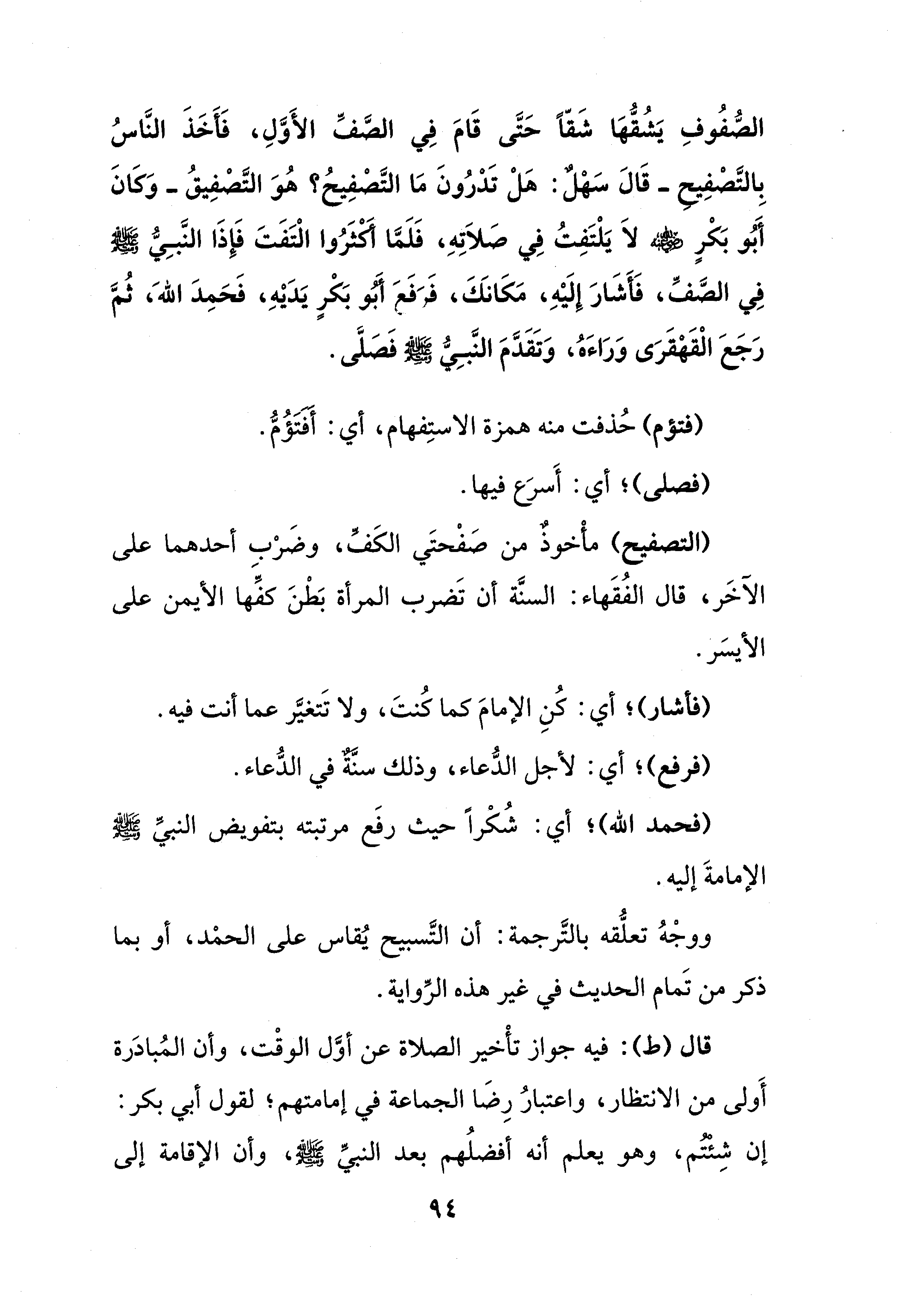 الصُّفُوفِ يَشُقُّهَا شَقًّا حَتَّى قَامَ في الصَّفِّ الأَوَّلِ، فَأَخَذَ النَّاسُ بِالتَّصْفِيحِ -قَالَ سَهْلٌ: هَلْ تَدْرُونَ مَا التَّصْفِيحُ؟ هُوَ التَّصْفِيقُ- وَكَانَ أَبُو بَكْرٍ - رضي الله عنه - لَا يَلْتَفِتُ في صَلَاتِهِ، فَلَمَّا أَكثَرُوا الْتَفَتَ فَإِذَا النَّبِيُّ - صلى الله عليه وسلم - في الصَّفِّ، فَأَشَارَ إِلَيْهِ، مَكَانَكَ، فَرَفَعَ اَبَو بَكْرٍ يَدَيْهِ، فَحَمِدَ الله، ثُمَّ رَجَعَ الْقَهْقَرَى وَرَاءَهُ، وَتَقَدَّمَ النَّبِيُّ - صلى الله عليه وسلم - فَصَلَّى.