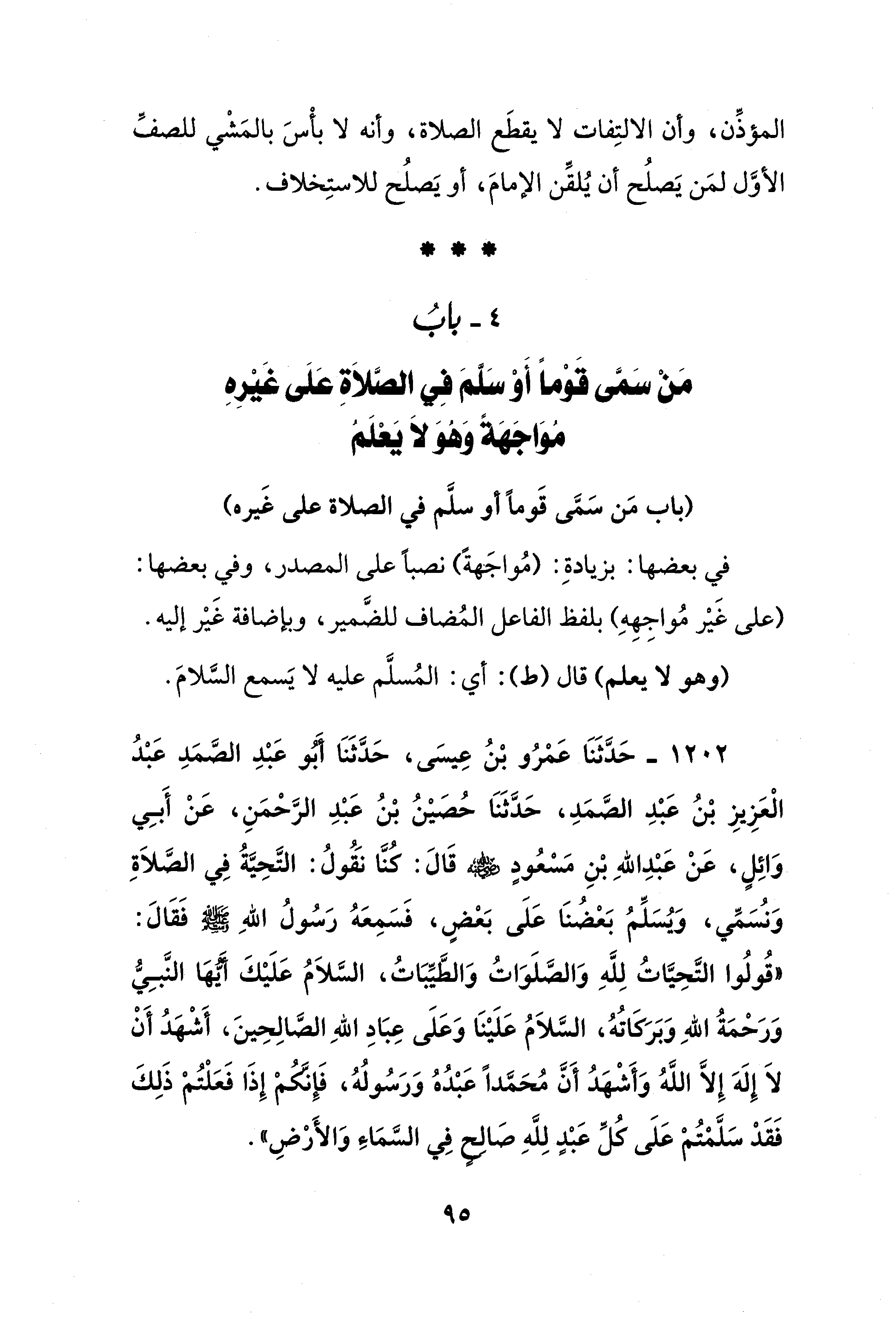 4 - بابُ مَنْ سَمَّى قَوْمًا أَوْ سَلَّمَ فِي الصَّلَاةِ عَلَى غَيْرِهِ مُوَاجَهَةً وَهُوَ لَا يَعْلَمُ