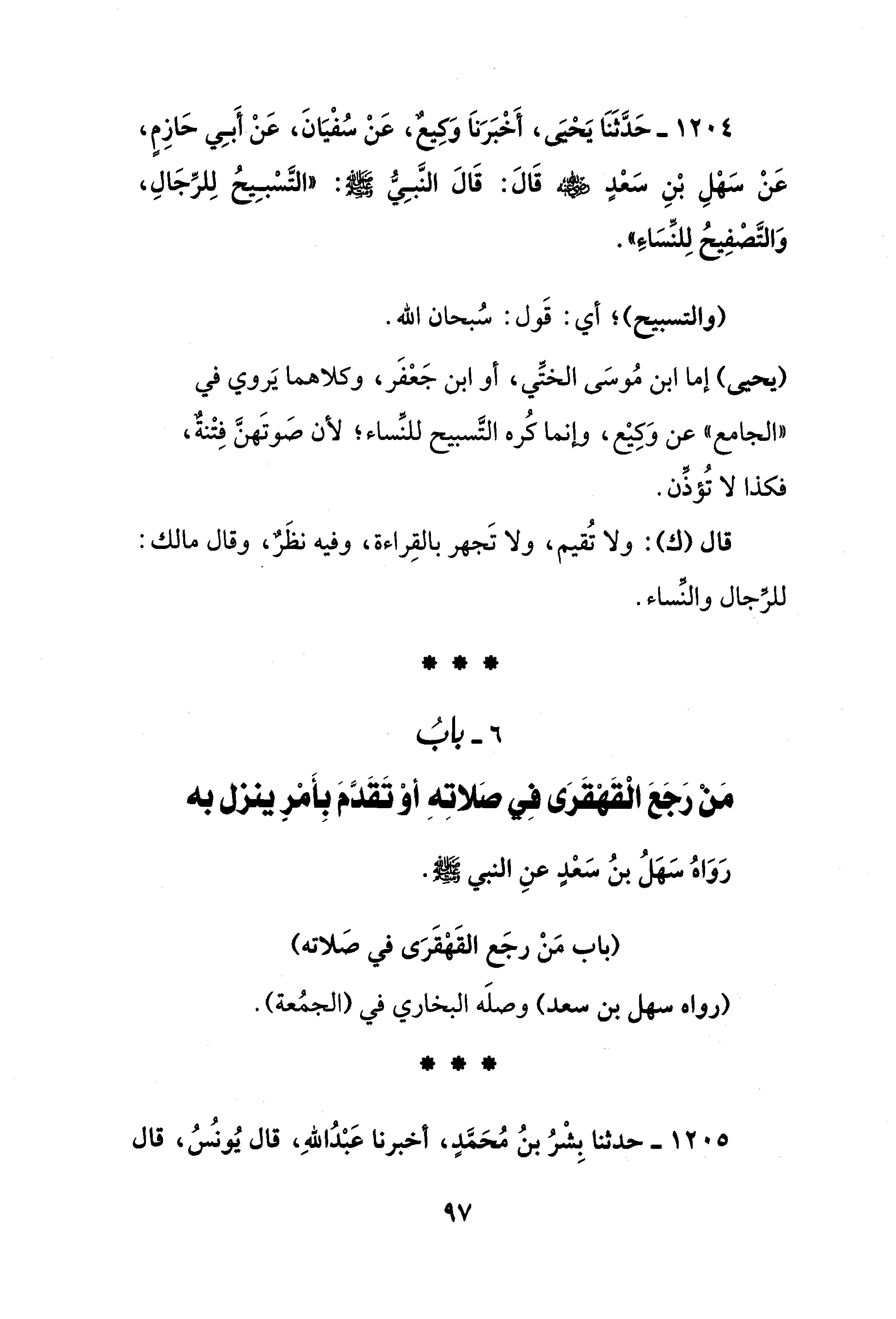 1204 - حَدَّثَنَا يَحْيَى، أَخْبَرَنَا وَكِيعٌ، عَنْ سُفْيَانَ، عَنْ أَبِي حَازِمٍ، عَنْ سَهْلِ بْنِ سَعْدٍ - رضي الله عنه - قَالَ: قَالَ النَّبِي - صلى الله عليه وسلم -: "التَّسْبِيحُ لِلرِّجَالِ، وَالتَّصْفِيحُ لِلنِّسَاءَ".