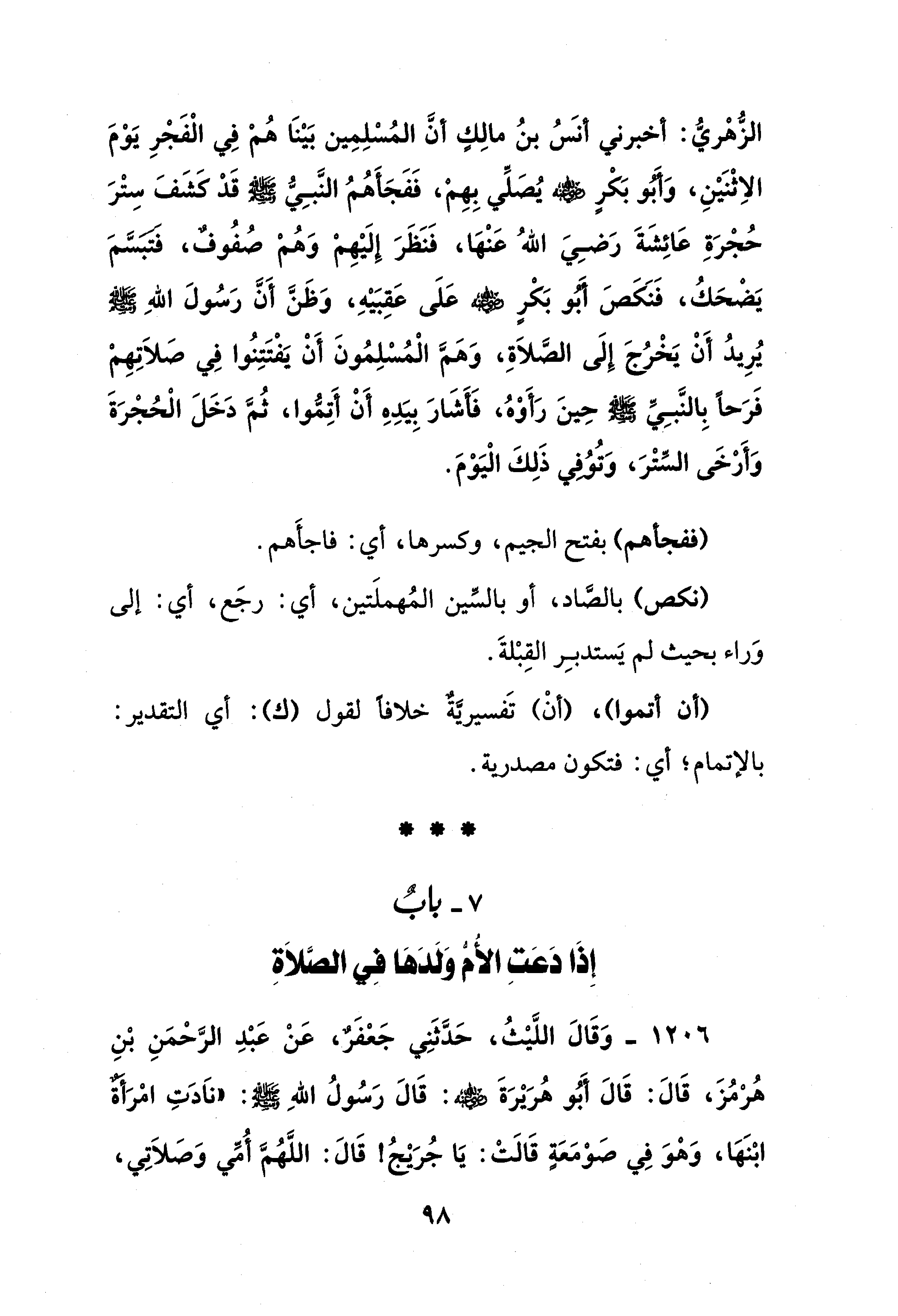 الزُّهْريُّ: أخبرني أنسُ بنُ مالِكٍ أنَّ المُسْلِمِين بَيْنَا هُمْ في الْفَجْرِ يَوْمَ الاِثْنَينِ، وَأَبُو بَكْرٍ - رضي الله عنه - يُصَلِّي بِهِمْ، فَفَجَأَهُمُ النَّبِيُّ - صلى الله عليه وسلم - قَدْ كَشَفَ سِتْرَ حُجْرَةِ عَائِشَةَ رَضِيَ اللهُ عَنْهَا، فَنَظَرَ إِلَيْهِمْ وَهُمْ صُفُوفٌ، فتبسَّمَ يَضْحَكُ، فَنَكَصَ أَبُو بَكْرٍ - رضي الله عنه - عَلَى عَقِبَيْهِ، وَظَنَّ أَنَّ رَسُولَ اللهِ - صلى الله عليه وسلم - يُرِيدُ أَنْ يَخْرُجَ إلَى الصَّلَاةِ، وَهَمَّ الْمُسْلِمُونَ أَنْ يَفْتَتِنُوا في صَلَاتِهِمْ فَرَحًا بِالنَّبِيِّ - صلى الله عليه وسلم - حِينَ رَأَوْهُ، فأَشَارَ بِيَدِهِ أَنْ أَتِمُّوا، ثُمَّ دَخَلَ الْحُجْرَةَ وَأَرْخَى السِّتْرَ، وَتُوُفِي ذَلِكَ الْيَوْمَ.