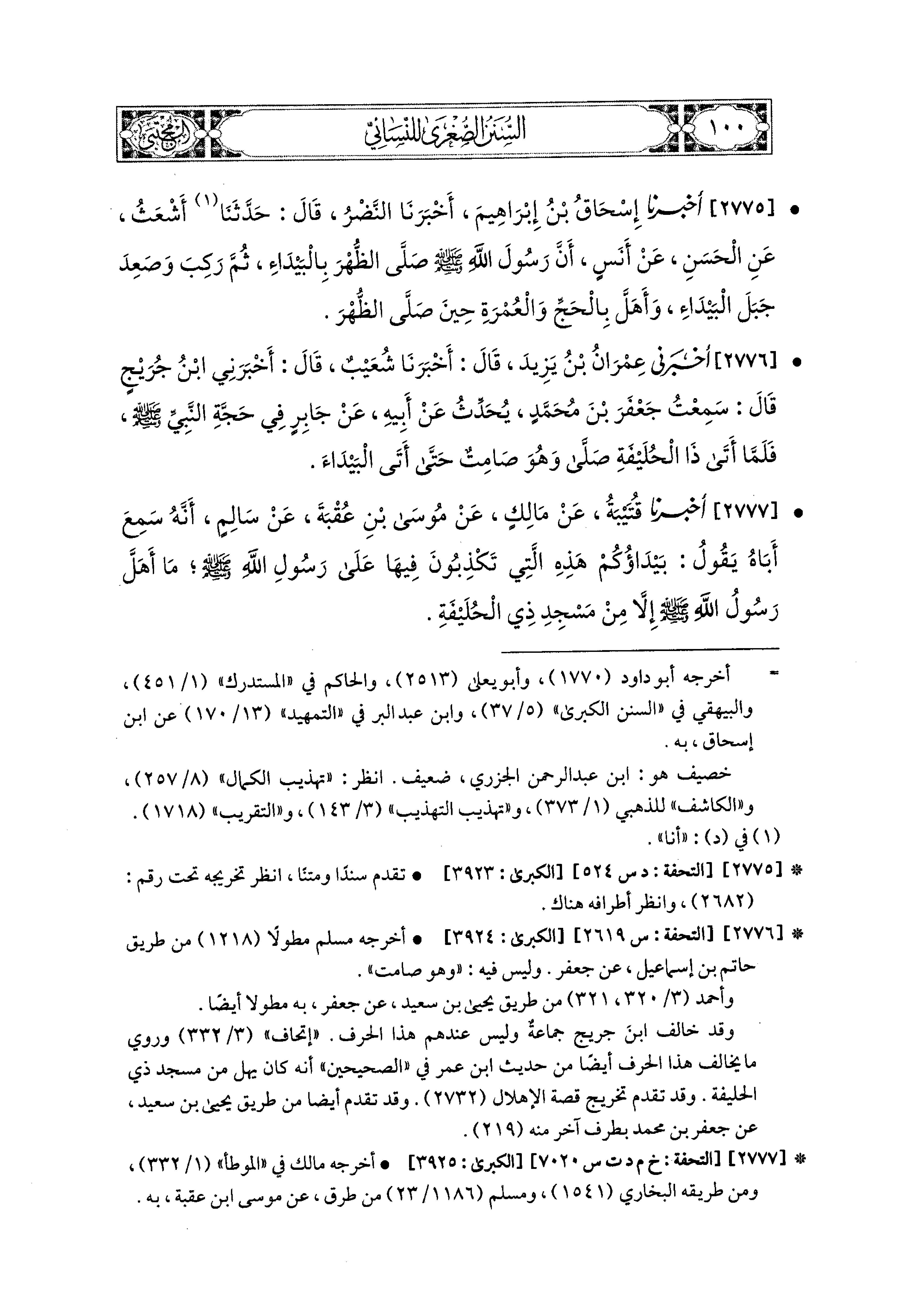 2776 - أَخبَرني عِمْرَانُ بْنُ يَزِيدَ، قَالَ: أَخبَرنا شُعَيبٌ، قَالَ: أَخبَرني ابنُ جُرَيْجٍ، قَالَ: سَمِعْتُ جَعْفَرَ بْنَ مُحَمدٍ يُحَدِّثُ، عَن أَبيهِ، عَن جَابِرٍ فِي حَجَّةِ النَّبيِّ صَلى الله عَليه وسَلم، فَلَمَّا أَتَى ذَا الحُلَيْفَةِ، صَلَّى وَهُوَ صَامِتٌ حَتَّى أَتَى البَيْدَاءَ.