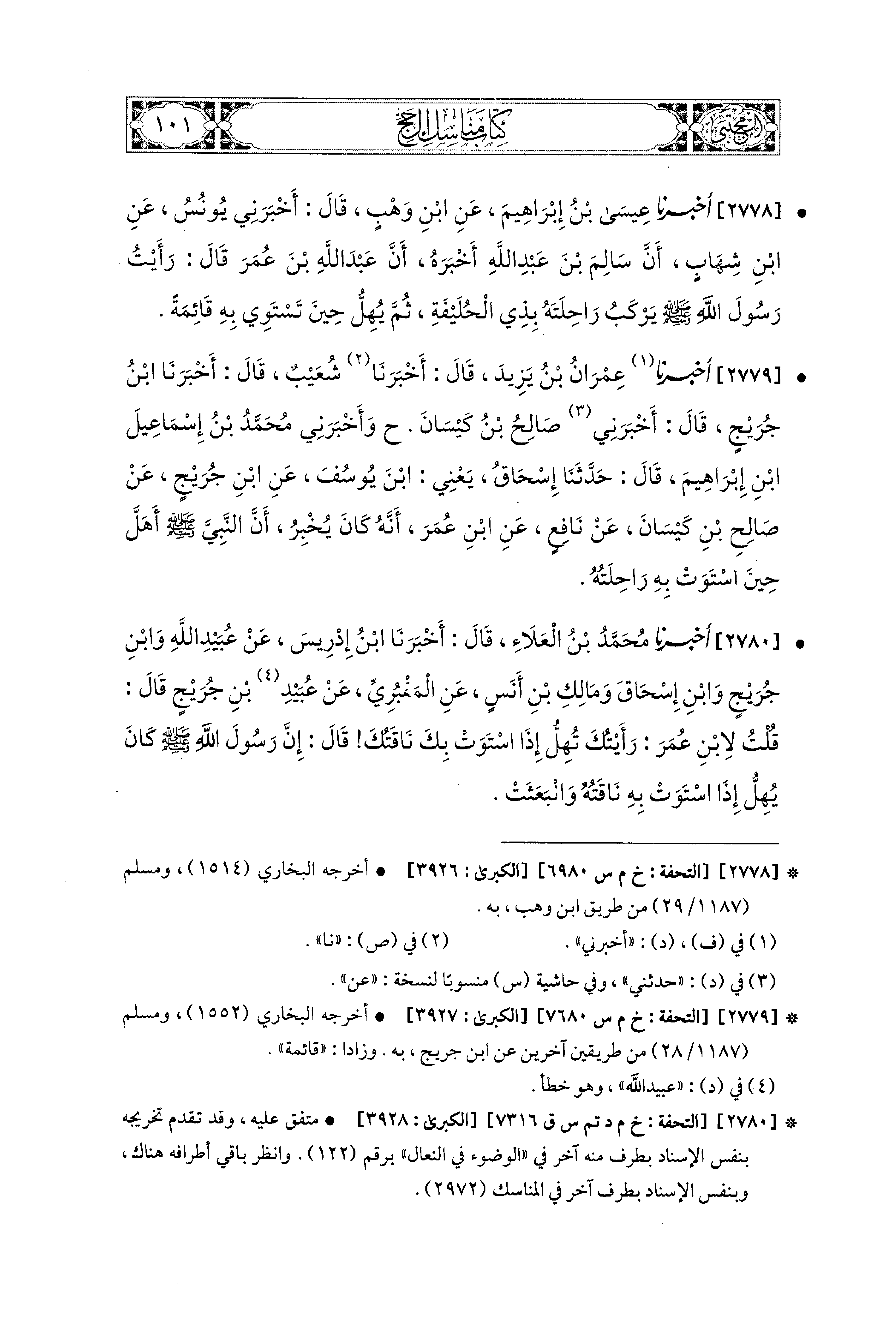 2779 - أَخبَرَنا عِمْرَانُ بْنُ يَزِيدَ، قَالَ: أَخبَرنا شُعَيبٌ، قَالَ: أَخبَرنا ابنُ جُرَيْجٍ، قَالَ: أَخبَرني صَالِحُ بْنُ كَيْسَانَ (ح) وَأَخبَرني مُحَمدُ بْنُ إِسماعِيلَ بْنِ إِبراهِيمَ، قال: حَدثنا إِسحَاقُ، يَعْني ابنَ يُوسُفَ، عَنِ ابنِ جُرَيْجٍ، عَن صَالِحِ بْنِ كَيْسَانَ، عَن نَافِعٍ، عَنِ ابنِ عُمَرَ أَنَّهُ كَانَ يُخْبِرُ، أَنَّ النَّبيَّ صَلى الله عَليه وسَلم أَهَلَّ حِينَ اسْتَوَتْ بِهِ رَاحِلَتُهُ.
