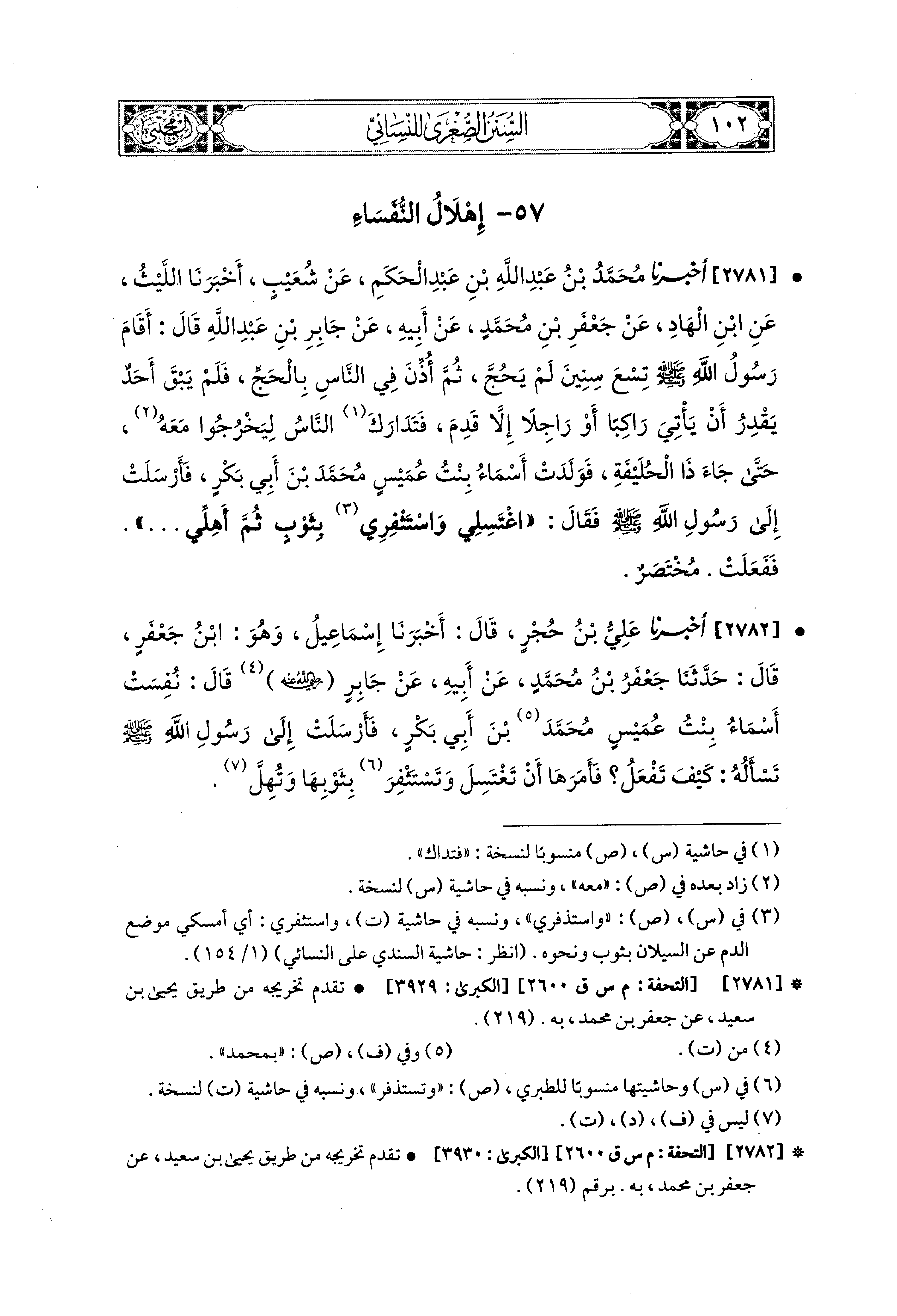 2782 - أَخبَرَنا عَلِيُّ بْنُ حُجْرٍ، قَالَ: أَخبَرنا إِسماعِيلُ، وَهُوَ ابنُ جَعْفَرٍ، قال: حَدثنا جَعْفَرُ بْنُ مُحَمدٍ، عَن أَبيهِ، عَن جَابِرٍ رَضِيَ اللهُ عَنهُ، قَالَ: نَفَسَتْ أَسْمَاءُ بِنْتُ عُمَيْسٍ مُحَمدَ بْنَ أَبي بَكْرٍ، فَأَرْسَلَتْ إِلَى رَسُولِ اللهِ صَلى الله عَليه وسَلم، تَسْأَلُهُ كَيْفَ تَفْعَلُ؟ فَأَمَرَهَا أَنْ تَغْتَسِلَ، وَتَسْتَثْفِرَ بِثَوْبِهَا، وَتُهِلَّ.