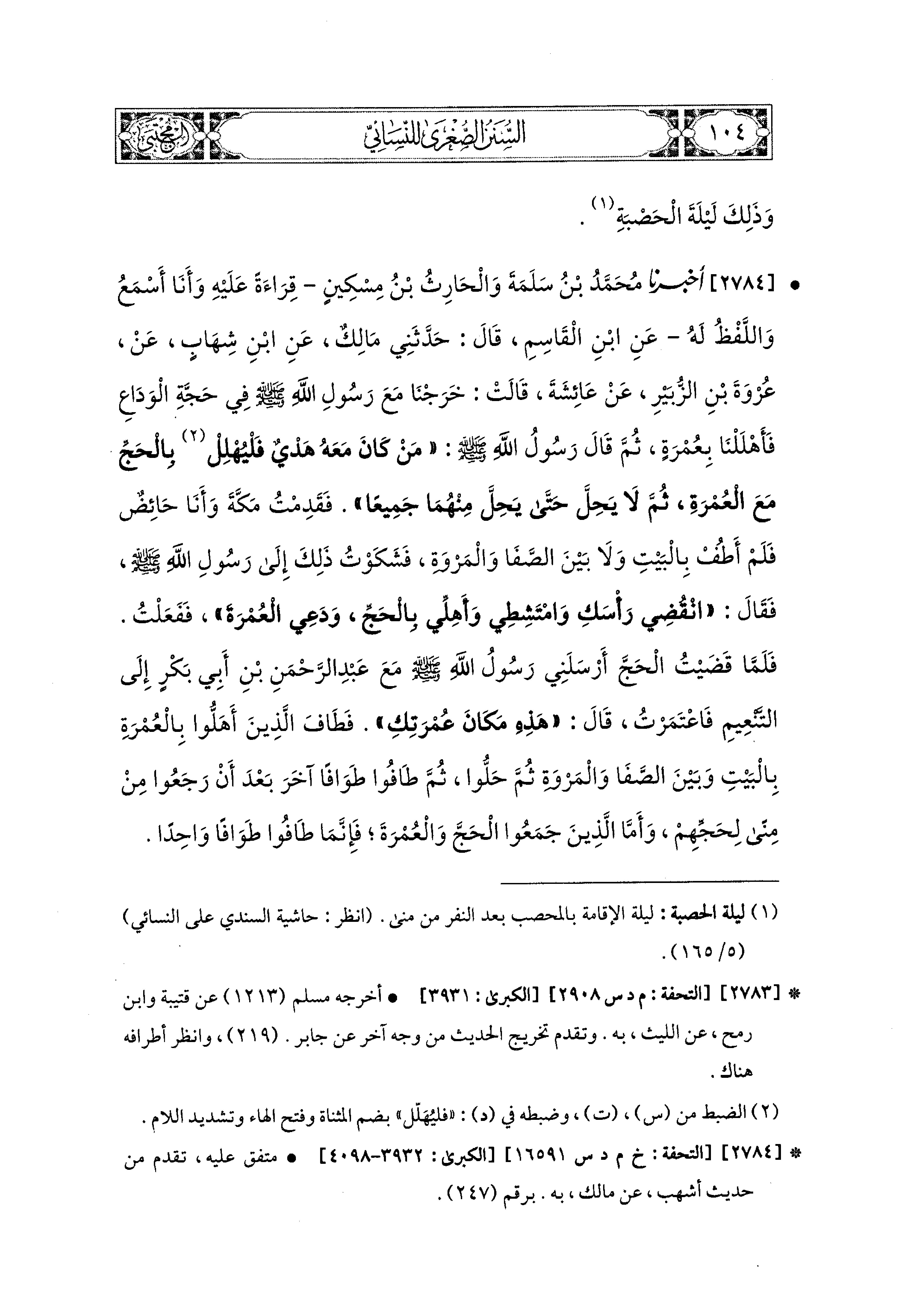 2784 - أَخبَرَنا مُحَمد بْنُ سَلَمَةَ، وَالحَارِثُ بْنُ مِسكينٍ، قِرَاءَةً عَلَيهِ وَأَنَا أَسْمَعُ، وَاللَّفْظُ لَهُ، عَنِ ابنِ القَاسِمِ، قَالَ: حَدَّثَني مَالِكٌ، عَنِ ابنِ شِهَابٍ، عَن عُرْوَةَ بْنِ الزُّبَيْرِ، عَن عَائِشَةَ، قَالَتْ: خَرَجْنَا مَعَ رَسُولِ اللهِ صَلى الله عَليه وسَلم فِي حَجَّةِ الوَدَاعِ، فَأَهْلَلْنَا بِعُمْرَةٍ، ثُمَّ قَالَ رَسُولُ اللهِ صَلى الله عَليه وسَلم: مَنْ كَانَ مَعَهُ هَدْيٌ، فَلْيُهْلِلْ بِالحَجِّ مَعَ العُمْرَةِ ثُمَّ لاَ يَحِلُّ، حَتَّى يَحِلَّ مِنْهُمَا جَميعًا، فَقَدِمْتُ مَكَّةَ وَأَنَا حَائِضٌ، فَلَمْ أَطُفْ بِالبَيْتِ، وَلاَ بَيْنَ الصَّفَا وَالمَرْوَةِ، فَشَكَوْتُ ذَلِكَ إِلَى رَسُولِ اللهِ صَلى الله عَليه وسَلم، فَقَالَ: انْقُضِي رَأْسَكِ، وَامْتَشِطِي، وَأَهِلِّي بِالحَجِّ، وَدَعِي العُمْرَةَ، فَفَعَلْتُ، فَلَمَّا قَضَيْتُ الحَجَّ، أَرْسَلَني رَسُولُ اللهِ صَلى الله عَليه وسَلم مَعَ عَبدِ الرَّحمَنِ بْنِ أَبي بَكْرٍ إِلَى التَّنْعِيمِ، فَاعْتَمَرْتُ، قَالَ: هَذِهِ مَكَانُ عُمْرَتِكِ، فَطَافَ الَّذِينَ أَهَلُّوا بِالعُمْرَةِ بِالبَيْتِ، وَبَيْنَ الصَّفَا وَالمَرْوَةِ، ثُمَّ حَلُّوا، ثُمَّ طَافُوا طَوَافًا آخَرَ بَعْدَ أَنْ رَجَعُوا مِنْ مِنًى لِحَجِّهِمْ، وَأَمَّا الَّذِينَ جَمَعُوا الحَجَّ وَالعُمْرَةَ، فَإِنَّمَا طَافُوا طَوَافًا وَاحِدًا.