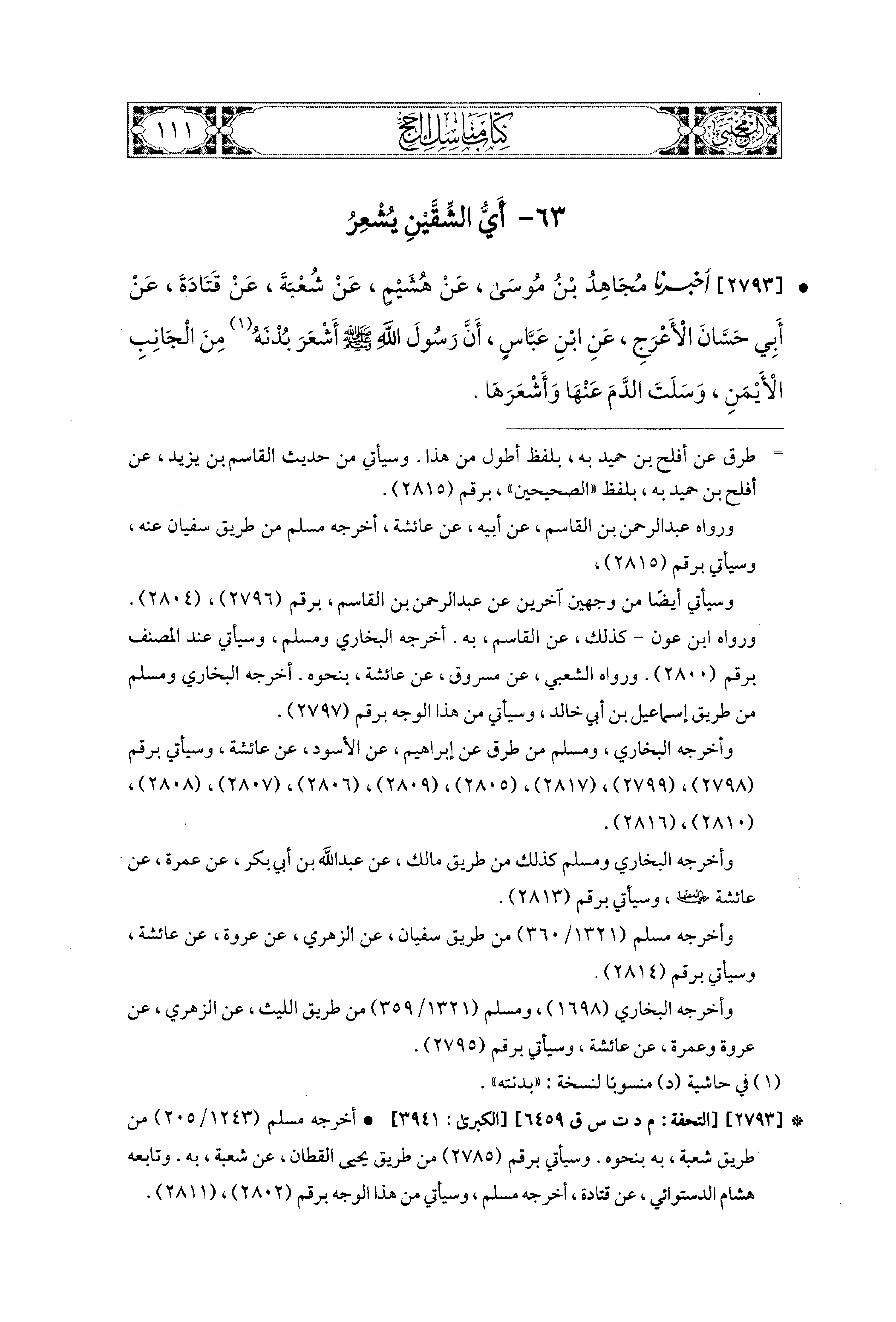 2793 - أَخبَرَنا مُجَاهِدُ بْنُ مُوسَى، عَن هُشَيْمٍ، عَن شُعبَةَ، عَن قَتَادَةَ، عَن أَبي حَسَّانَ الأَعْرَجِ، عَنِ ابنِ عَبَّاسٍ، أَنَّ رَسُولَ اللهِ صَلى الله عَليه وسَلم، أَشْعَرَ بُدْنَهُ مِنَ الجَانِبِ الأَيْمَنِ، وَسَلَتَ الدَّمَ عَنهَا، وَأَشْعَرَهَا.