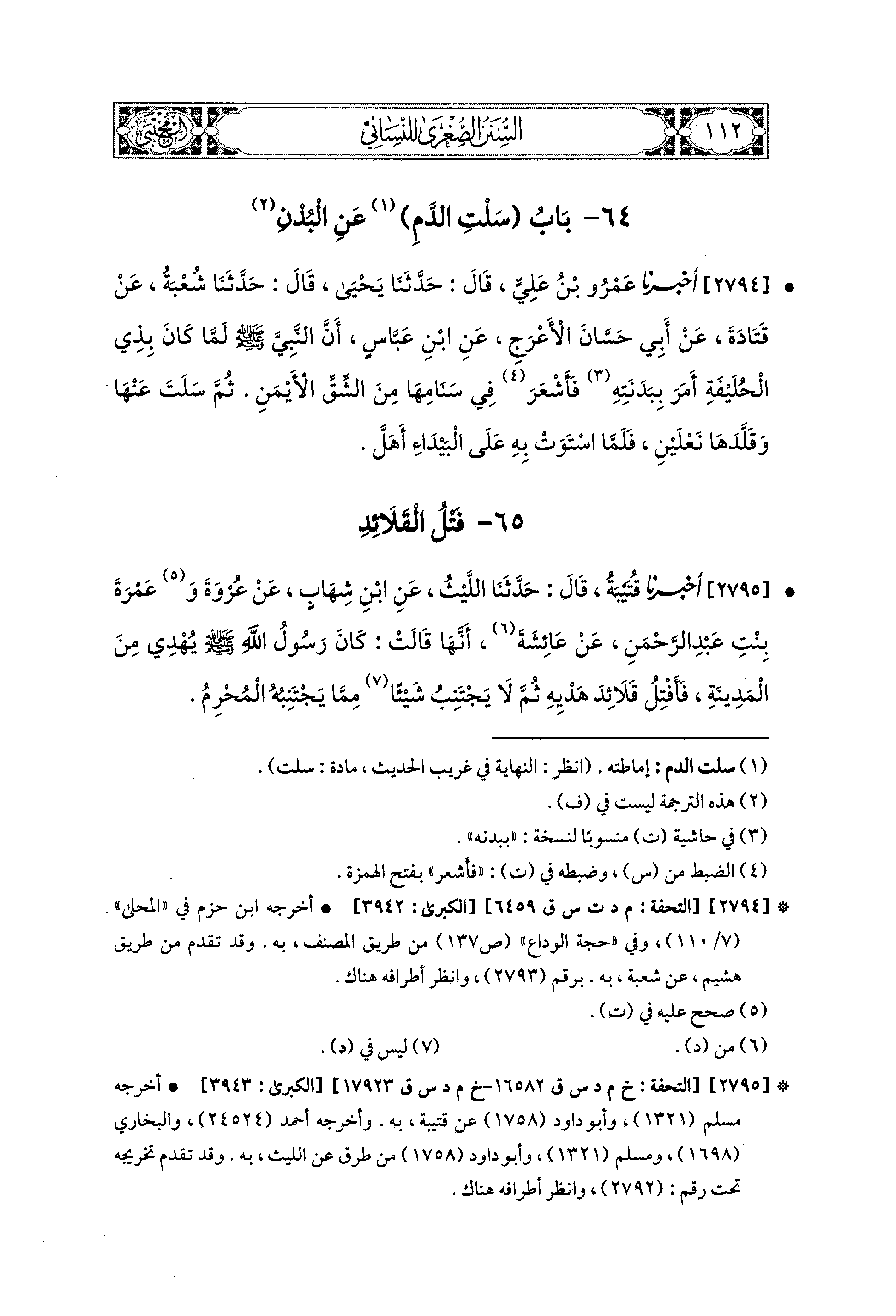 2794 - أَخبَرَنا عَمْرُو بْنُ عَلِيٍّ، قال: حَدثنا يَحيَى، قال: حَدثنا شُعبَةُ، عَن قَتَادَةَ، عَن أَبي حَسَّانَ الأَعْرَجِ، عَنِ ابنِ عَبَّاسٍ، أَنَّ النَّبيَّ صَلى الله عَليه وسَلم لَمَّا كَانَ بِذِي الحُلَيْفَةِ، أَمَرَ بِبَدَنَتِهِ فَأُشْعِرَ فِي سَنَامِهَا مِنَ الشِّقِّ الأَيْمَنِ، ثُمَّ سَلَتَ عَنهَا، وَقَلَّدَهَا نَعْلَيْنِ فَلَمَّا اسْتَوَتْ بِهِ عَلَى البَيْدَاءِ أَهَلَّ.
