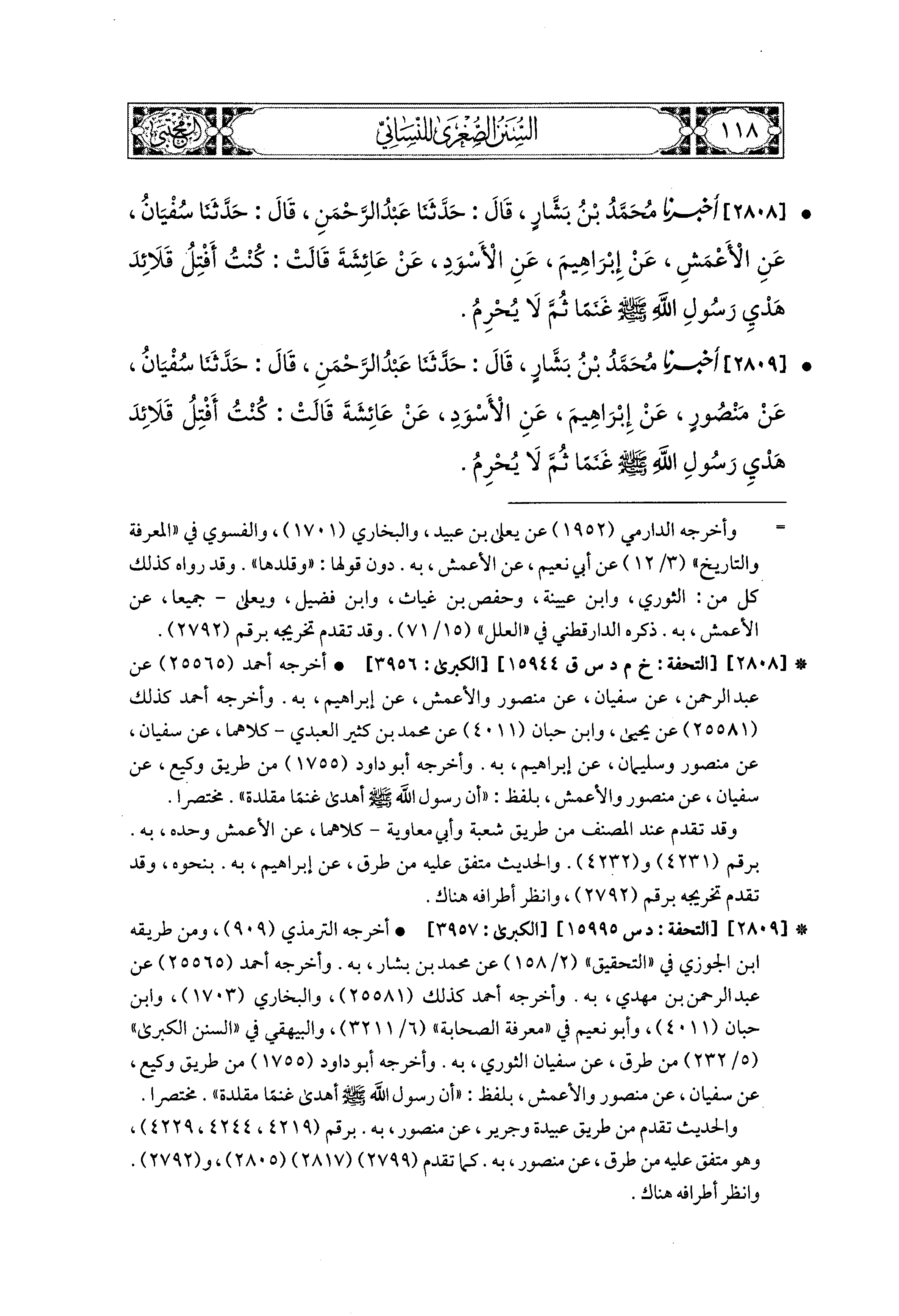 2809 - أَخبَرَنا مُحَمد بْنُ بَشَّارٍ، قال: حَدثنا عَبدُ الرَّحمَنِ، قال: حَدثنا سُفيَانُ، عَن مَنْصُورٍ، عَن إِبراهِيمَ، عَنِ الأَسْوَدِ، عَن عَائِشَةَ، قَالَتْ: كُنْتُ أَفْتِلُ قَلاَئِدَ هَدْيِ رَسُولِ اللهِ صَلى الله عَليه وسَلم غَنَمًا، ثُمَّ لاَ يُحْرِمُ.