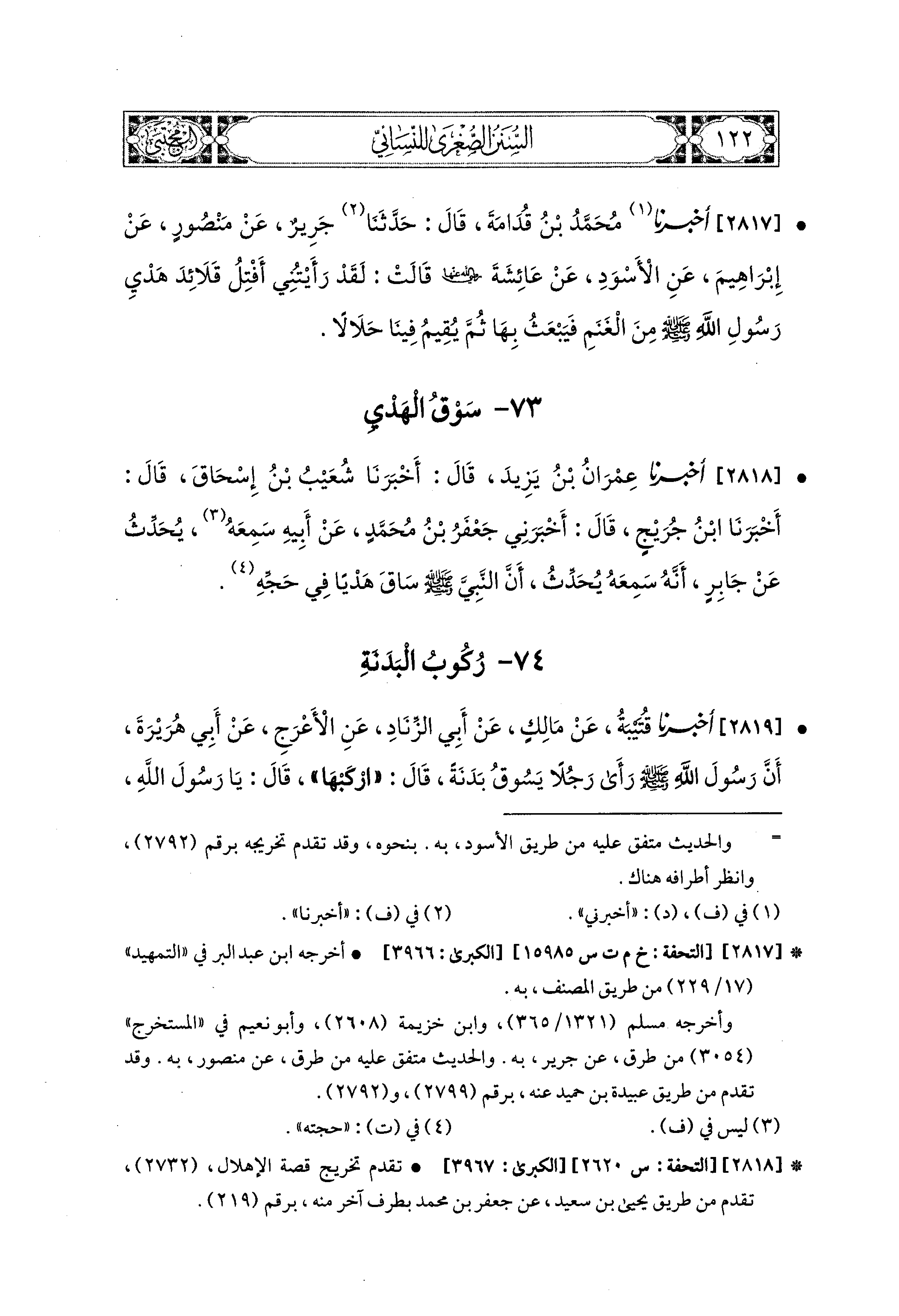2819 - أَخبَرَنا قُتَيبَةُ، عَن مَالِكٍ، عَن أَبي الزِّنَادِ، عَنِ الأَعْرَجِ، عَن أَبي هُرَيرَةَ أَنَّ رَسُولَ اللهِ صَلى الله عَليه وسَلم، رَأَى رَجُلاً يَسُوقُ بَدَنَةً، قَالَ: ارْكَبْهَا، قَالَ: يَا رَسُولَ اللهِ، إِنَّهَا بَدَنَةٌ، قَالَ: ارْكَبْهَا، وَيْلَكَ فِي الثَّانيَةِ، أَوْ فِي الثَّالِثَةِ.
