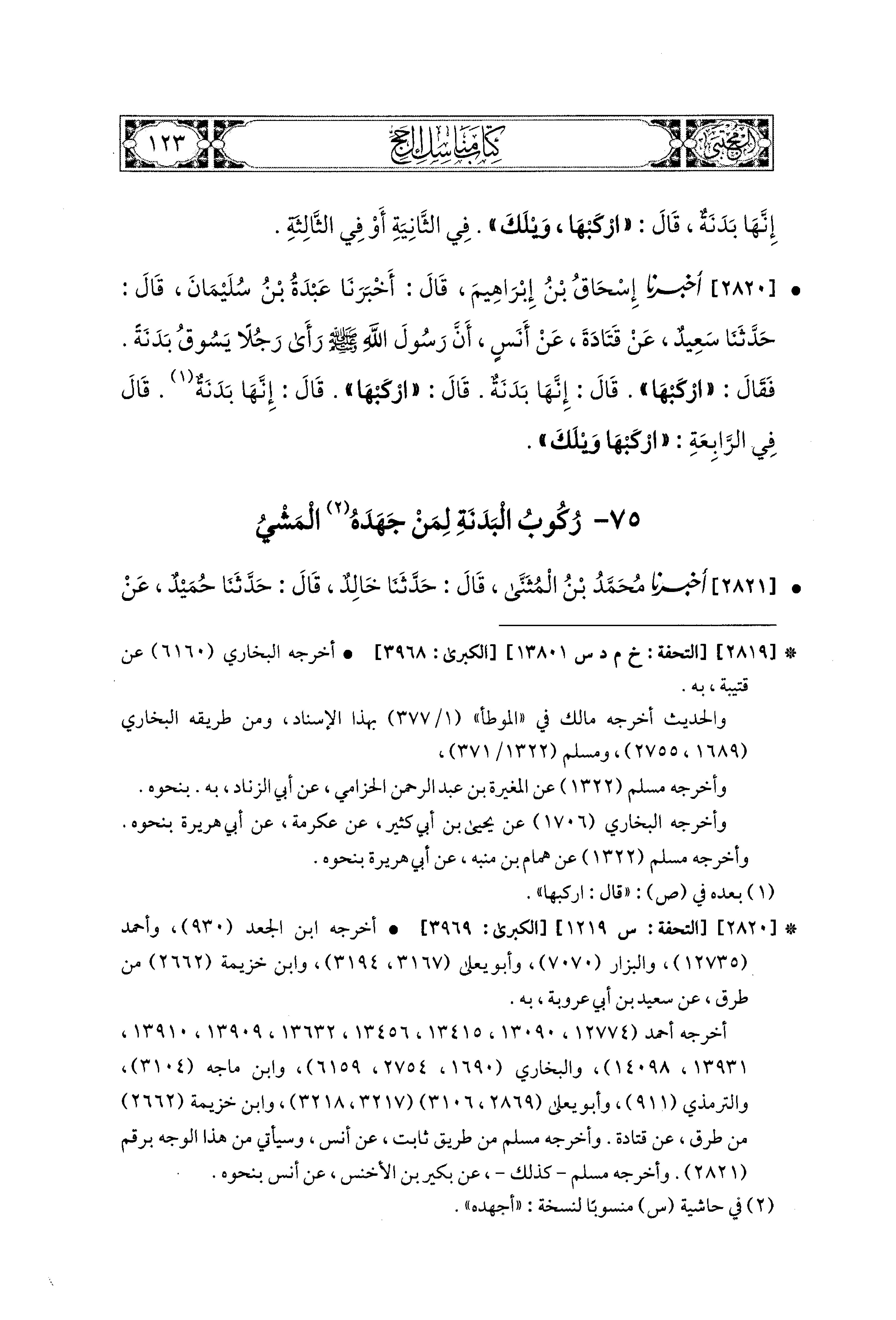 2821 - أَخبَرَنا مُحَمد بْنُ المُثَنَّى، قال: حَدثنا خَالِدٌ، قال: حَدثنا حُمَيدٌ، عَن ثَابِتٍ، عَن أَنَسٍ، أَنَّ النَّبيَّ صَلى الله عَليه وسَلم رَأَى رَجُلاً يَسُوقُ بَدَنَةً، وَقَدْ جَهَدَهُ المَشْيُ، قَالَ: ارْكَبْهَا، قَالَ: إِنَّهَا بَدَنَةٌ، قَالَ: ارْكَبْهَا، وَإِنْ كَانَتْ بَدَنَةً.