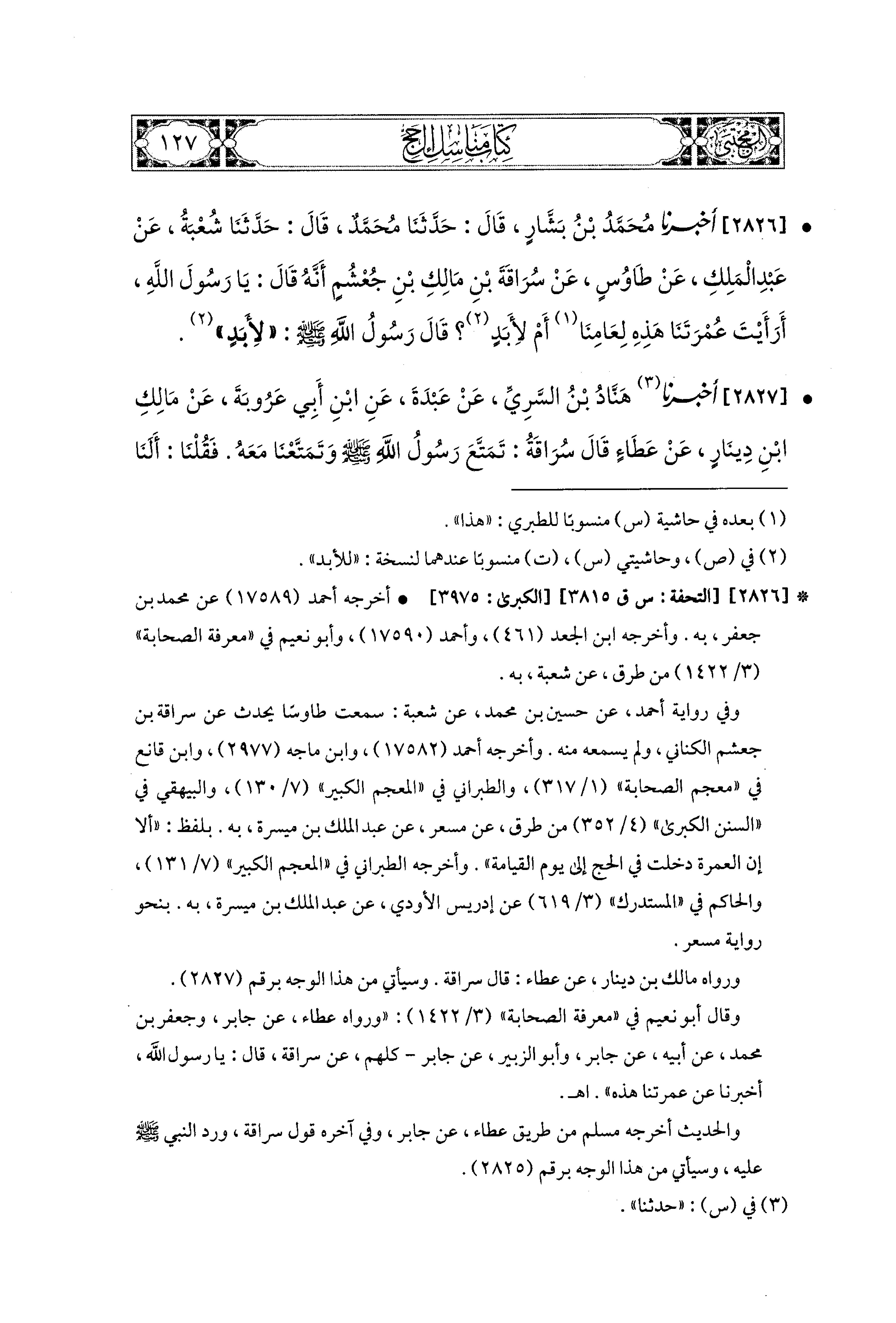 2827 - أَخبَرَنا هَنَّادُ بْنُ السَّرِيِّ، عَن عَبدَةَ، عَنِ ابنِ أَبي عَرُوبَةَ، عَن مَالِكِ بْنِ دِينَارٍ، عَن عَطَاءٍ، قَالَ سُرَاقَةُ: تَمَتَّعَ رَسُولُ اللهِ صَلى الله عَليه وسَلم، وَتَمَتَّعْنَا مَعَهُ، فَقُلْنَا: أَلَنَا خَاصَّةً أَمْ لأَبَدٍ؟ قَالَ: بَلْ لِلأَبَدِ.