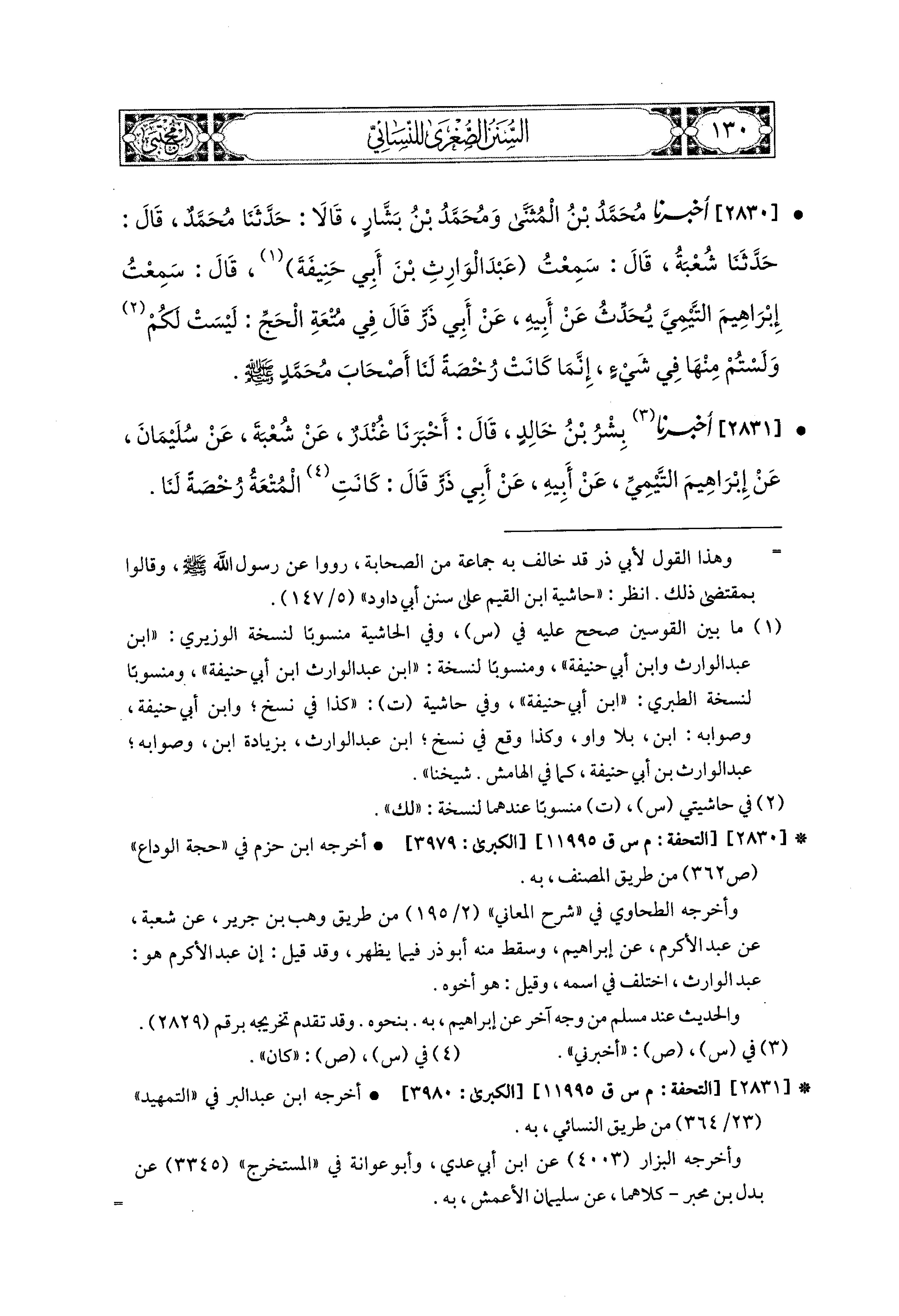 2830 - أَخبَرَنا مُحَمد بْنُ المُثَنَّى، وَمُحَمدُ بْنُ بَشَّارٍ، قَالاَ: حَدَّثَنَا مُحَمدٌ، قال: حَدثنا شُعبَةُ، قَالَ: سَمِعْتُ عَبدَ الوَارِثِ بْنَ أَبي حَنيفَةَ، قَالَ: سَمِعْتُ إِبراهِيمَ التَّيْميَّ، يُحَدِّثُ عَن أَبيهِ، عَن أَبي ذَرٍّ، قَالَ: فِي مُتْعَةِ الحَجِّ لَيْسَتْ لَكُمْ، وَلَسْتُمْ مِنْهَا فِي شَيْءٍ، إِنَّمَا كَانَتْ رُخْصَةً لَنَا، أَصْحَابَ مُحَمدٍ صَلى الله عَليه وسَلم.