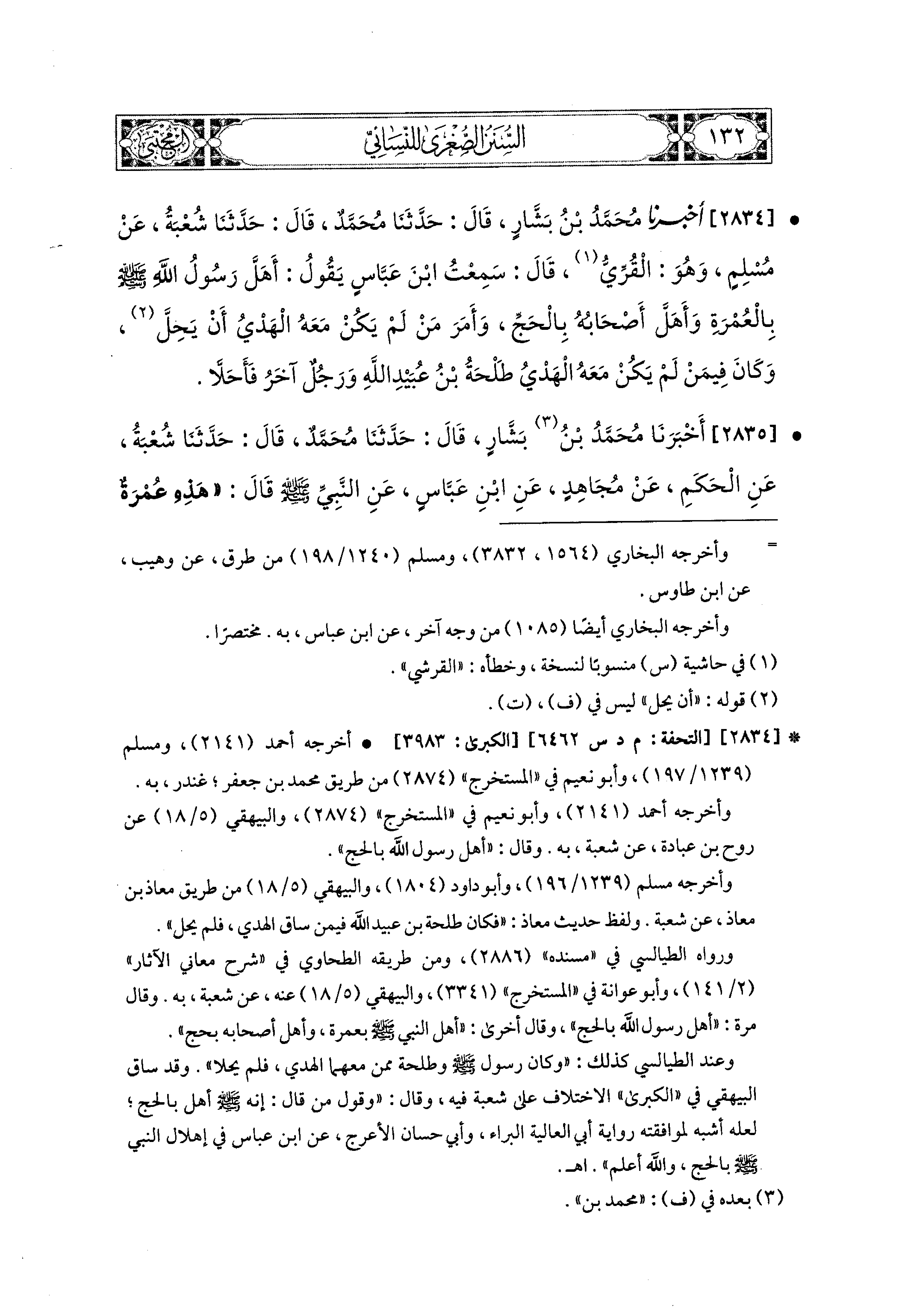 2834 - أَخبَرَنا مُحَمد بْنُ بَشَّارٍ، قال: حَدثنا مُحَمدٌ، قال: حَدثنا شُعبَةُ، عَن مُسْلِمٍ، وَهُوَ القُرِّيُّ، قَالَ: سَمِعْتُ ابنَ عَبَّاسٍ، يَقُولُ: أَهَلَّ رَسُولُ اللهِ صَلى الله عَليه وسَلم بِالعُمْرَةِ، وَأَهَلَّ أَصْحَابُهُ بِالحَجِّ، وَأَمَرَ مَنْ لَمْ يَكُنْ مَعَهُ الهَدْيُ، أَنْ يَحِلَّ، وَكَانَ فِيمَنْ لَمْ يَكُنْ مَعَهُ الهَدْيُ طَلْحَةُ بْنُ عُبَيدِ اللهِ، وَرَجُلٌ آخَرُ فَأَحَلاَّ.