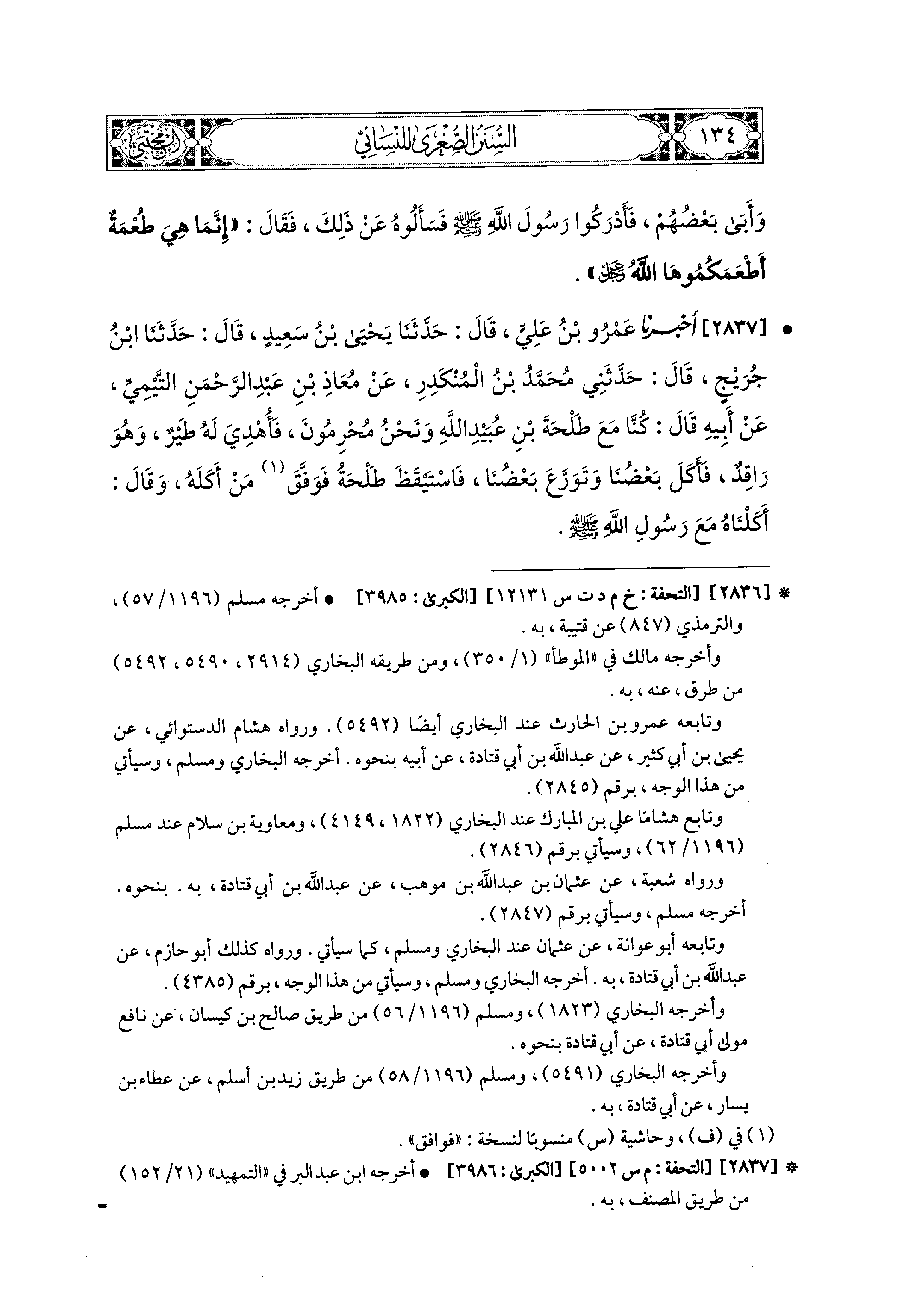 2837 - أَخبَرَنا عَمْرُو بْنُ عَلِيٍّ، قال: حَدثنا يَحيَى بْنُ سَعيدٍ، قال: حَدثنا ابنُ جُرَيْجٍ، قَالَ: حَدَّثَني مُحَمدُ بْنُ المُنْكَدِرِ، عَن مُعَاذِ بْنِ عَبدِ الرَّحمَنِ التَّيْميِّ، عَن أَبيهِ، قَالَ: كُنَّا مَعَ طَلْحَةَ بْنِ عُبَيدِ اللهِ وَنَحْنُ مُحْرِمُونَ، فَأُهْدِيَ لَهُ طَيْرٌ وَهُوَ رَاقِدٌ، فَأَكَلَ بَعْضُنَا، وَتَوَرَّعَ بَعْضُنَا، فَاسْتَيْقَظَ طَلْحَةُ فَوَفَّقَ مَنْ أَكَلَهُ، وَقَالَ: أَكَلْنَاهُ مَعَ رَسُولِ اللهِ صَلى الله عَليه وسَلم.