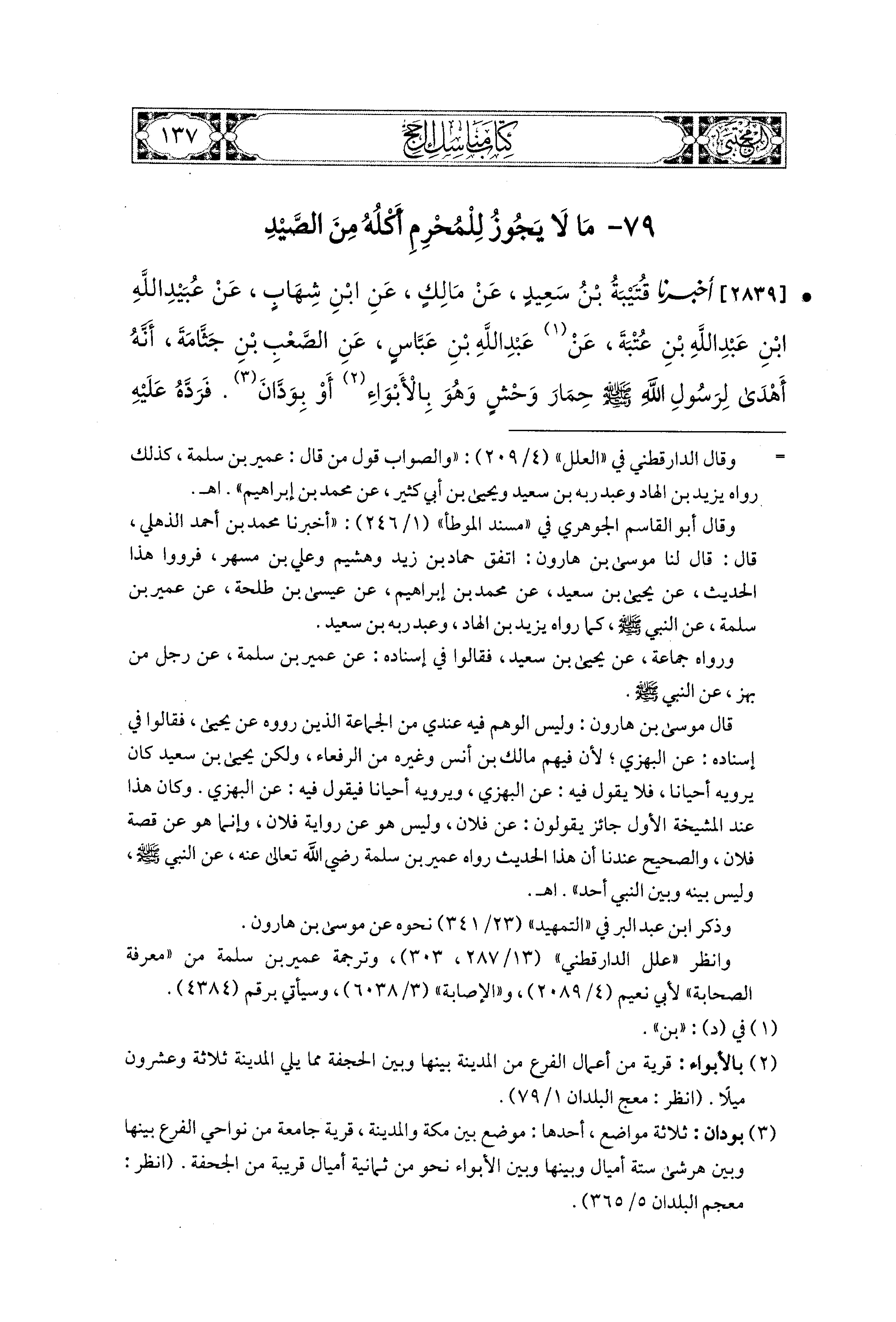 2839 - أَخبَرَنا قُتَيبَةُ بْنُ سَعيدٍ، عَن مَالِكٍ، عَنِ ابنِ شِهَابٍ، عَن عُبَيدِ اللهِ بْنِ عَبدِ اللهِ بْنِ عُتْبَةَ، عَن عَبد اللهِ بن عَبَّاسٍ، عَنِ الصَّعْبِ بْنِ جَثَّامَةَ أَنَّهُ أَهْدَى لِرَسُولِ اللهِ صَلى الله عَليه وسَلم حِمَارَ وَحْشٍ، وَهُوَ بِالأَبْوَاءِ، أَوْ بِوَدَّانَ، فَرَدَّهُ عَلَيهِ رَسُولُ اللهِ صَلى الله عَليه وسَلم، فَلَمَّا رَأَى رَسُولُ اللهِ صَلى الله عَليه وسَلم مَا فِي وَجْهِي؟ قَالَ: أَمَا إِنَّ لَمْ نَرُدَّهُ عَلَيْكَ، إِلاَّ أَنَّا حُرُمٌ.