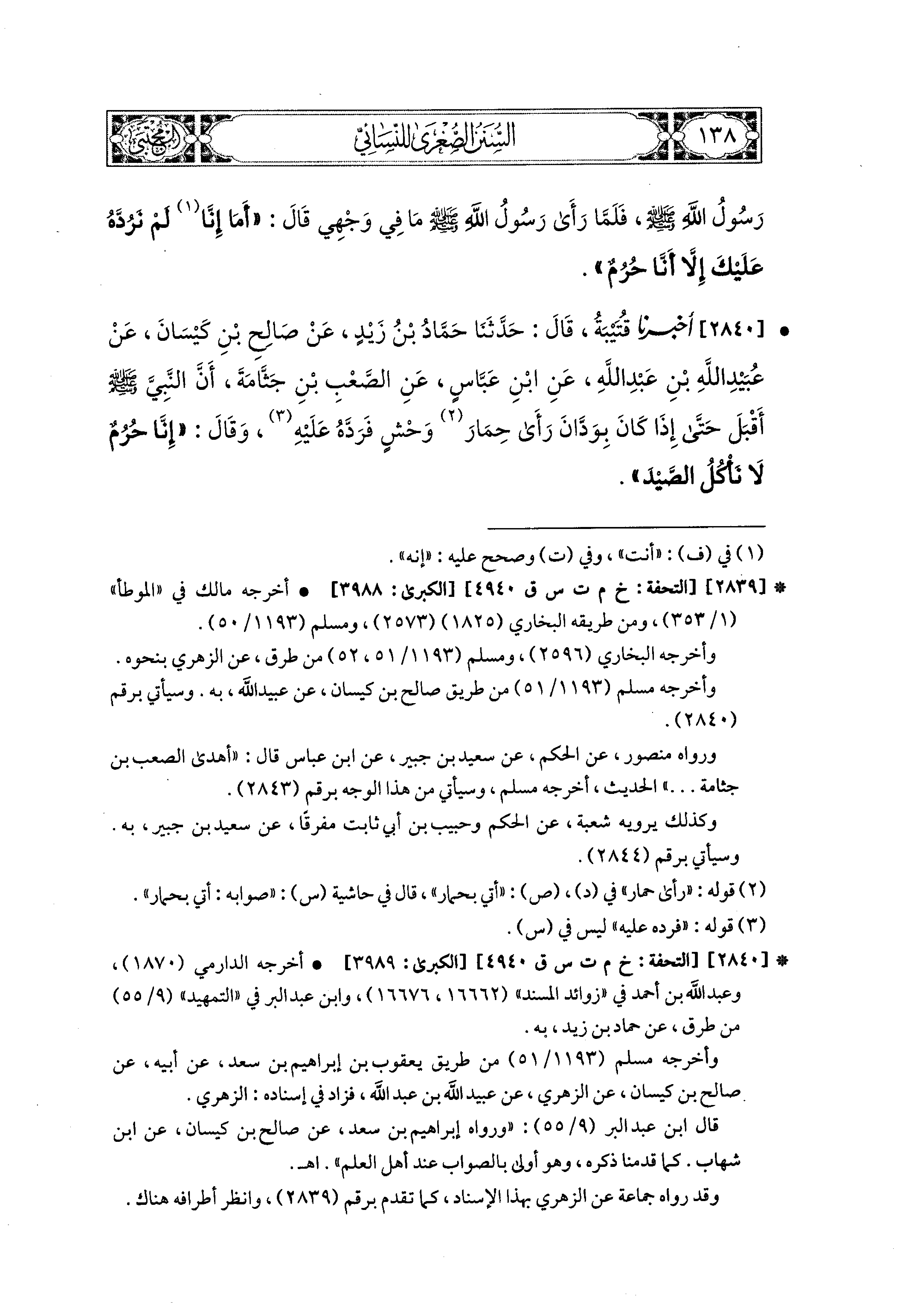 2840 - أَخبَرَنا قُتَيبَةُ، قال: حَدثنا حَمَّادُ بْنُ زَيْدٍ، عَن صَالِحِ بْنِ كَيْسَانَ، عَن عُبَيدِ اللهِ بْنِ عَبدِ اللهِ، عَنِ ابنِ عَبَّاسٍ، عَنِ الصَّعْبِ بْنِ جَثَّامَةَ، أَنَّ النَّبيَّ صَلى الله عَليه وسَلم أَقْبَلَ حَتَّى إِذَا كَانَ بِوَدَّانَ رَأَى حِمَارَ وَحْشٍ فَرَدَّهُ عَلَيهِ، وَقَالَ: إِنَّا حُرُمٌ لاَ نَأْكُلُ الصَّيْدَ.