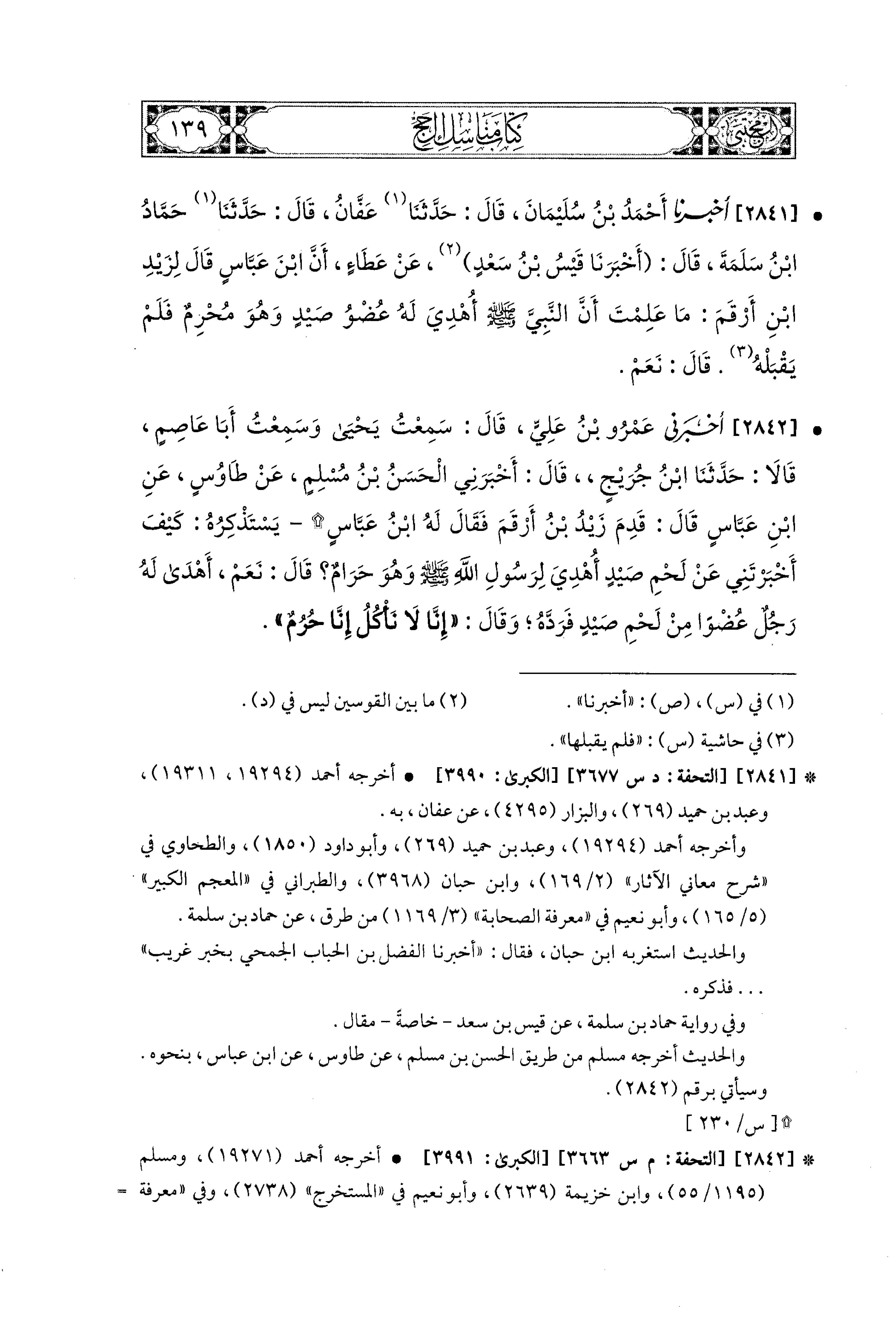 2842 - أَخبَرني عَمْرُو بْنُ عَلِيٍّ، قَالَ: سَمِعْتُ يَحيَى، وَسَمِعْتُ أَبَا عَاصِمٍ، قَالاَ: حَدَّثَنَا ابنُ جُرَيْجٍ، قَالَ: أَخبَرني الحَسَنُ بْنُ مُسْلِمٍ، عَن طَاوُوسٍ، عَنِ ابنِ عَبَّاسٍ، قَالَ: قَدِمَ زَيْدُ بْنُ أَرْقَمَ فَقَالَ لَهُ ابنُ عَبَّاسٍ يَسْتَذْكِرُهُ: كَيْفَ أَخْبَرْتَني عَن لَحْمِ صَيْدٍ أُهْدِيَ لِرَسُولِ اللهِ صَلى الله عَليه وسَلم وَهُوَ حَرَامٌ؟ قَالَ: نَعَمْ، أَهْدَى لَهُ رَجُلٌ عُضْوًا مِنْ لَحْمِ صَيْدٍ فَرَدَّهُ، وَقَالَ: إِنَّا لاَ نَأْكُلُ، إِنَّا حُرُمٌ.