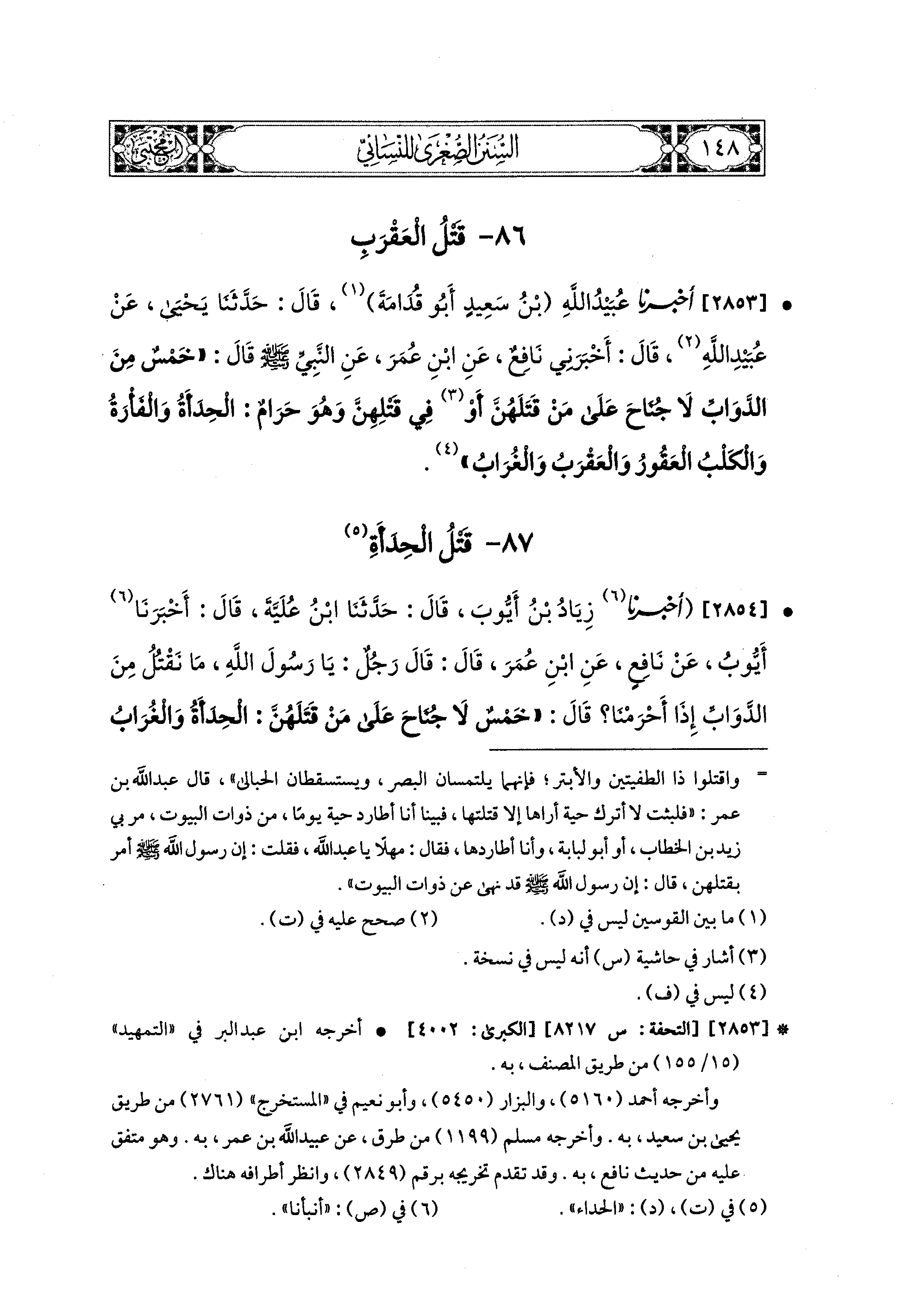 2853 - أَخبَرَنا عُبَيدُ اللهِ بْنُ سَعيدٍ أَبو قُدَامَةَ، قال: حَدثنا يَحيَى، عَن عُبَيدِ اللهِ، قَالَ: أَخبَرني نَافِعٌ، عَنِ ابنِ عُمَرَ، عَنِ النَّبيَّ صَلى الله عَليه وسَلم قَالَ: خَمْسٌ مِنَ الدَّوَابِّ لاَ جُنَاحَ عَلَى مَنْ قَتَلَهُنَّ، أَوْ فِي قَتْلِهِنَّ، وَهُوَ حَرَامٌ: الحِدَأَةُ، وَالفَأْرَةُ، وَالكَلْبُ العَقُورُ، وَالعَقْرَبُ، وَالغُرَابُ.